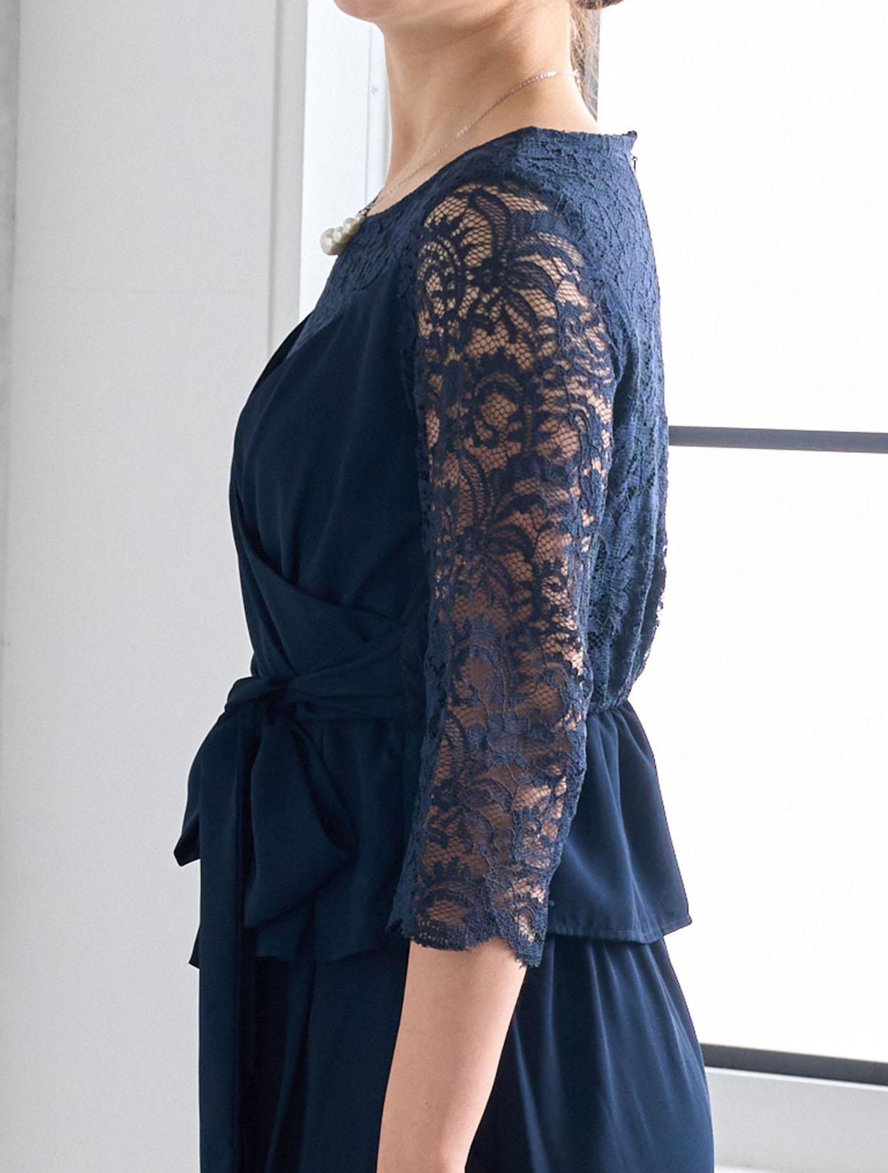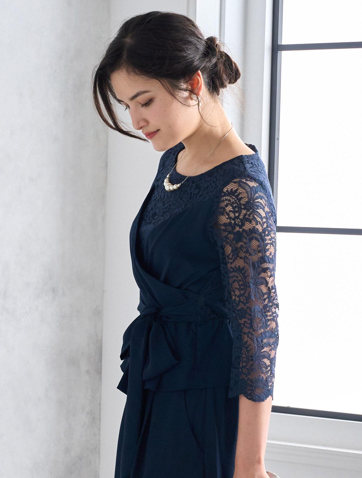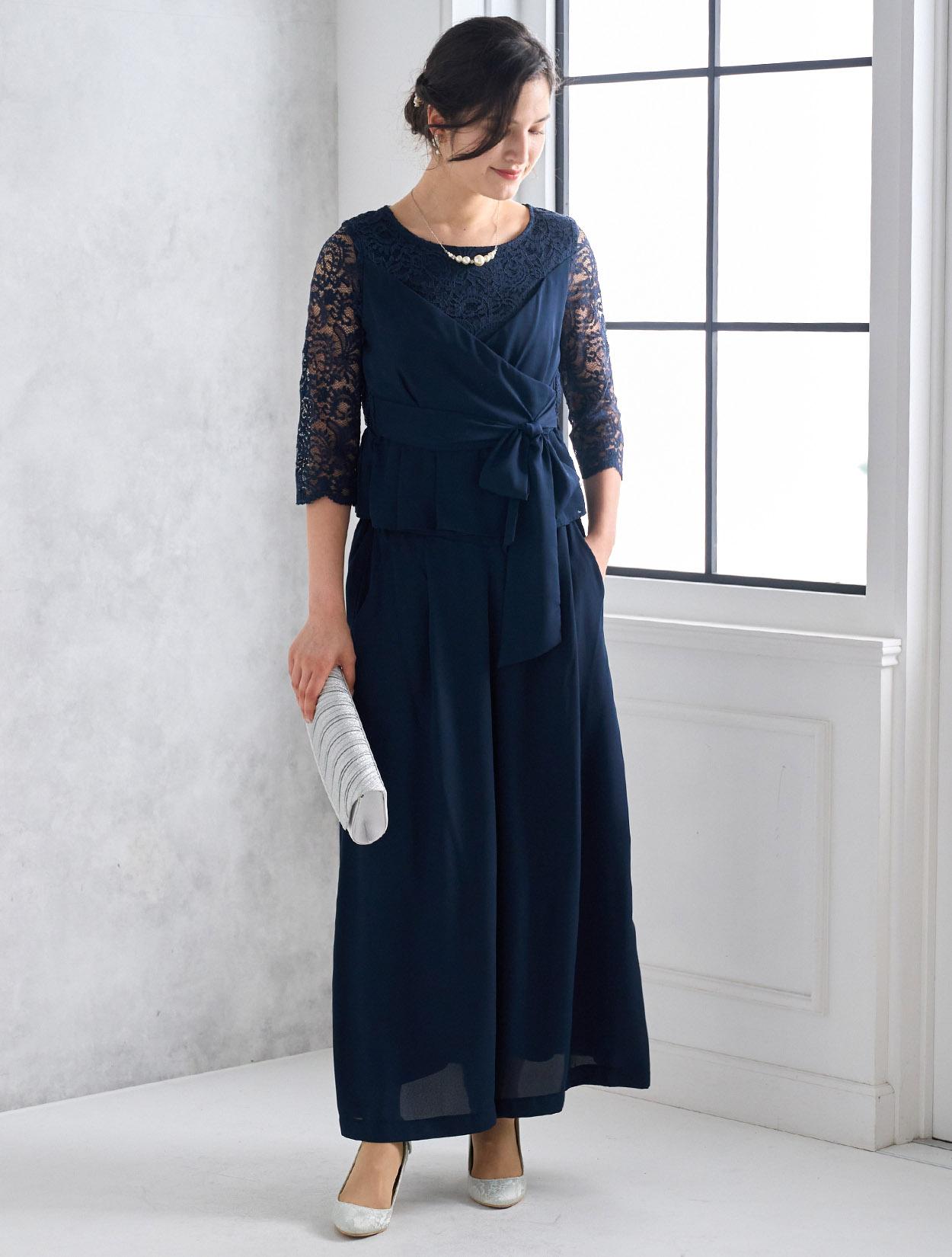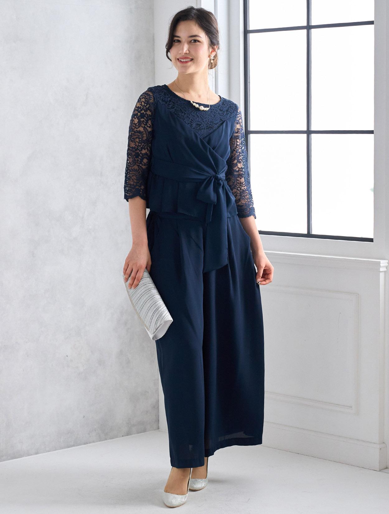 ブラウスとパンツが分かれたセパレートタイプのパンツドレス。上下で共布なのでフォーマル感もあります。ブラウスはカシュクールデザインで、ウエストでキュッと縛るリボンは可愛すぎることなく華やかです。お袖部分はきれいなレースの柄が映えますが、デコルテ部分のレースには裏地が付いているので程よく露出をおさえてくれます。ワイドパンツのボトムスは、一見スカートの様にも見えドレッシーな雰囲気をプラス。脚のラインを拾わないのも嬉しいポイントです。ウエストは背中部分がゴム仕様で締め付け感なく着られます。