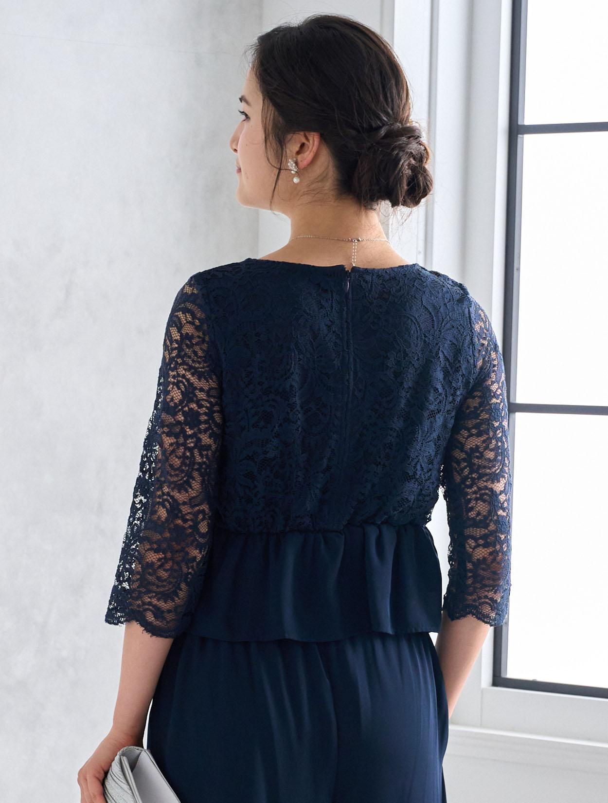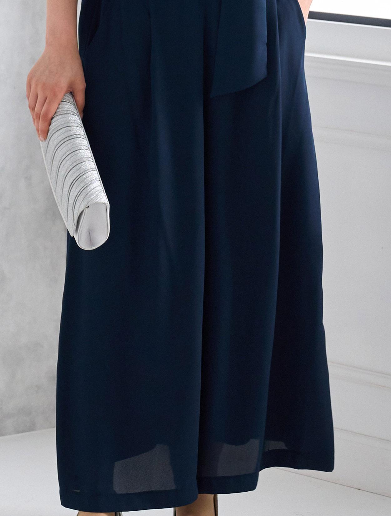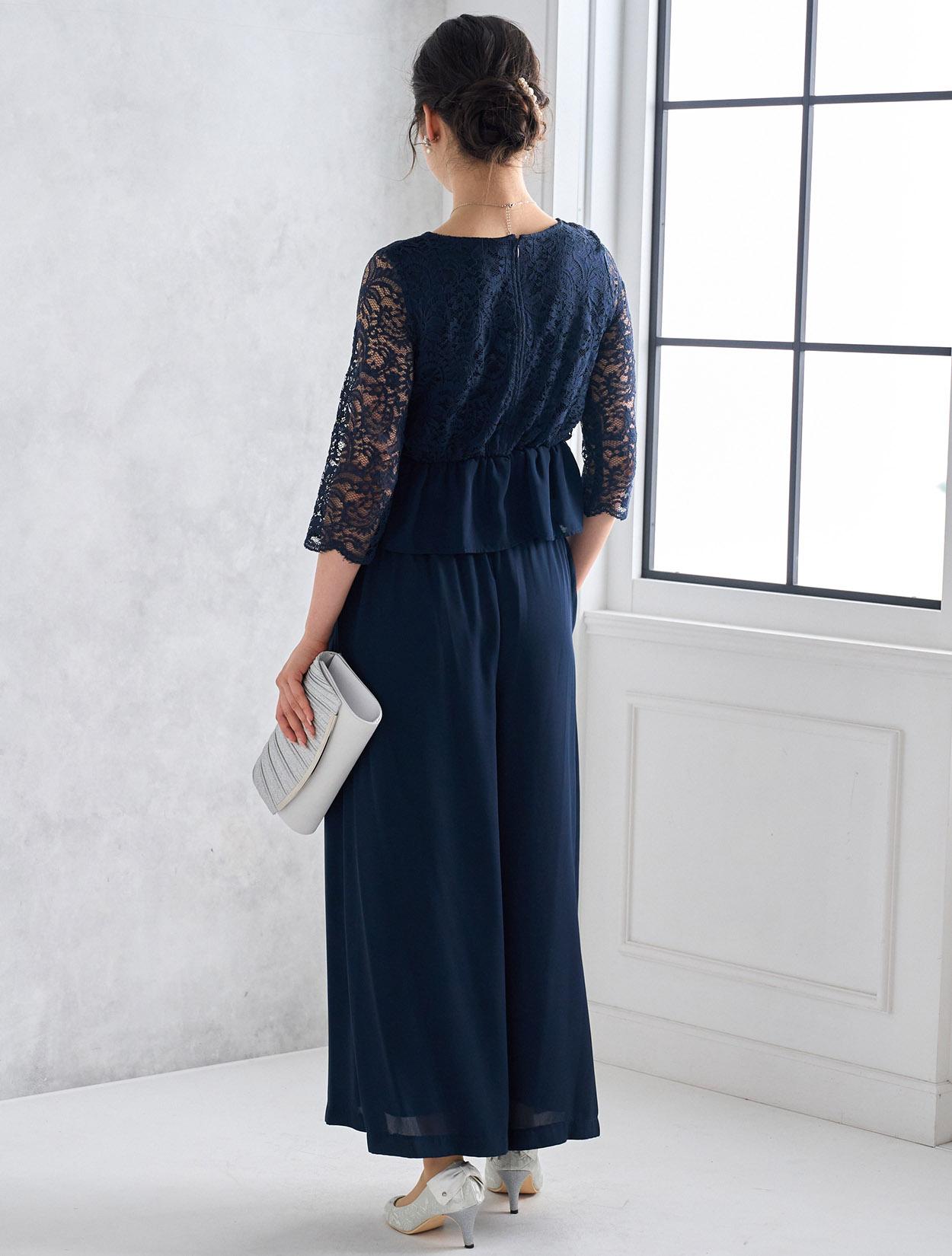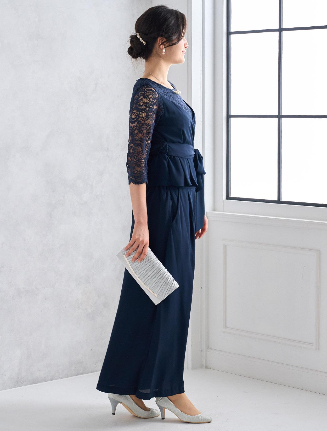 ブラウスとパンツが分かれたセパレートタイプのパンツドレス。上下で共布なのでフォーマル感もあります。ブラウスはカシュクールデザインで、ウエストでキュッと縛るリボンは可愛すぎることなく華やかです。お袖部分はきれいなレースの柄が映えますが、デコルテ部分のレースには裏地が付いているので程よく露出をおさえてくれます。ワイドパンツのボトムスは、一見スカートの様にも見えドレッシーな雰囲気をプラス。脚のラインを拾わないのも嬉しいポイントです。ウエストは背中部分がゴム仕様で締め付け感なく着られます。