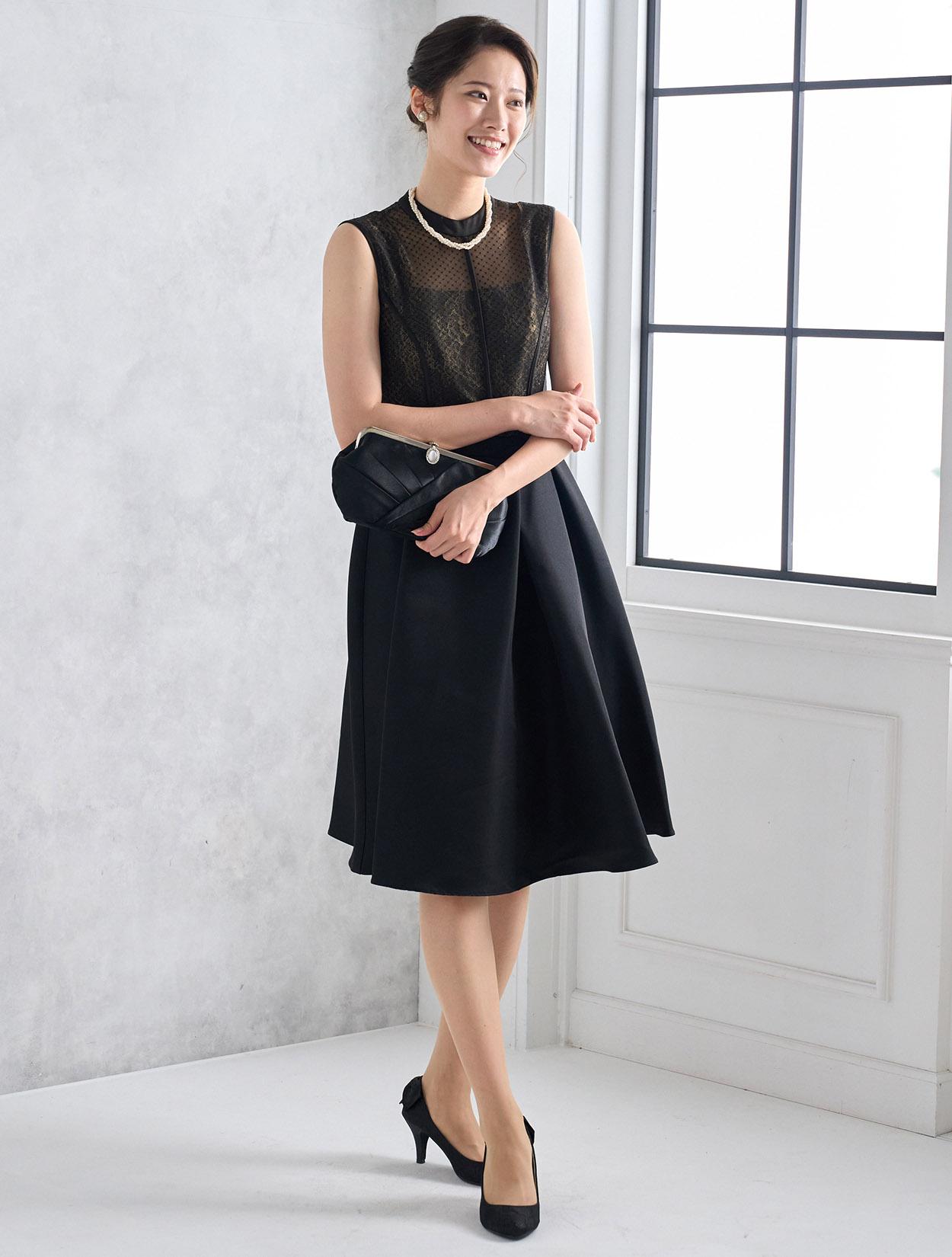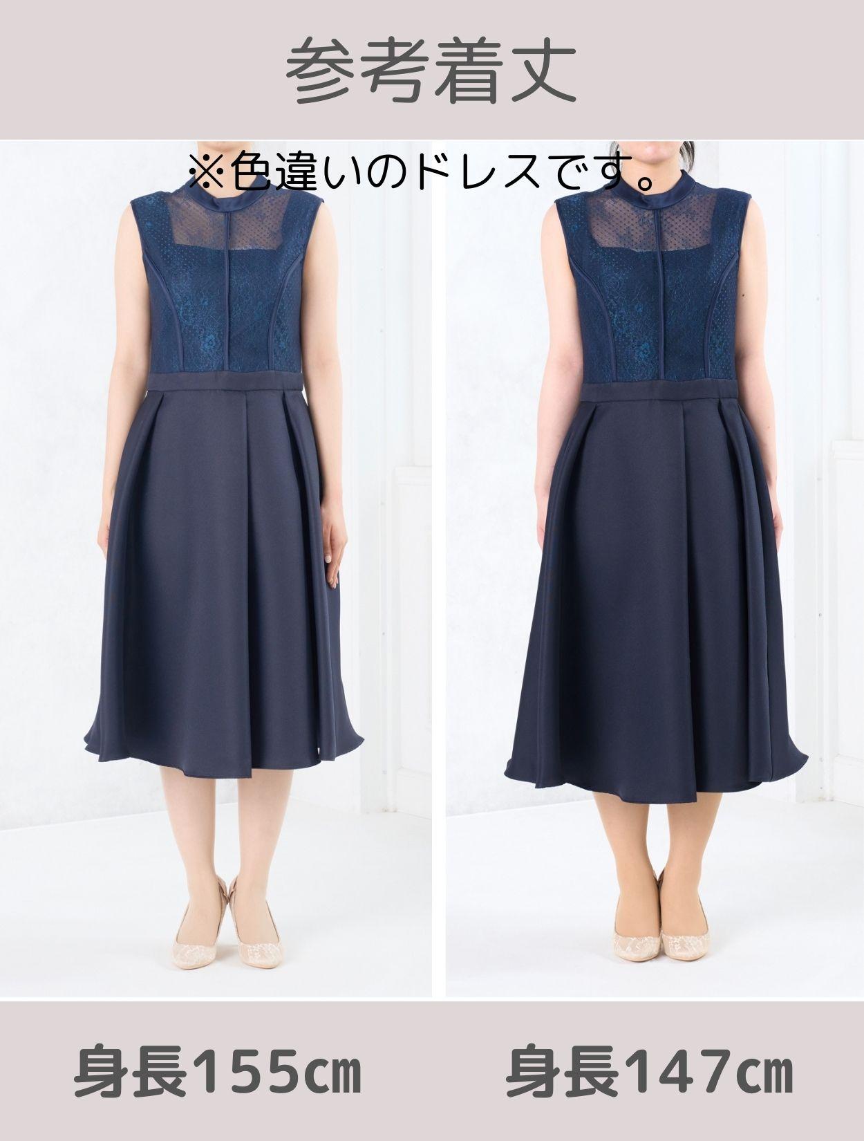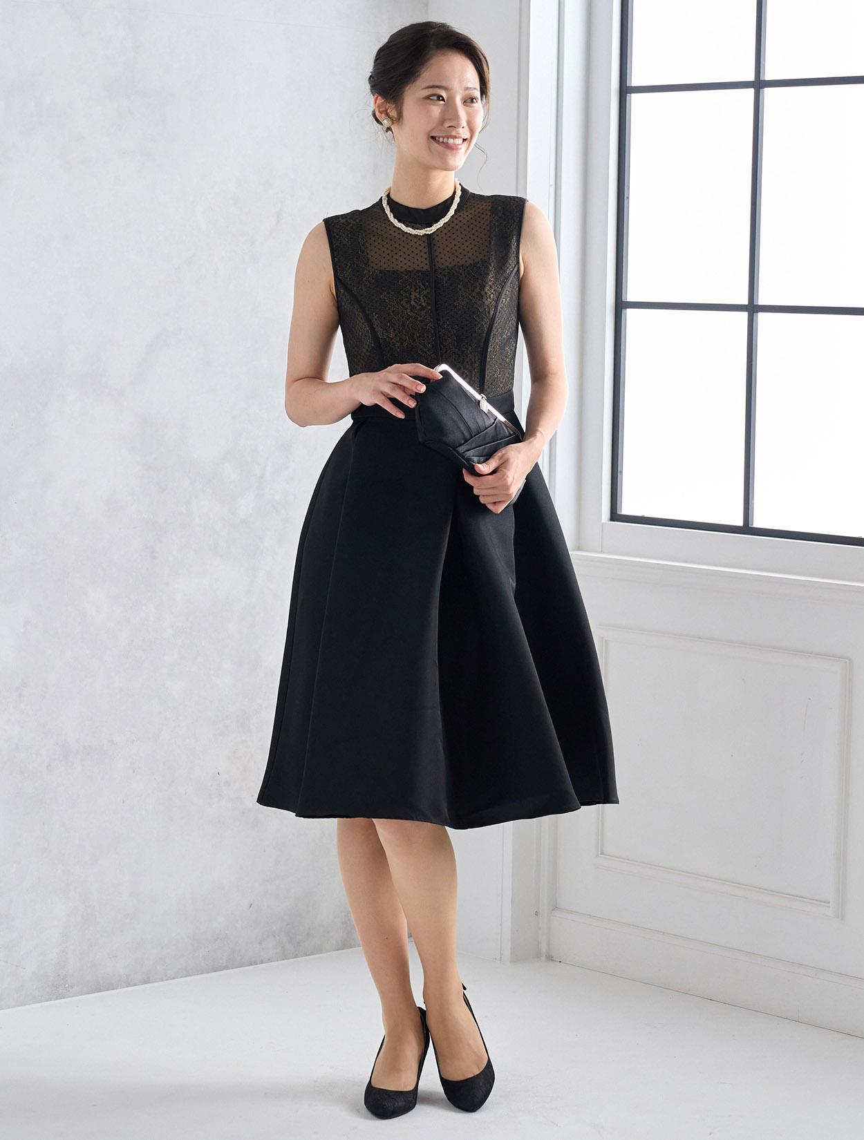 首元が開いていない上品なデザインですが、デコルテ部分は程よく透け感があり重たく見えません。上半身は、二種類のレースを重ねた目を引く凝ったデザインがポイント。スカートにはタックを入れて、高級感のある上質な生地をふんだんに使っているので立っているだけでも絵になり華やかです。長めの丈のフレアスカートなので清楚な着こなしが楽しめます。身長165㎝くらいまでならしっかり膝が隠れる丈で安心です。