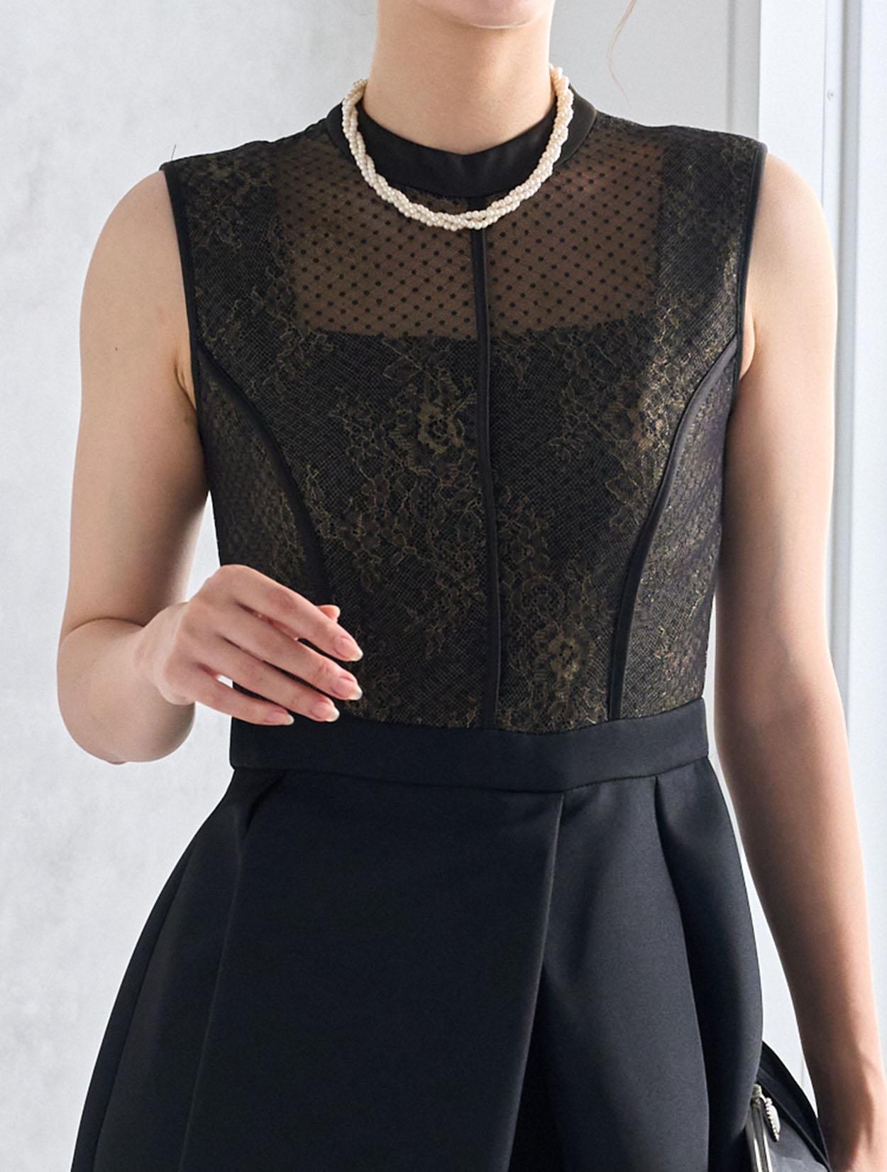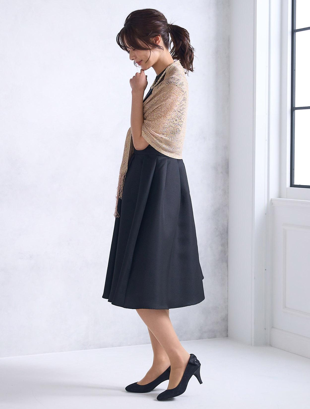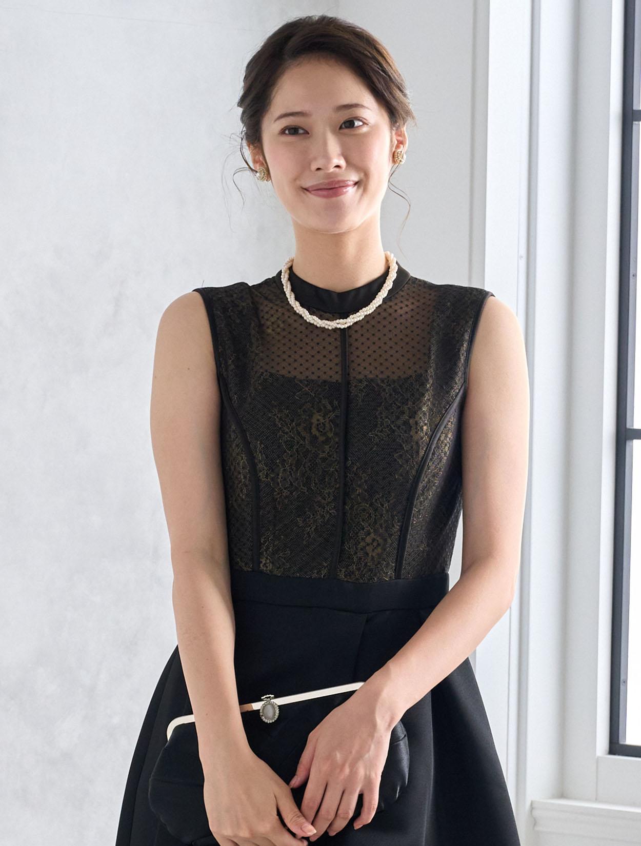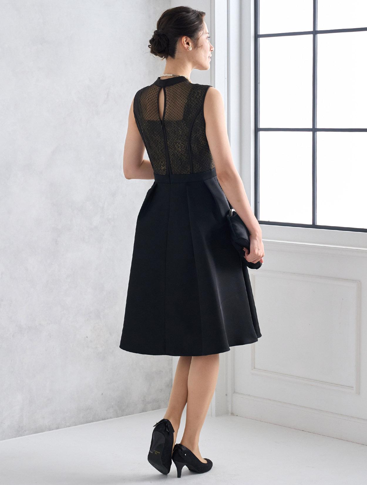 首元が開いていない上品なデザインですが、デコルテ部分は程よく透け感があり重たく見えません。上半身は、二種類のレースを重ねた目を引く凝ったデザインがポイント。スカートにはタックを入れて、高級感のある上質な生地をふんだんに使っているので立っているだけでも絵になり華やかです。長めの丈のフレアスカートなので清楚な着こなしが楽しめます。身長165㎝くらいまでならしっかり膝が隠れる丈で安心です。