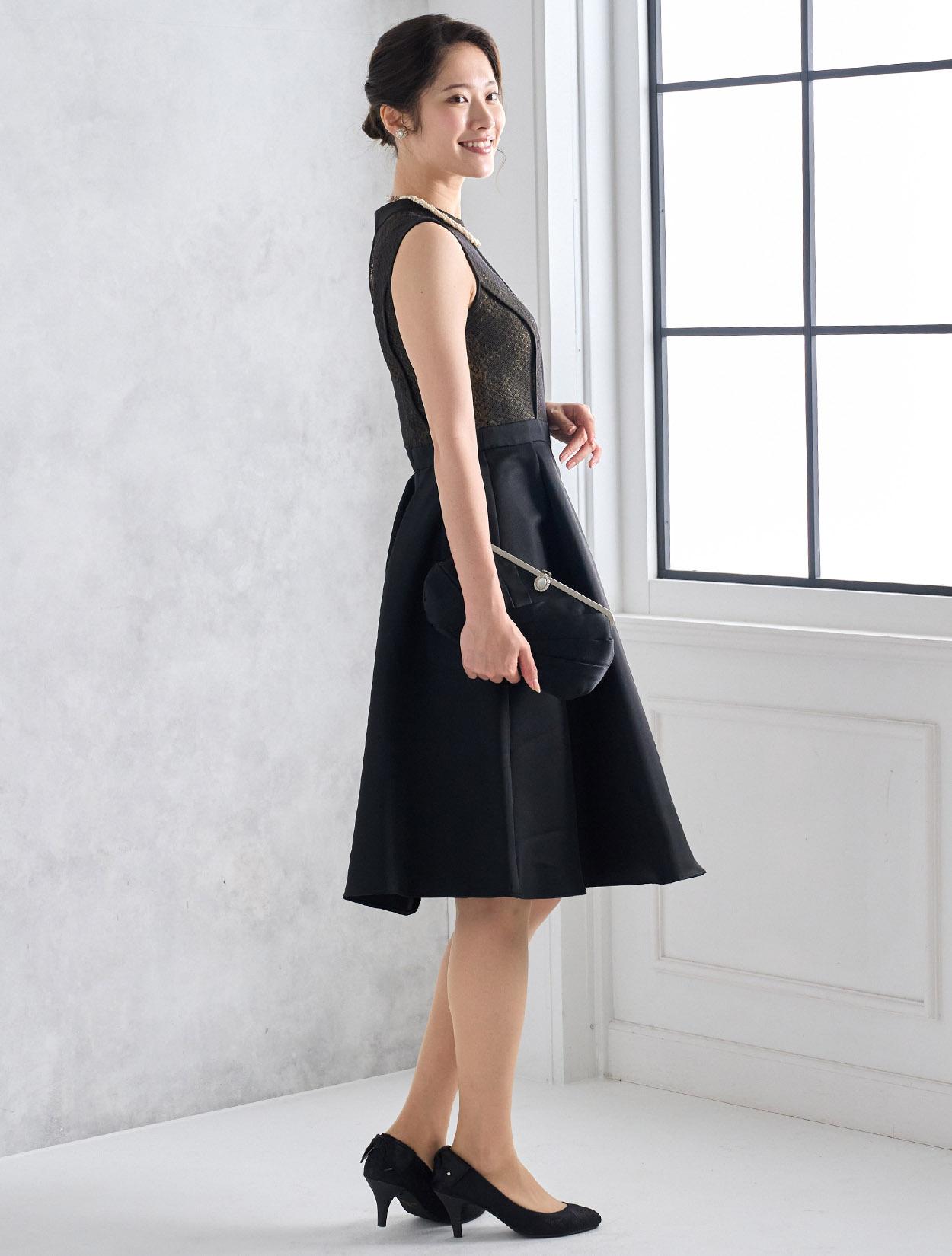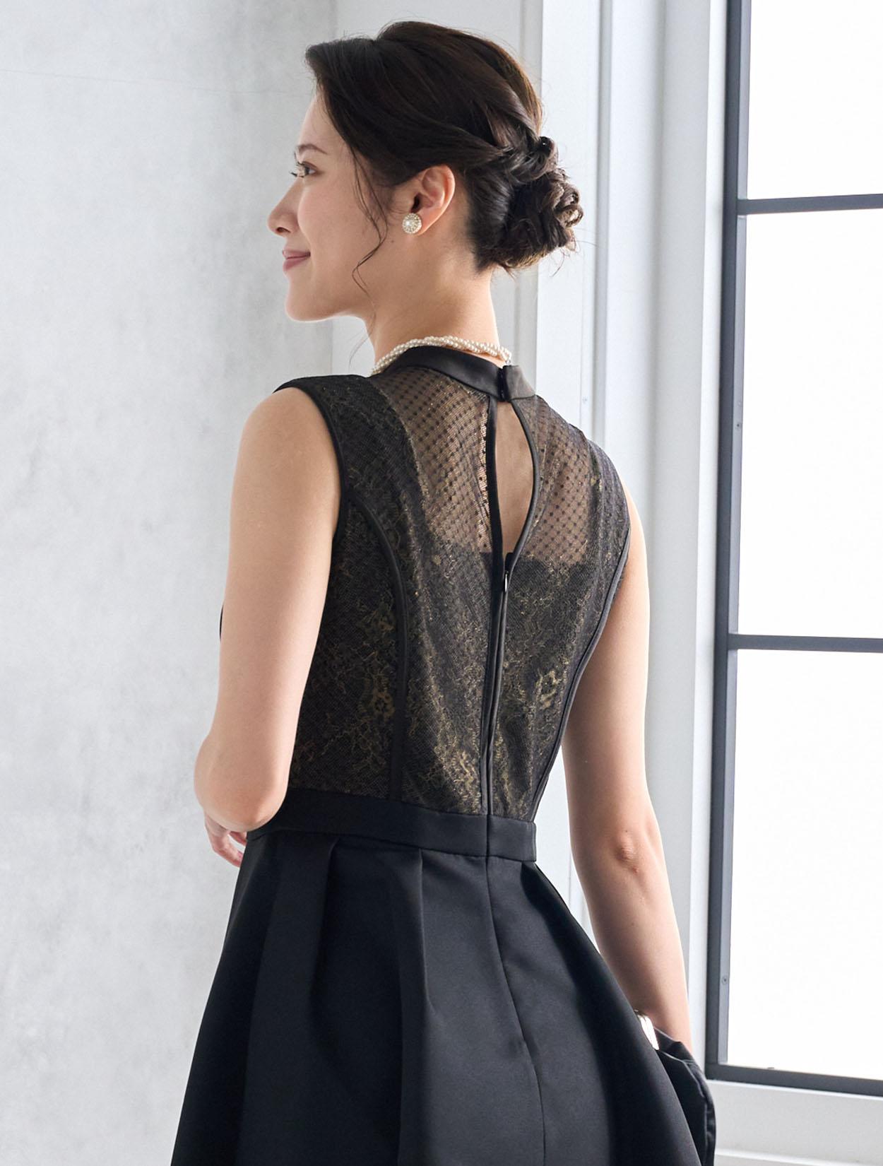 程よい光沢とハリのあるブラックにゴールドのレースを合わせた、クラシカルでパーティー感があるブラックドレスです。高級感のある会場やトレンドのゲストハウスにぴったりです。