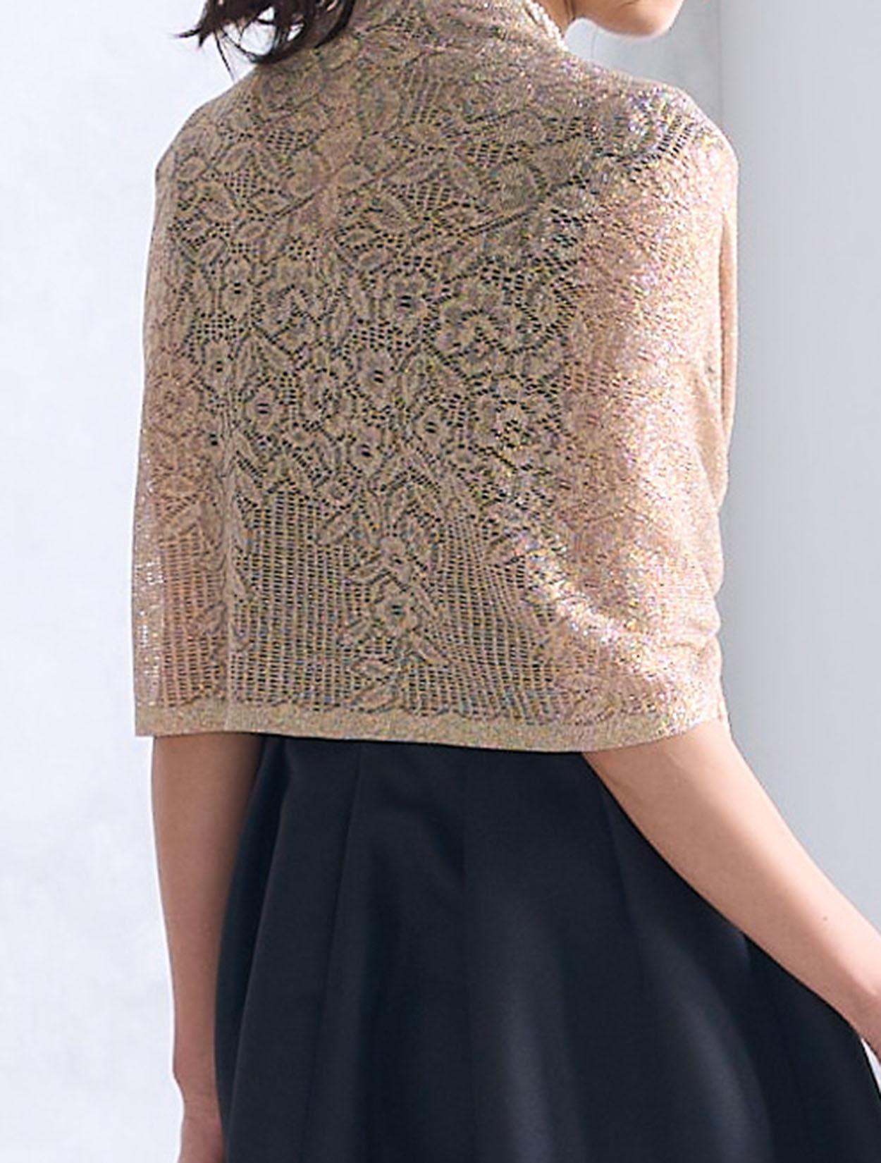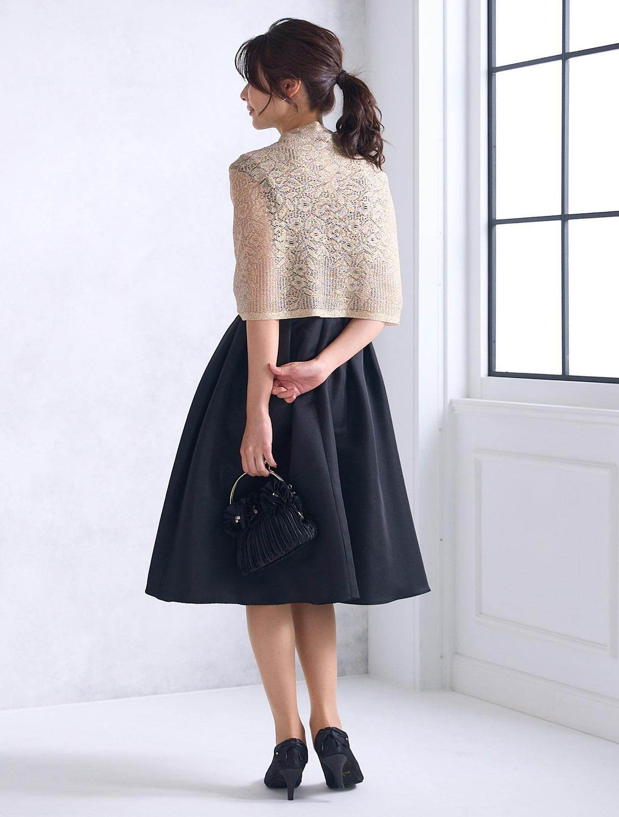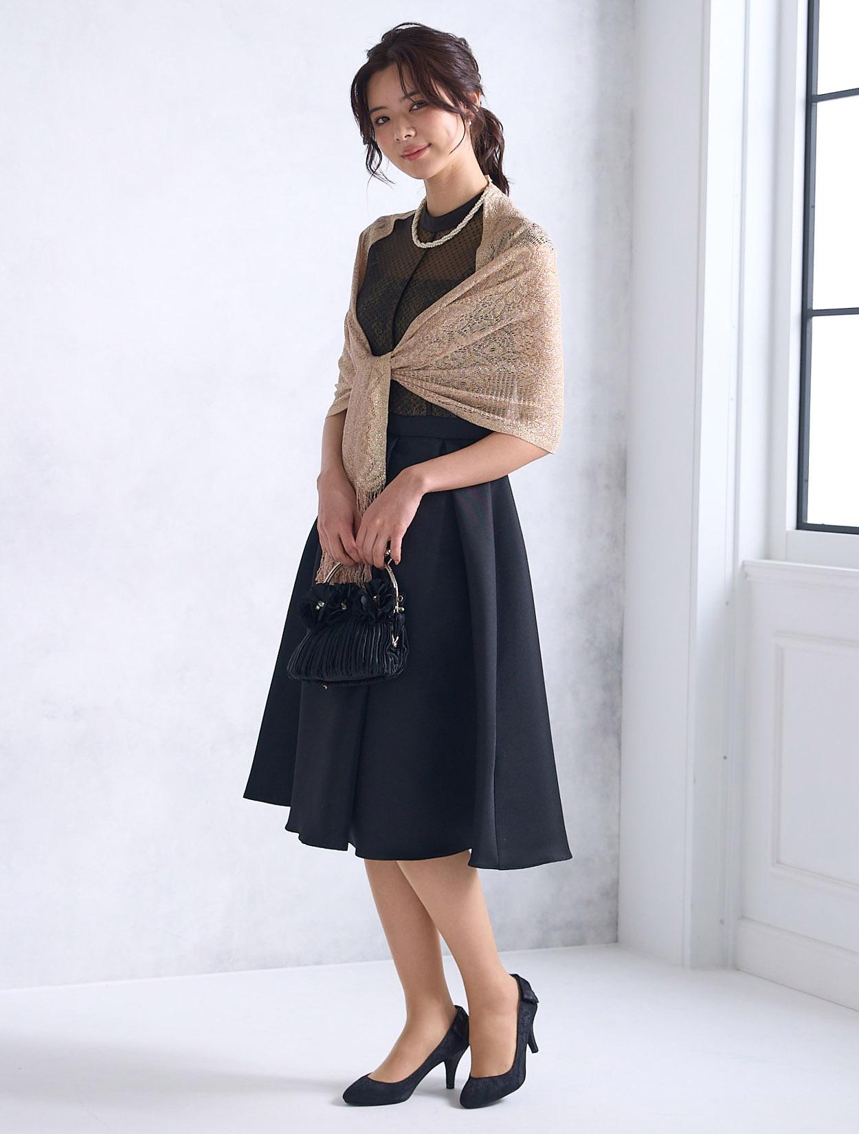ピンクゴールドのショールがブラックのパーティードレスを一気におしゃれにしてくれるコーディネート。コロンとしたフラワーモチーフのバッグも周りと被らないキュートなコーデです。