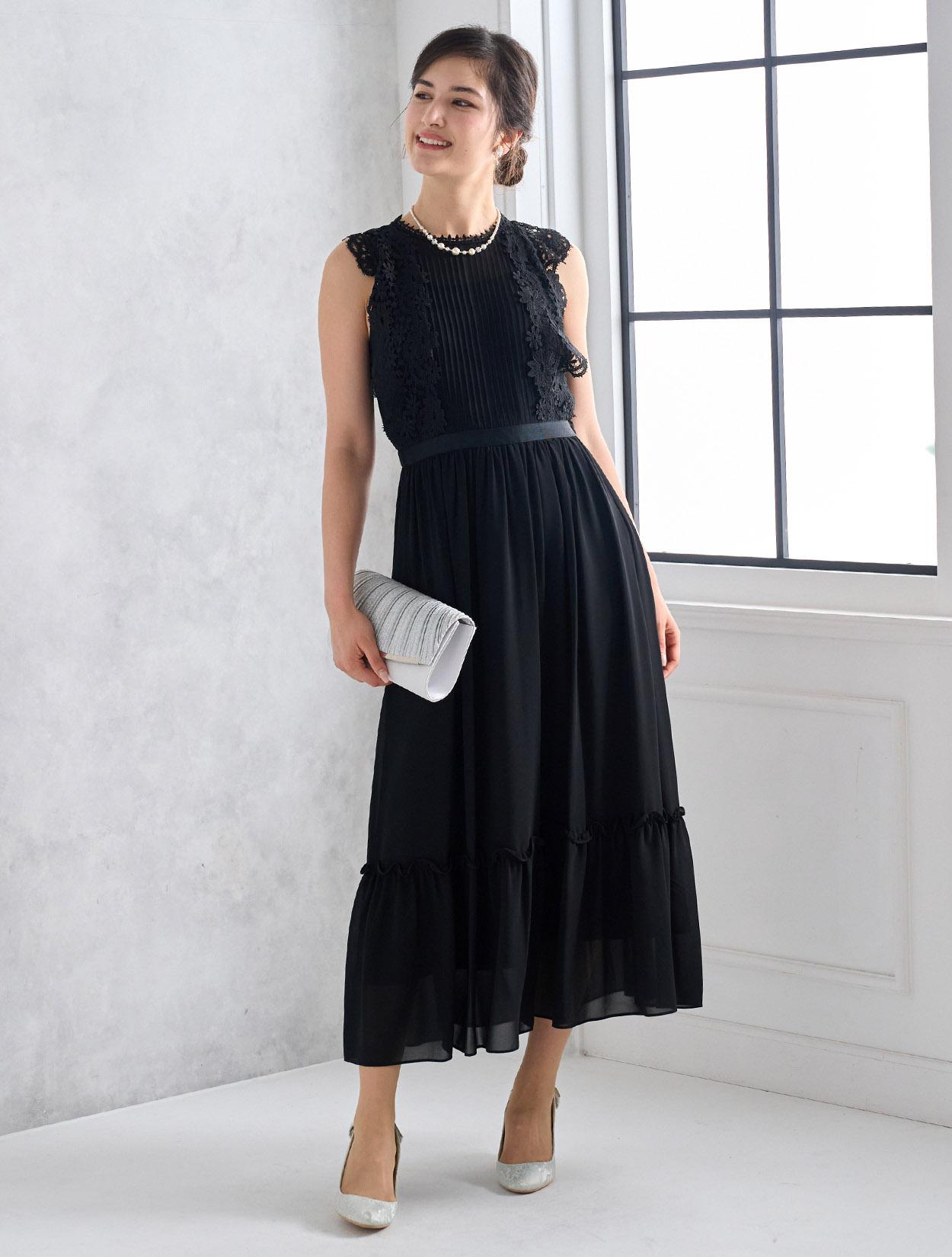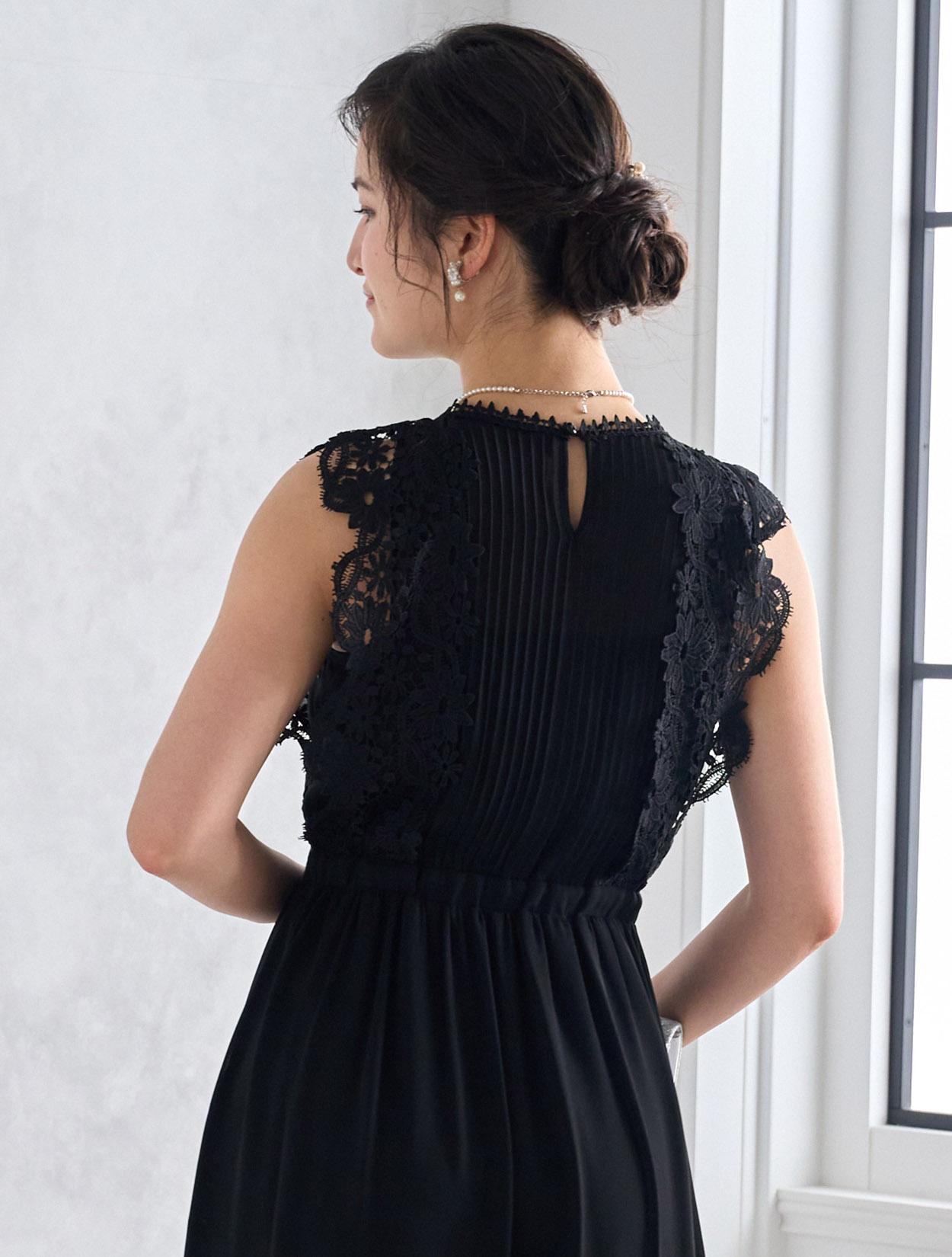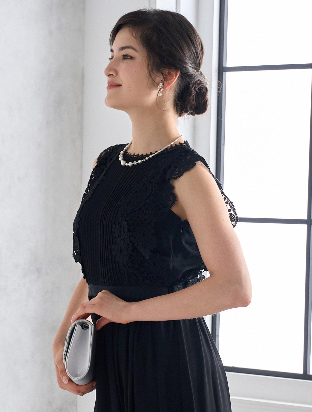 シックで落ち着いたブラックドレスは実は密かに人気のカラー。フラワーレースを使ったこのドレスなら、甘辛のブラックコーデが楽しめます。ブラックでも重たく見えないのがポイントです。
