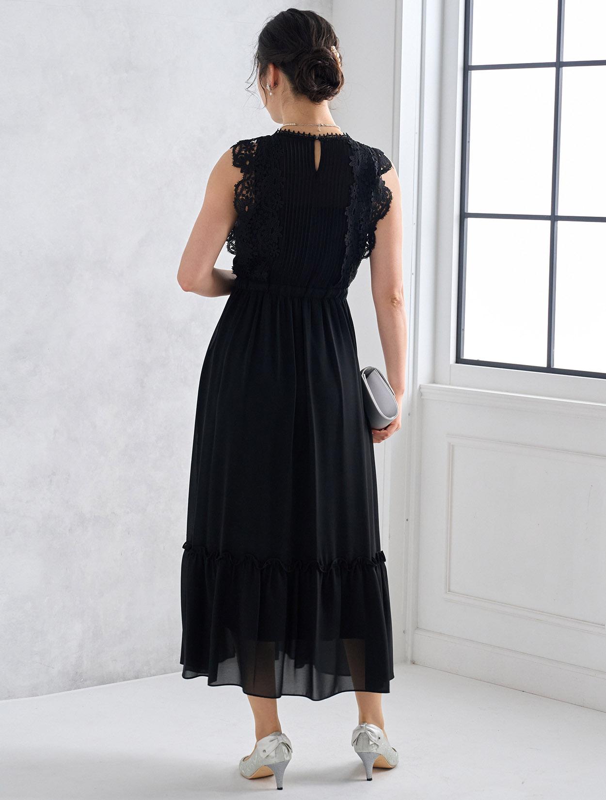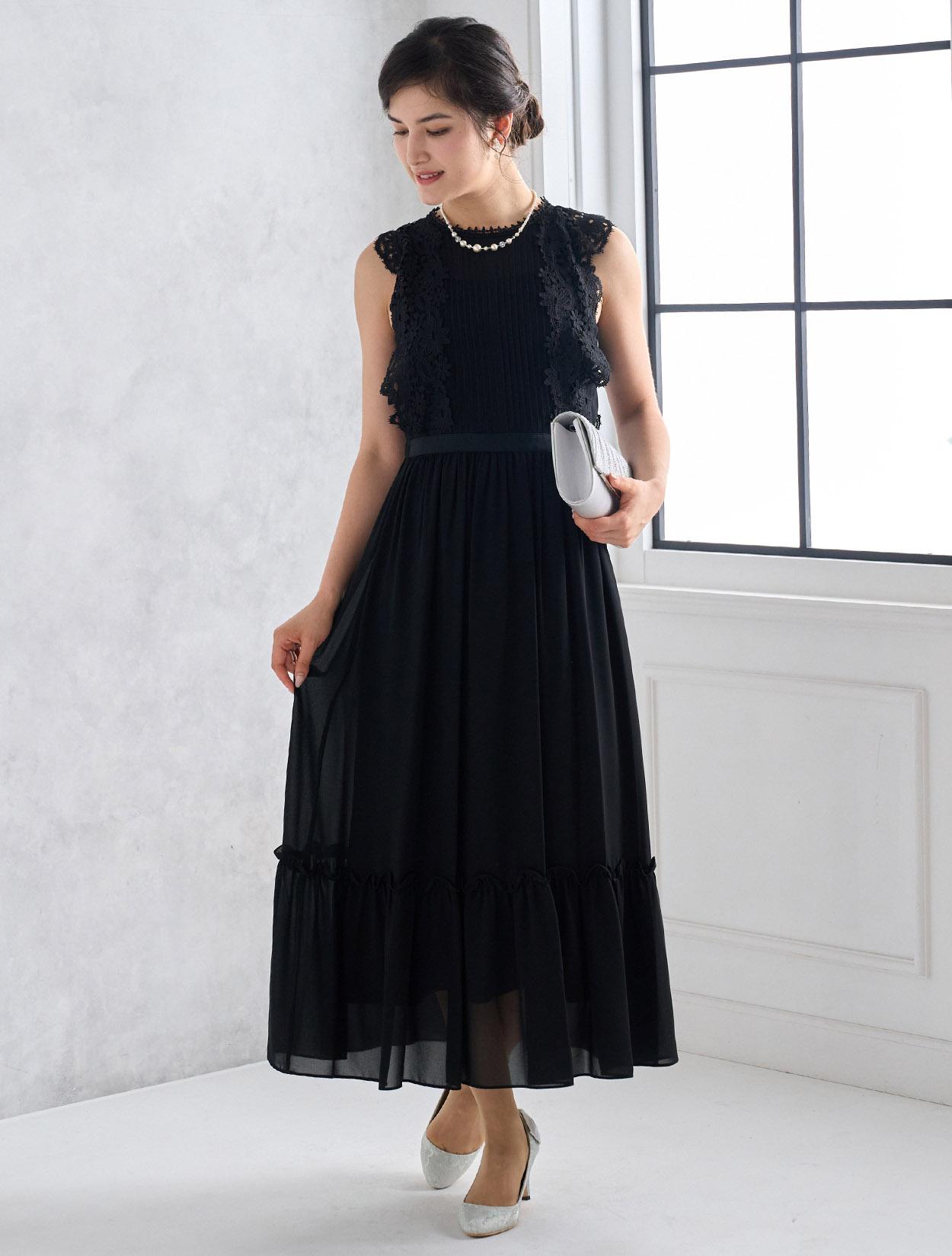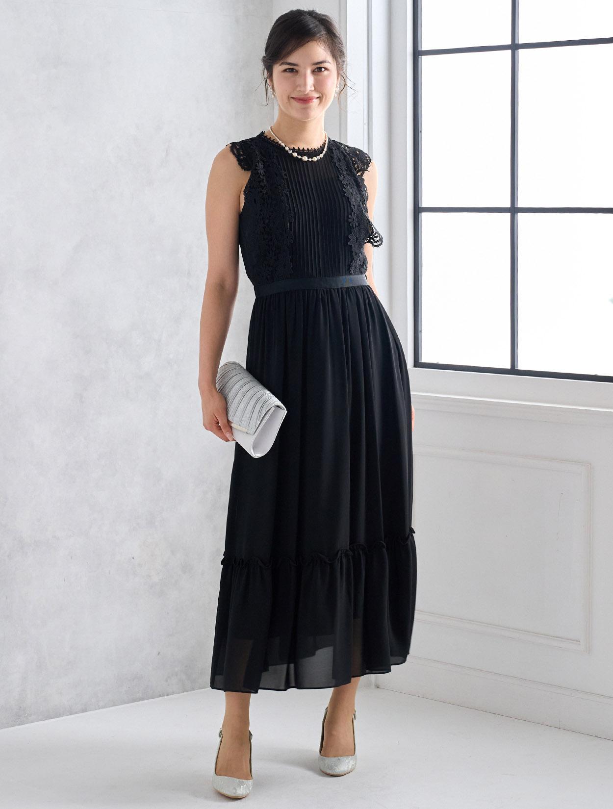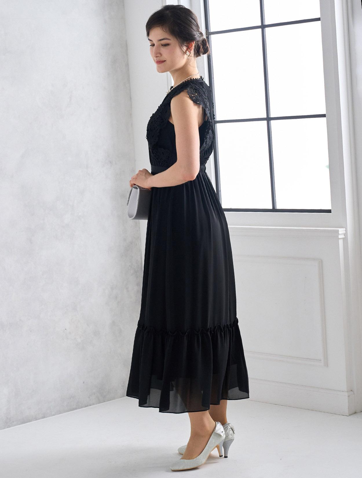 シックで落ち着いたブラックドレスは実は密かに人気のカラー。フラワーレースを使ったこのドレスなら、甘辛のブラックコーデが楽しめます。ブラックでも重たく見えないのがポイントです。