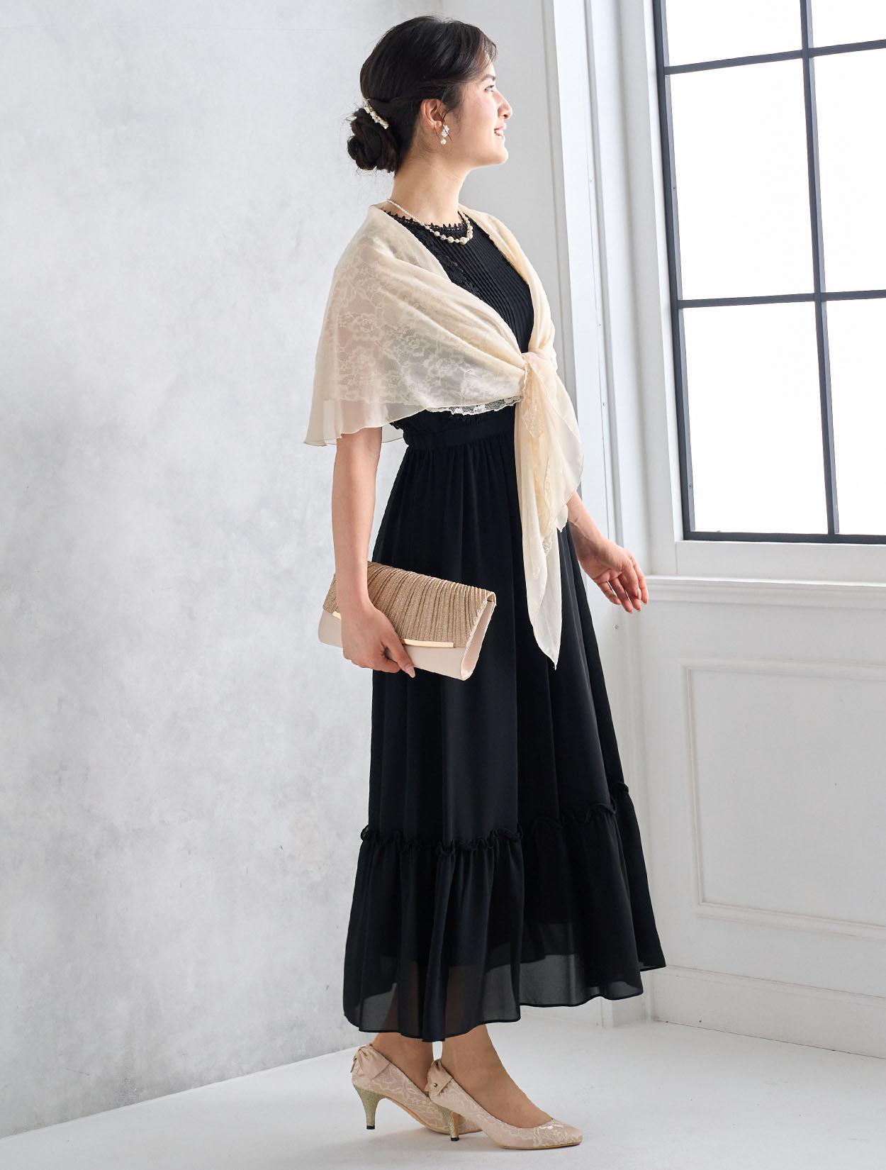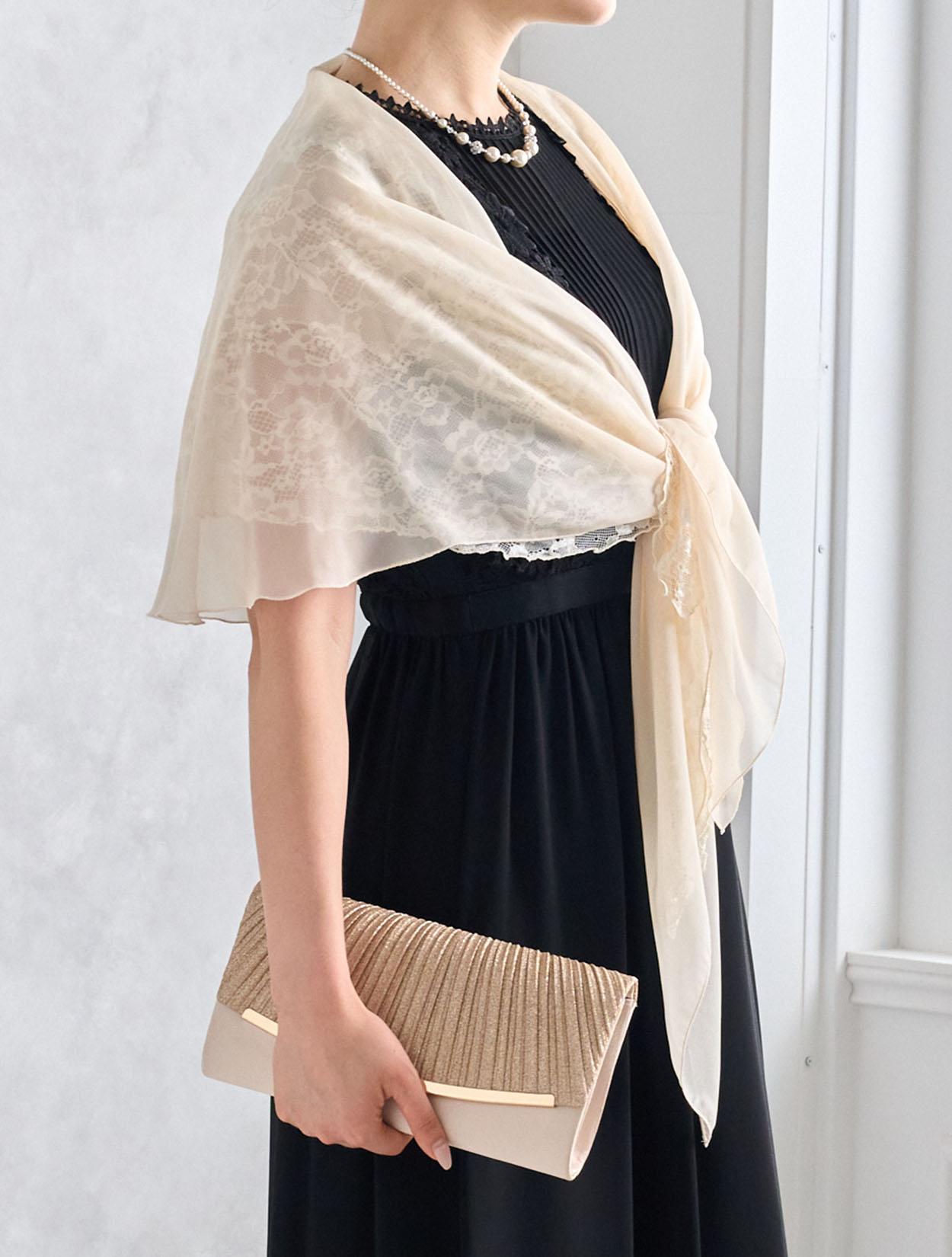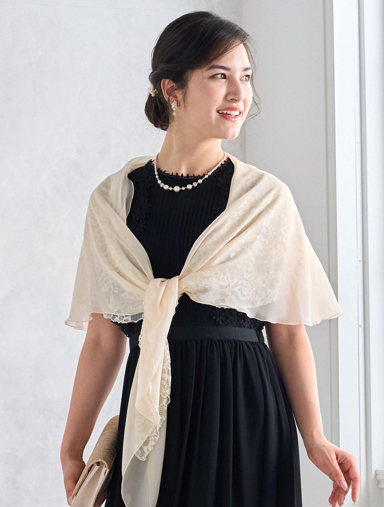ベージュのオーガンジーショールとブラックドレスを合わせた甘辛コーデ。ブラックドレスもフェミニンに着こなせる人気のコーデです。羽織は袖通し付きなので着崩れの心配も不要です。20代の親族ドレスとしてもおすすめです。