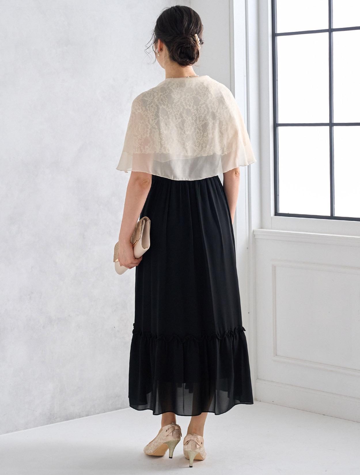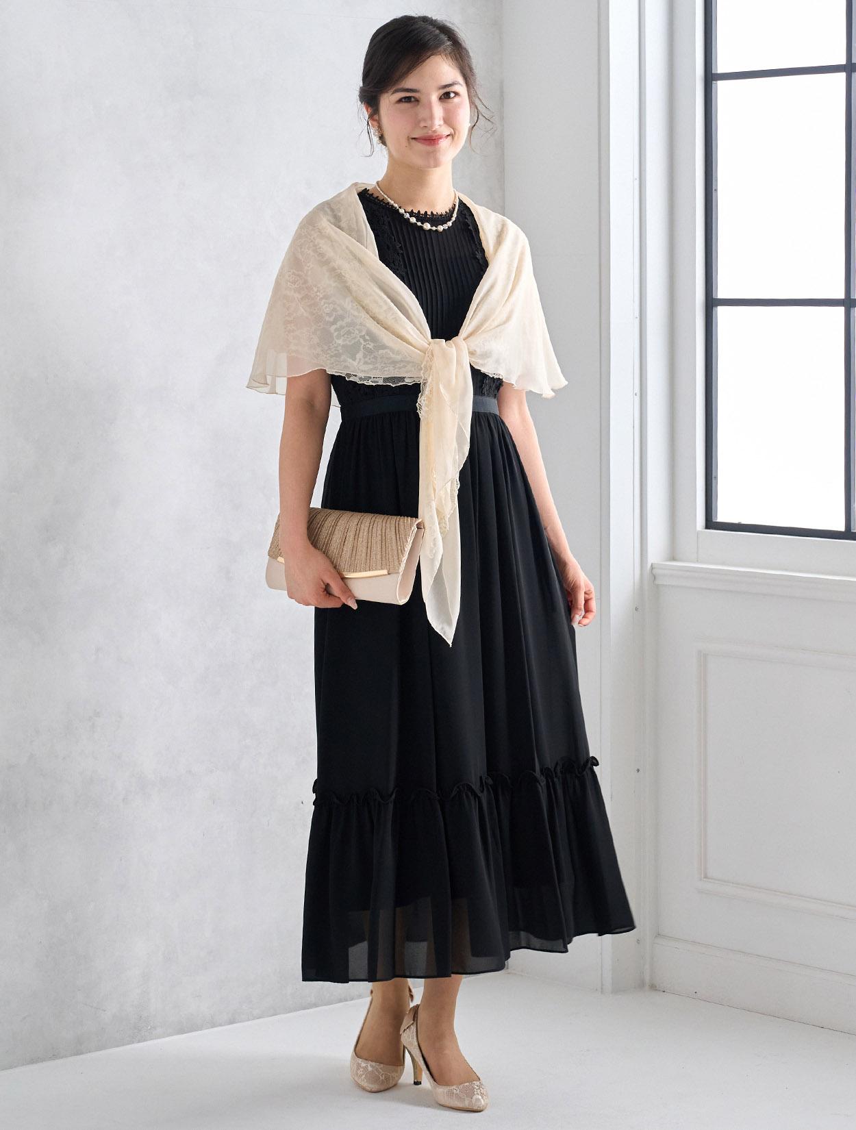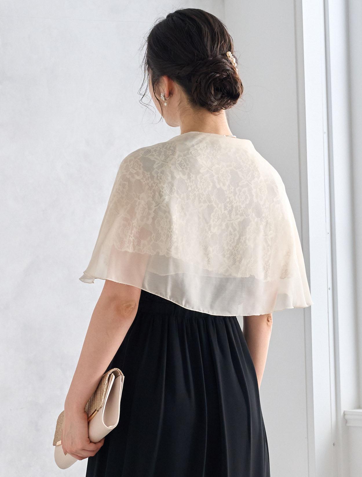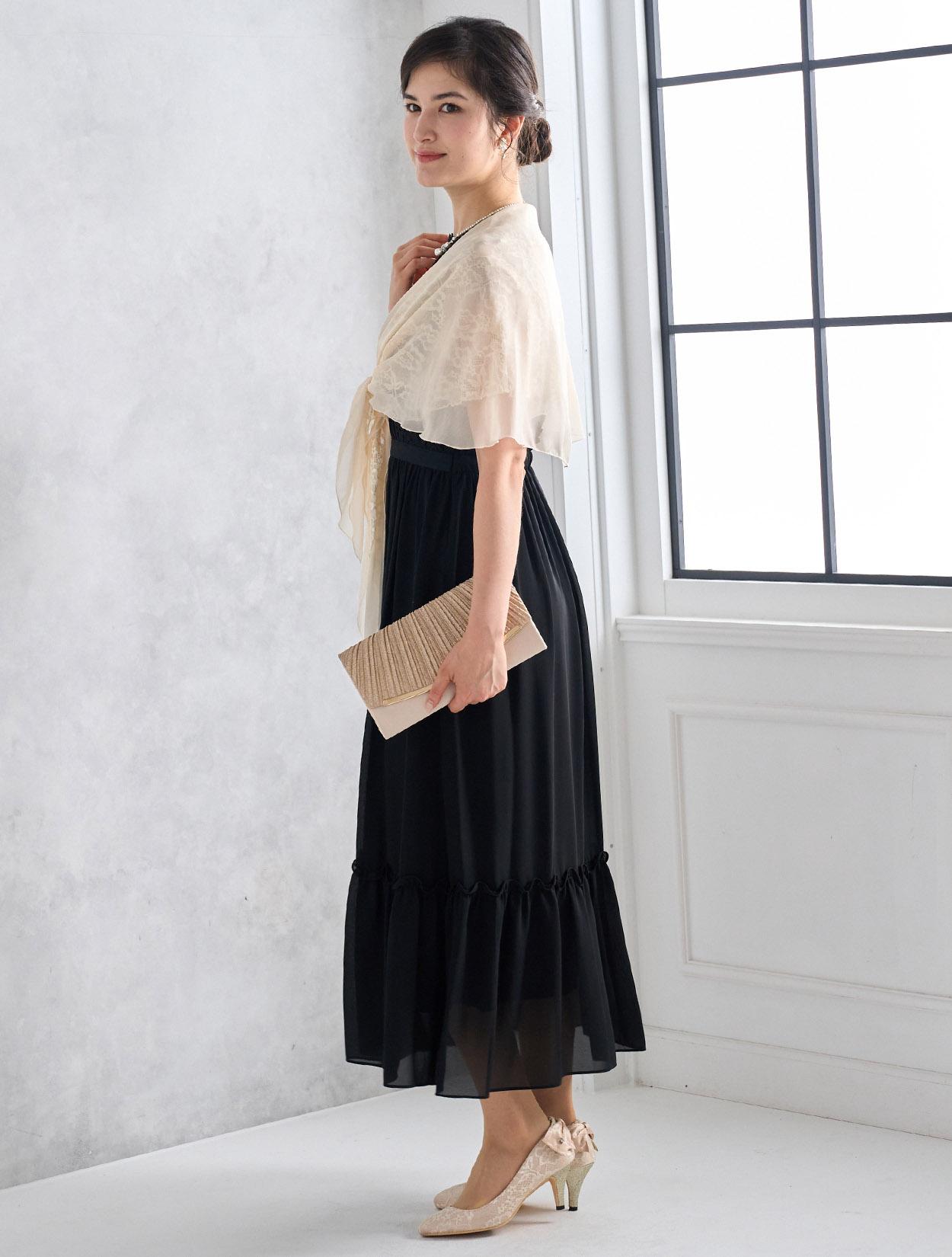 ベージュのオーガンジーショールとブラックドレスを合わせた甘辛コーデ。ブラックドレスもフェミニンに着こなせる人気のコーデです。羽織は袖通し付きなので着崩れの心配も不要です。20代の親族ドレスとしてもおすすめです。