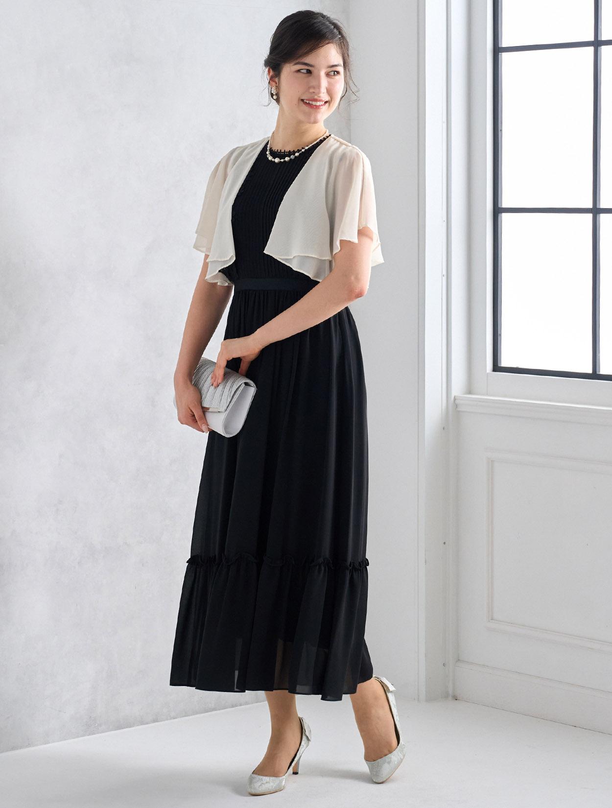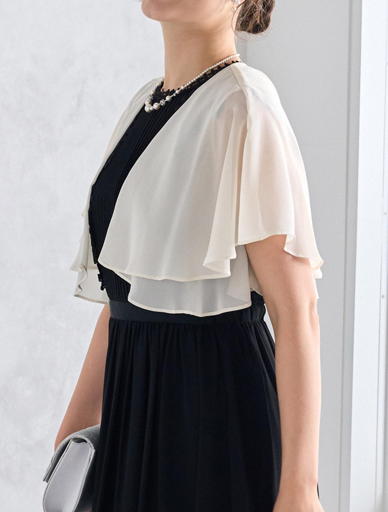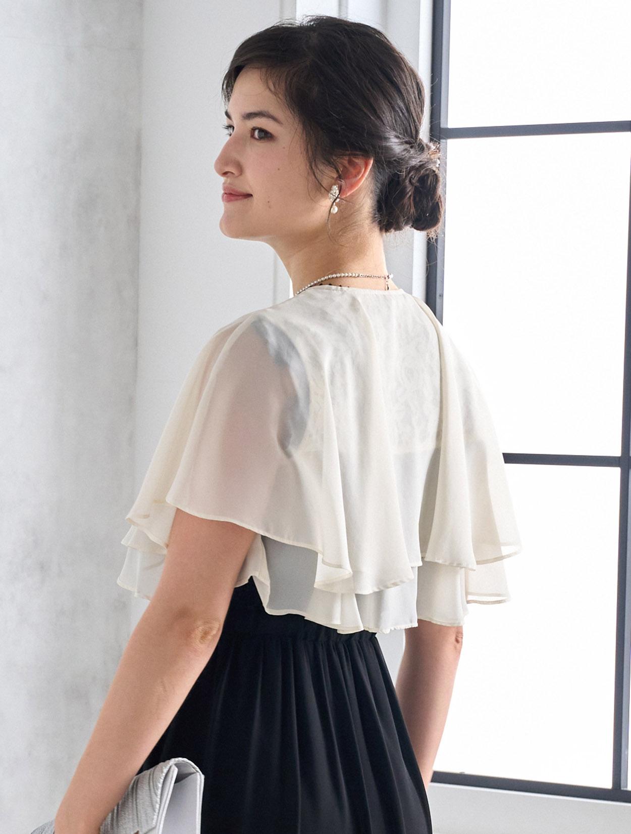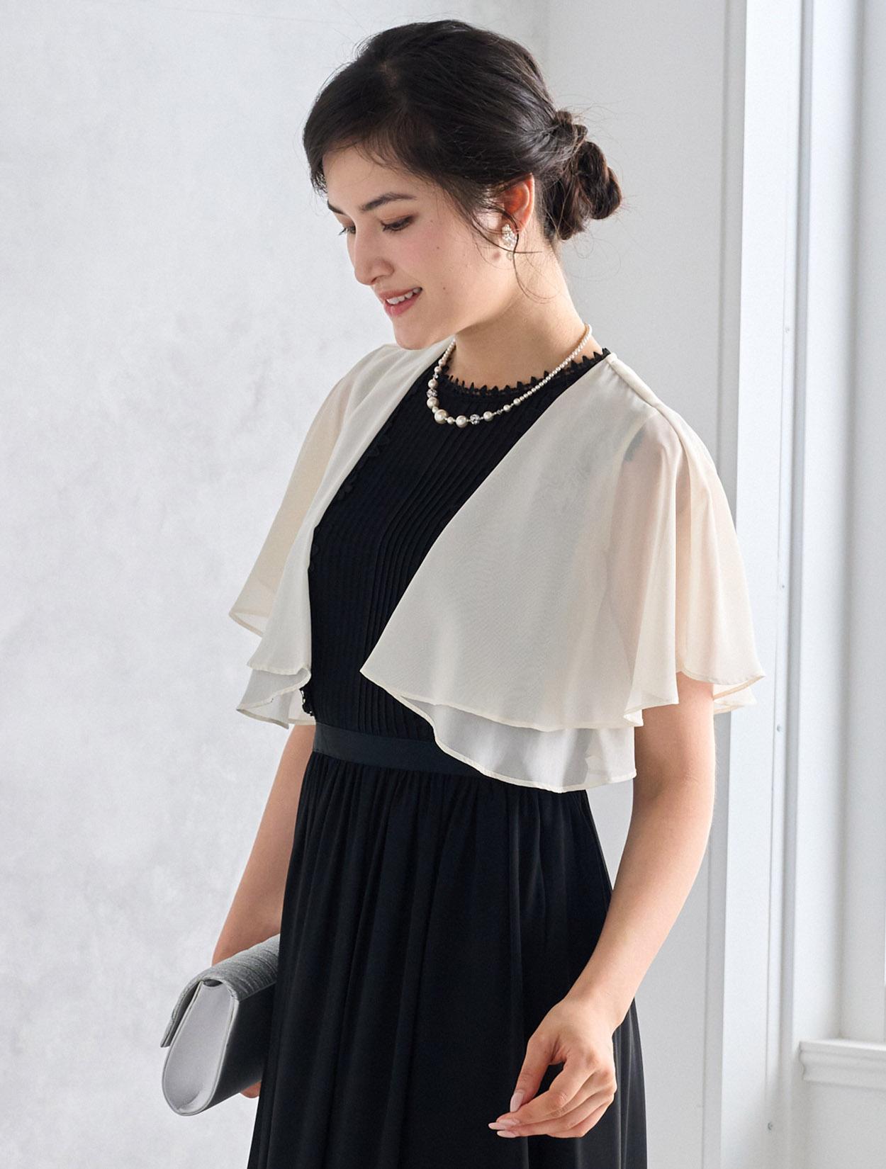ブラックドレスにアイボリー系のシフォンボレロを合わせた爽やかなコーディネート。羽織の透け感でブラックドレスも軽やかに着こなせます。20代の親族ドレスとしてもおすすめです。