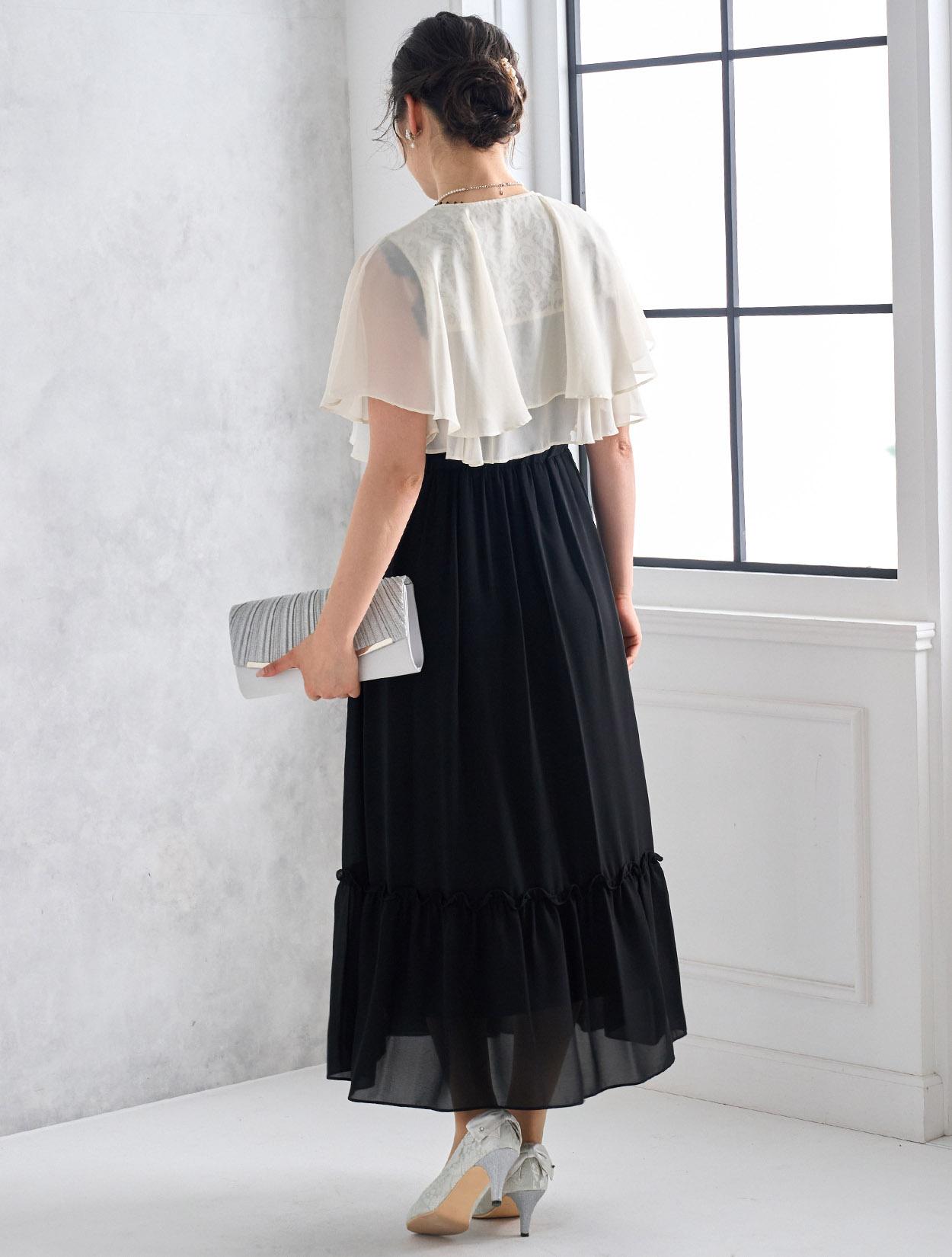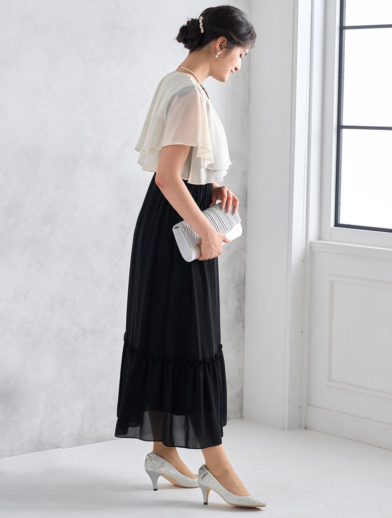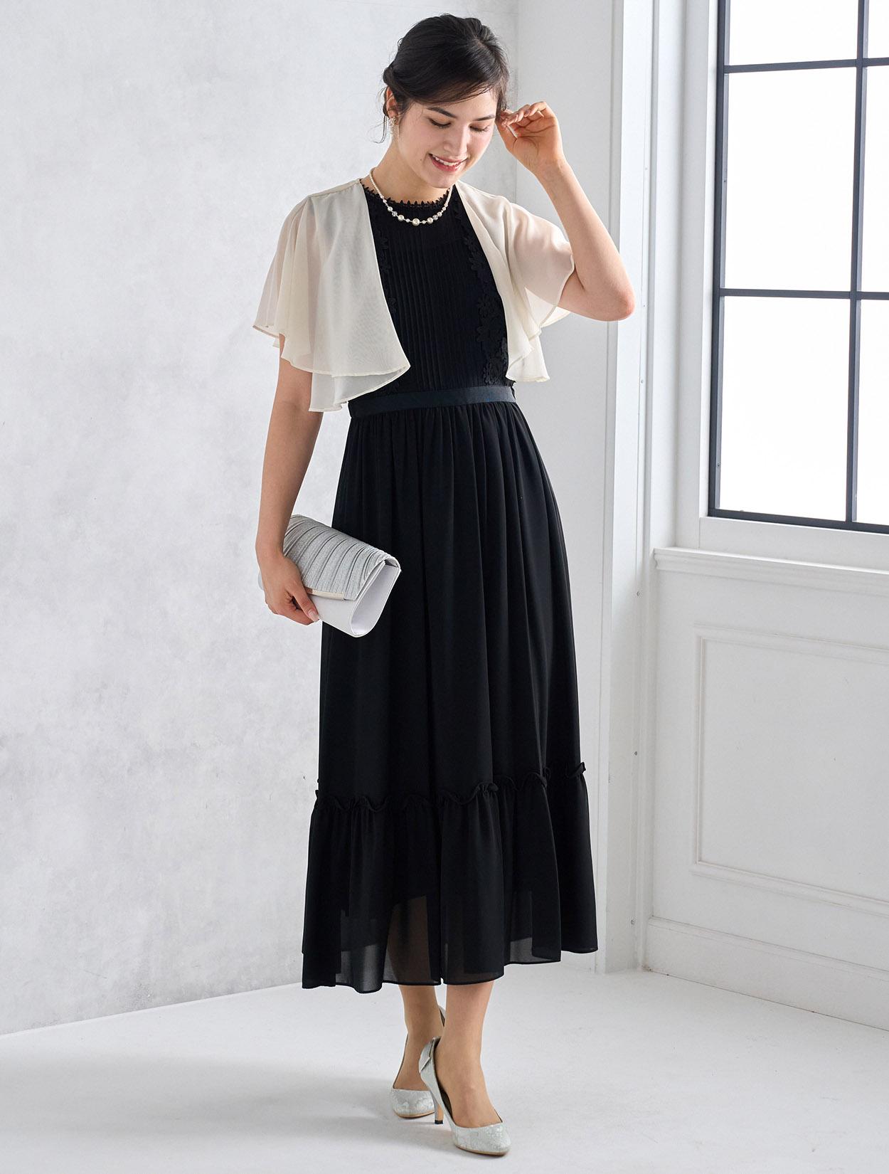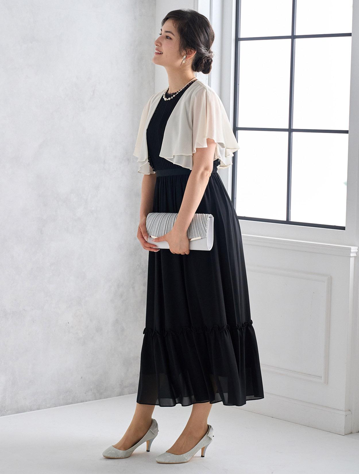 ブラックドレスにアイボリー系のシフォンボレロを合わせた爽やかなコーディネート。羽織の透け感でブラックドレスも軽やかに着こなせます。20代の親族ドレスとしてもおすすめです。
