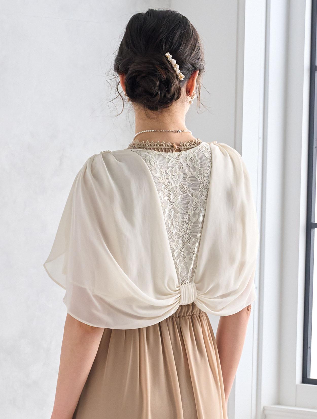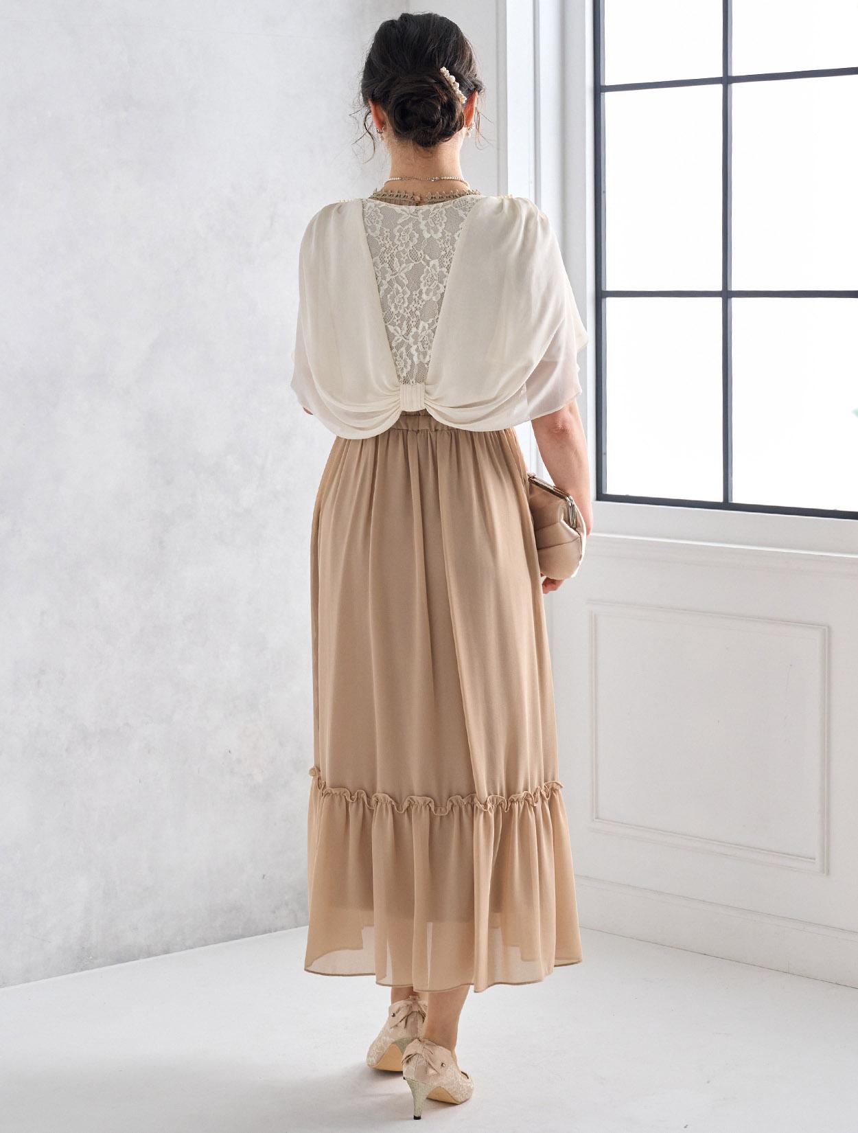 バックスタイルがキュートなケープ風のボレロを合わせた可愛いらしい印象のコーデ。ベージュでも地味にならないコーディネートで人気があります。