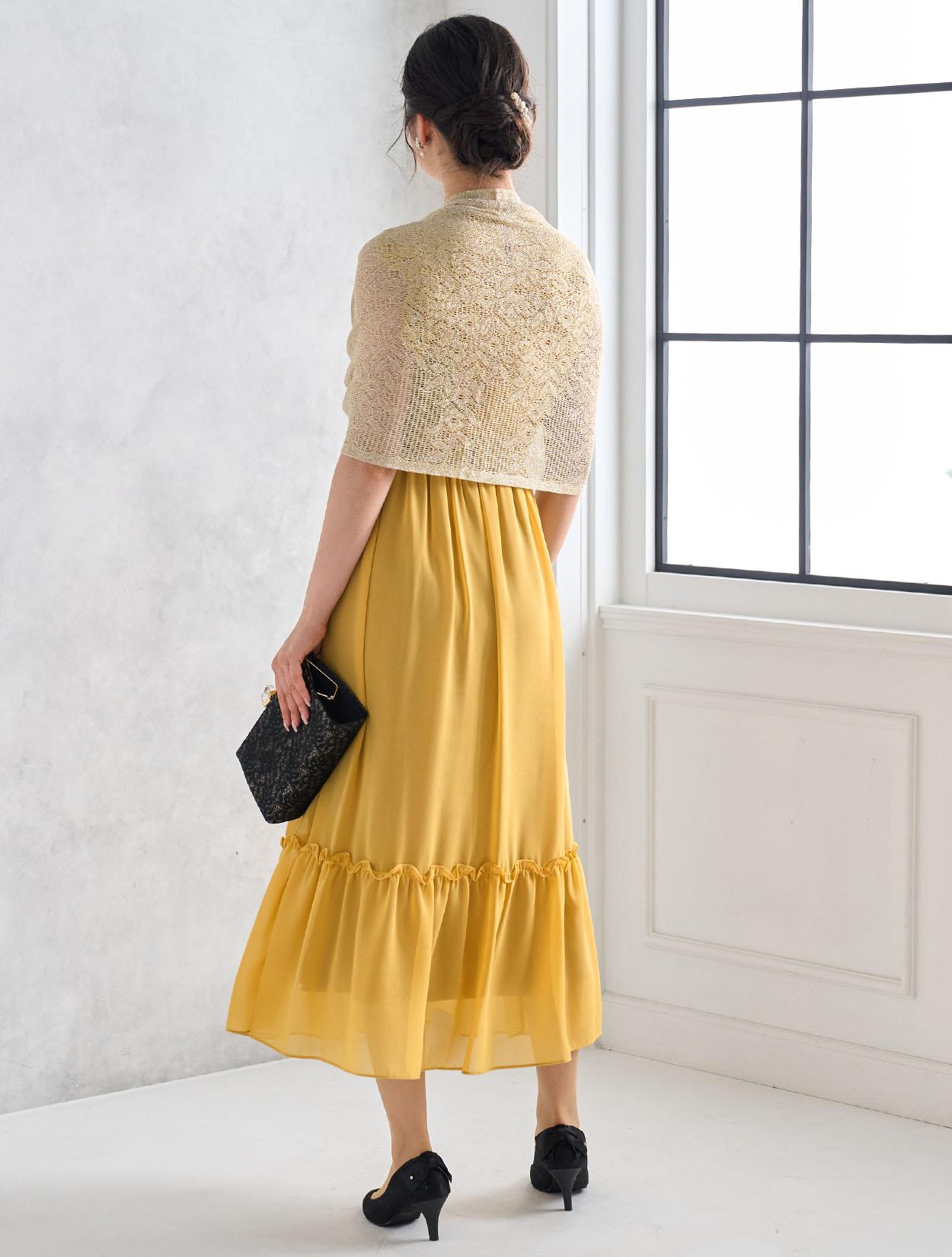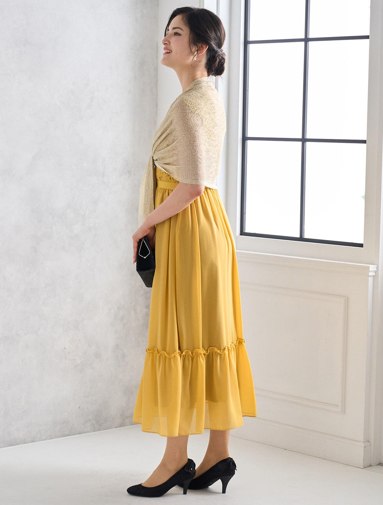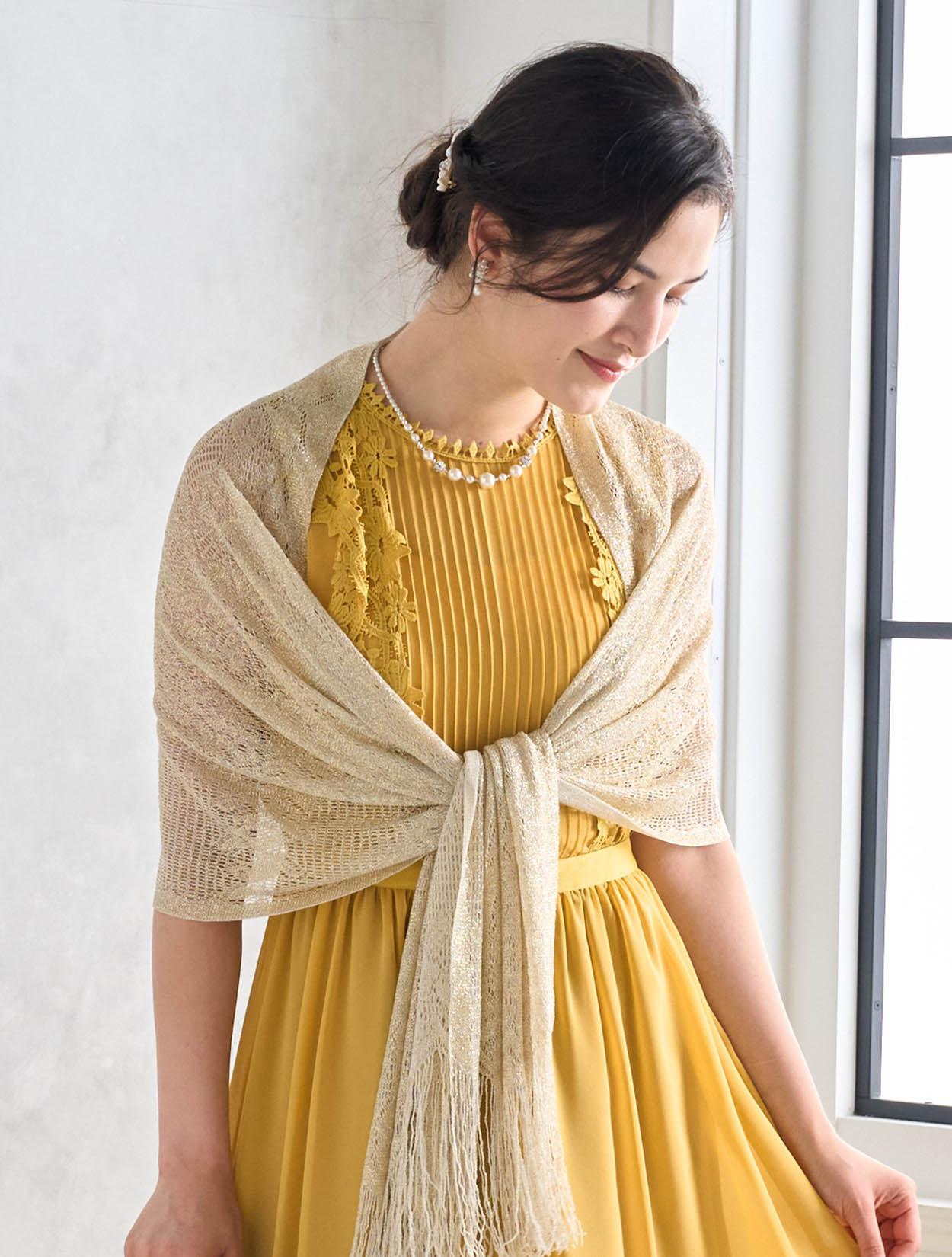 イエローのドレスにゴールドのラメショールを合わせたとても華やかなコーディネートです。ワンポイントのブラックバッグがメリハリを出して少し大人っぽさもプラスしてくれます。