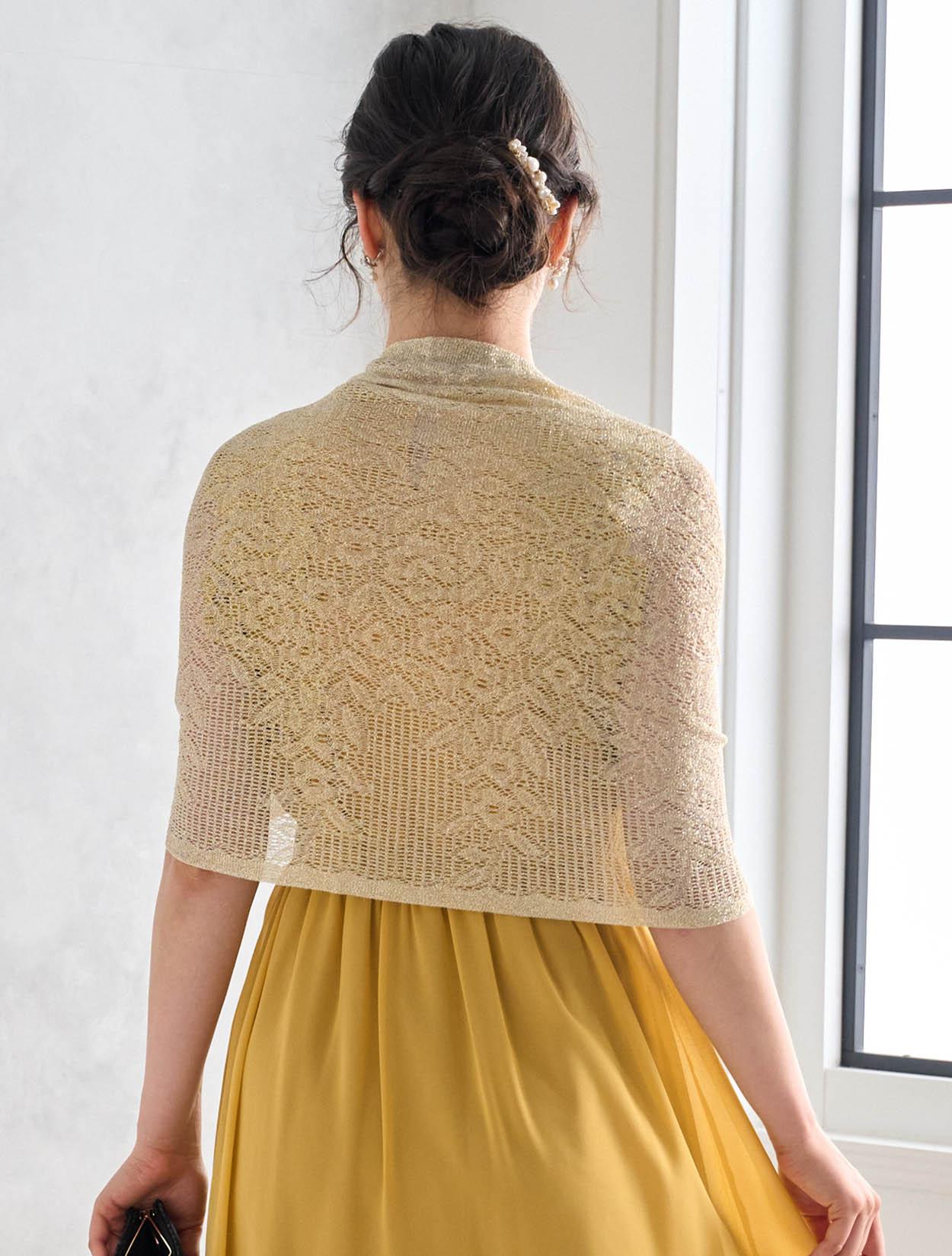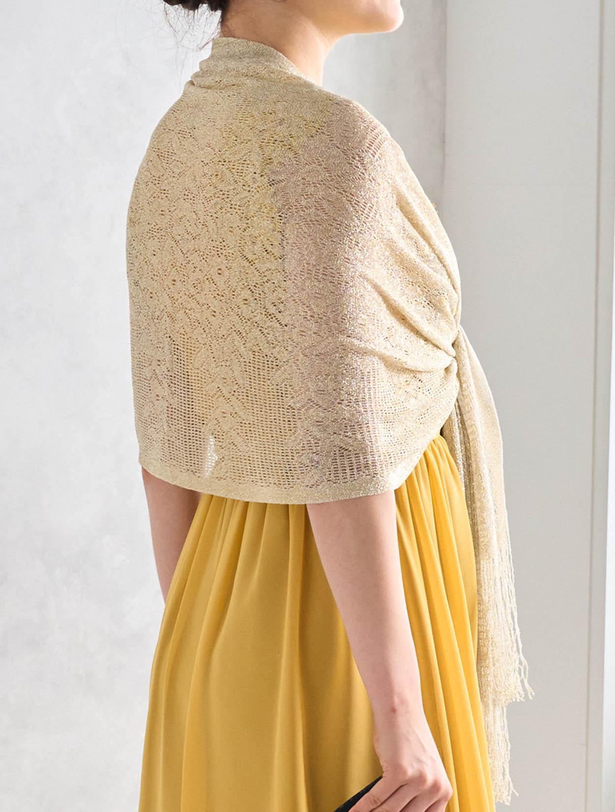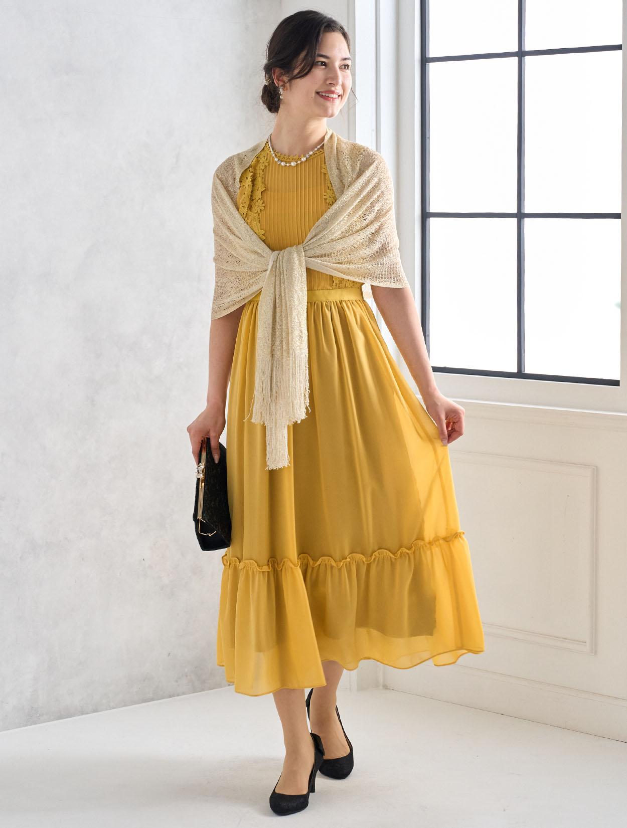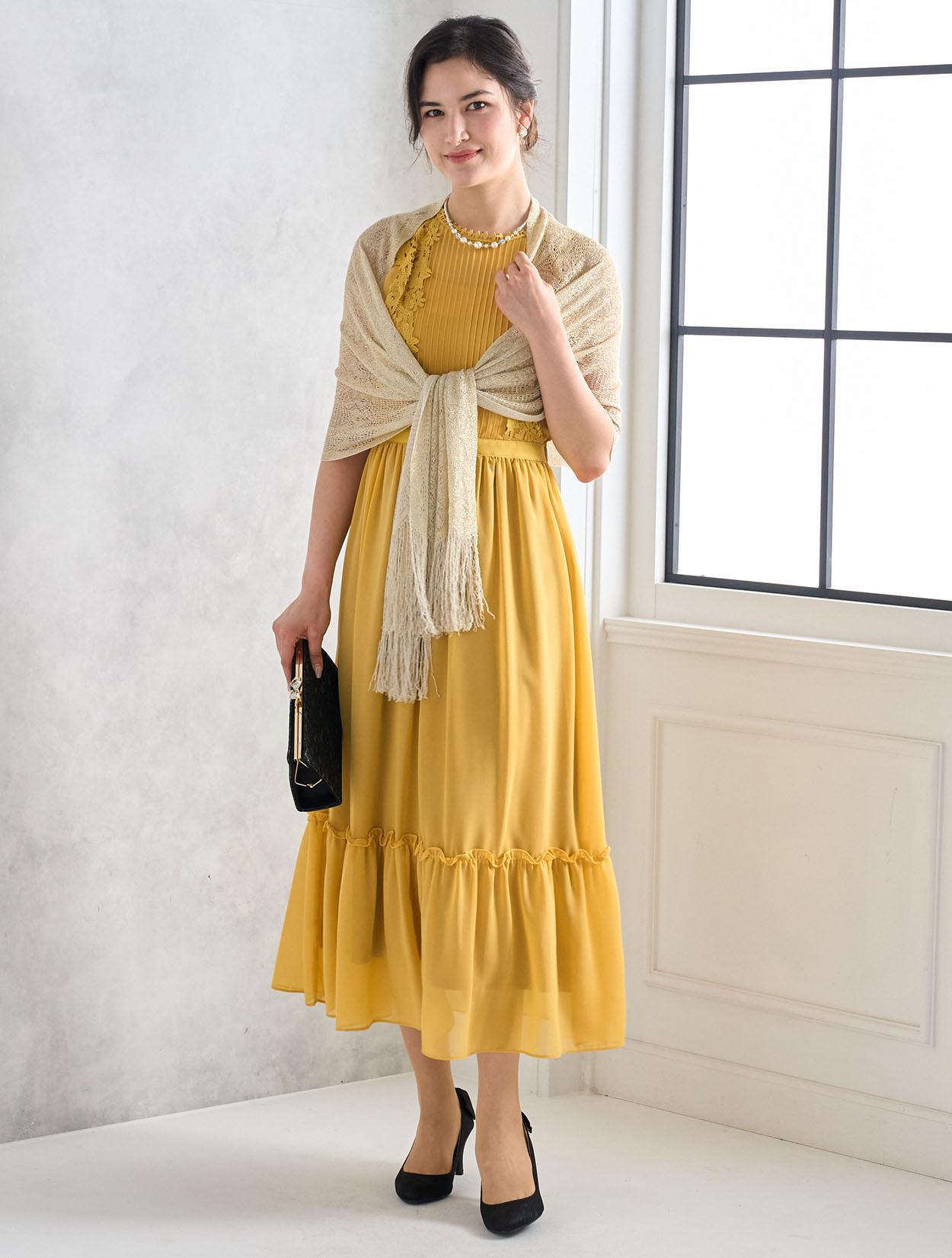 イエローのドレスにゴールドのラメショールを合わせたとても華やかなコーディネートです。ワンポイントのブラックバッグがメリハリを出して少し大人っぽさもプラスしてくれます。