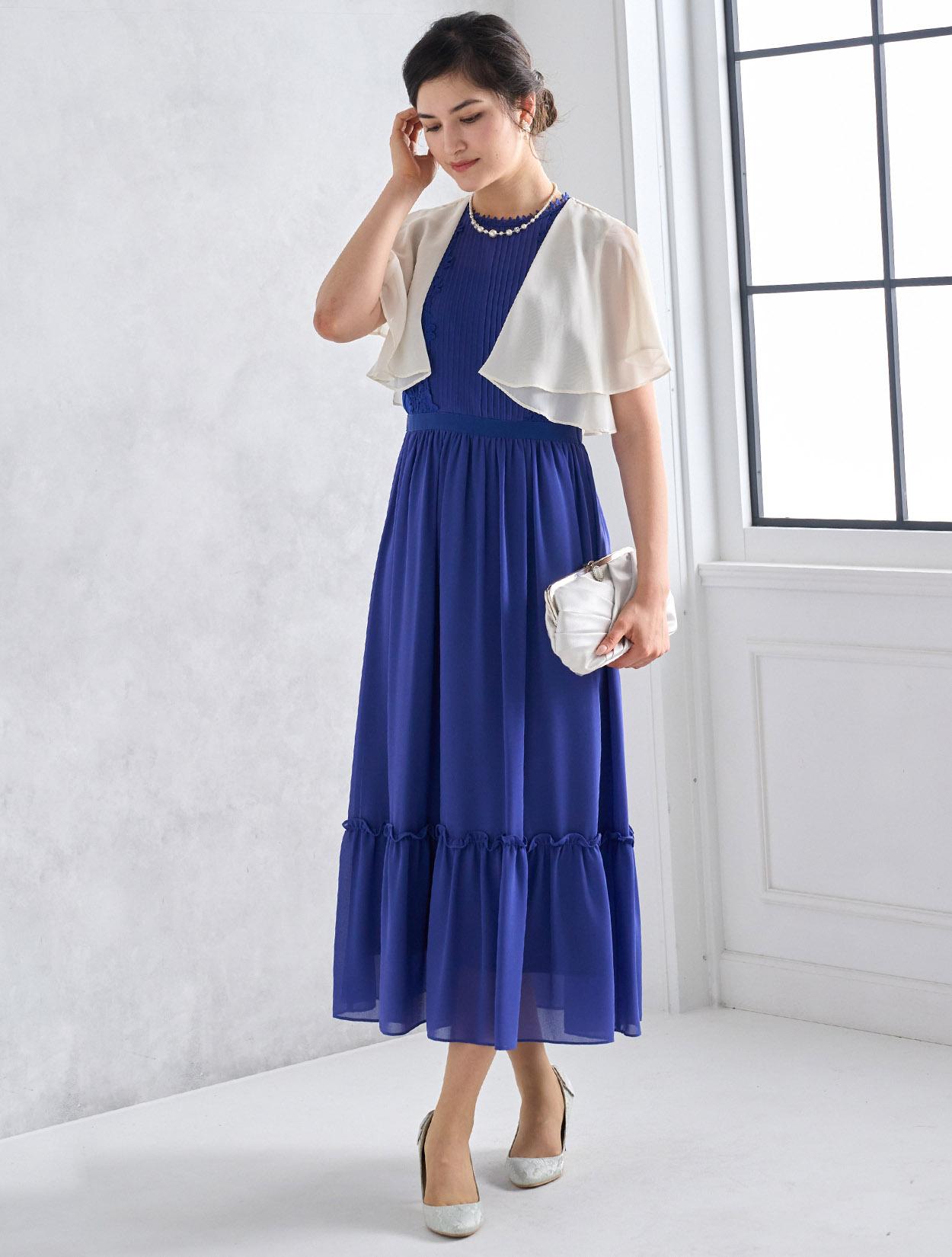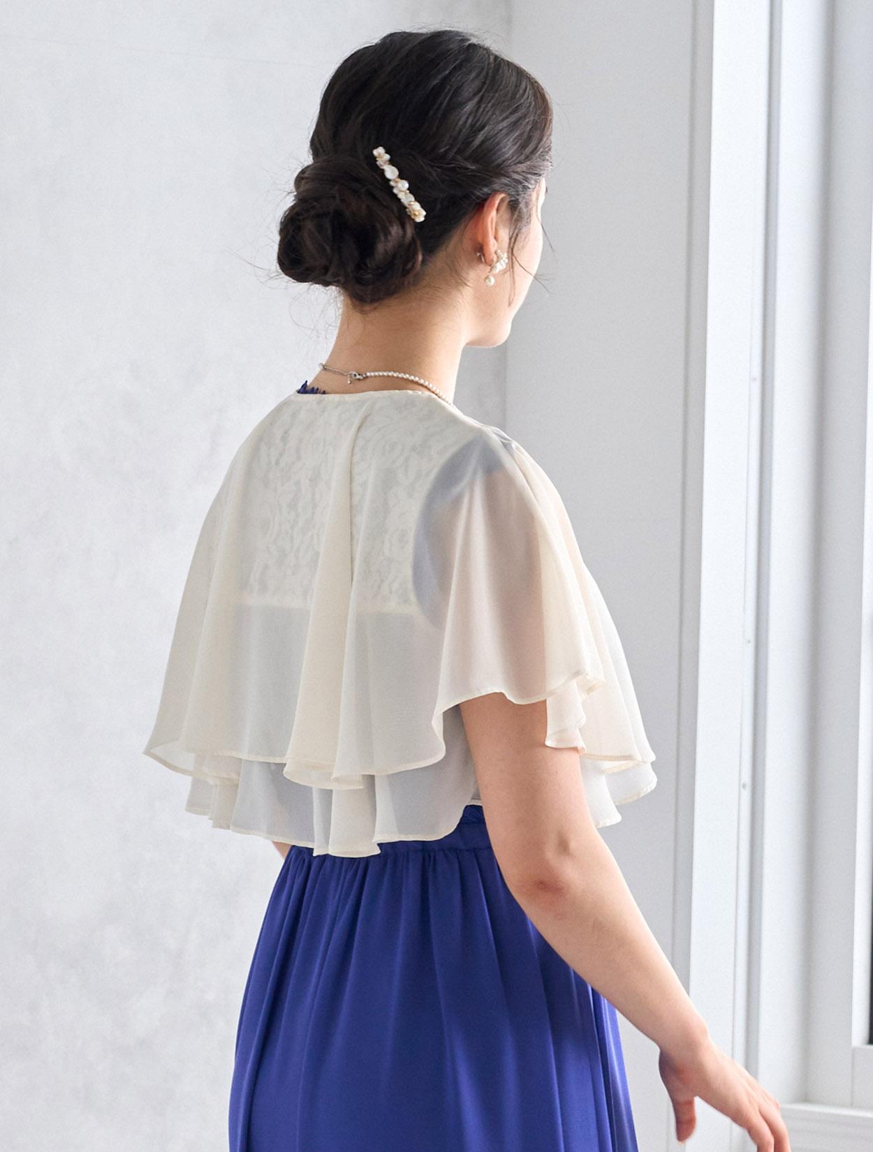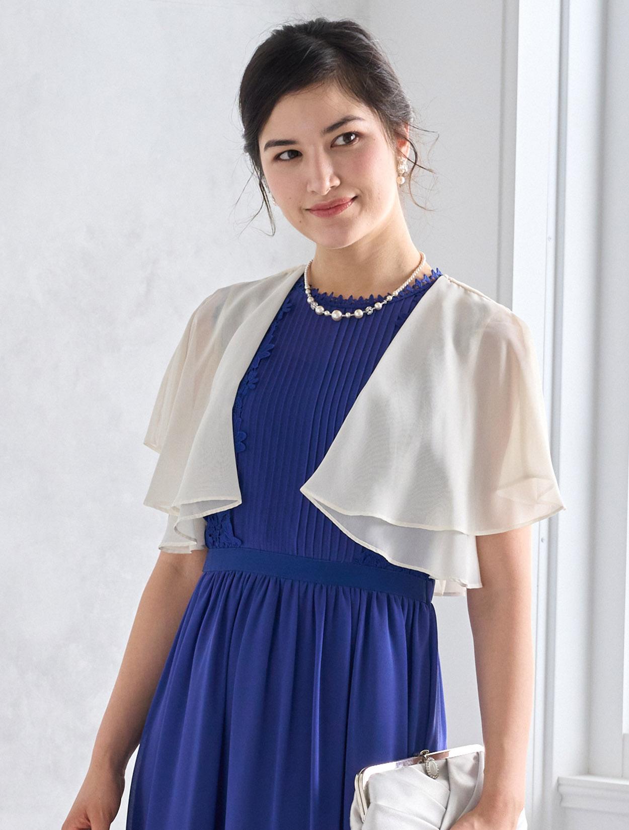 アイボリー系のシフォンボレロが爽やかなコーディネート。爽やかなブルー系のドレスもフェミニンな印象で着こなせるコーデです。