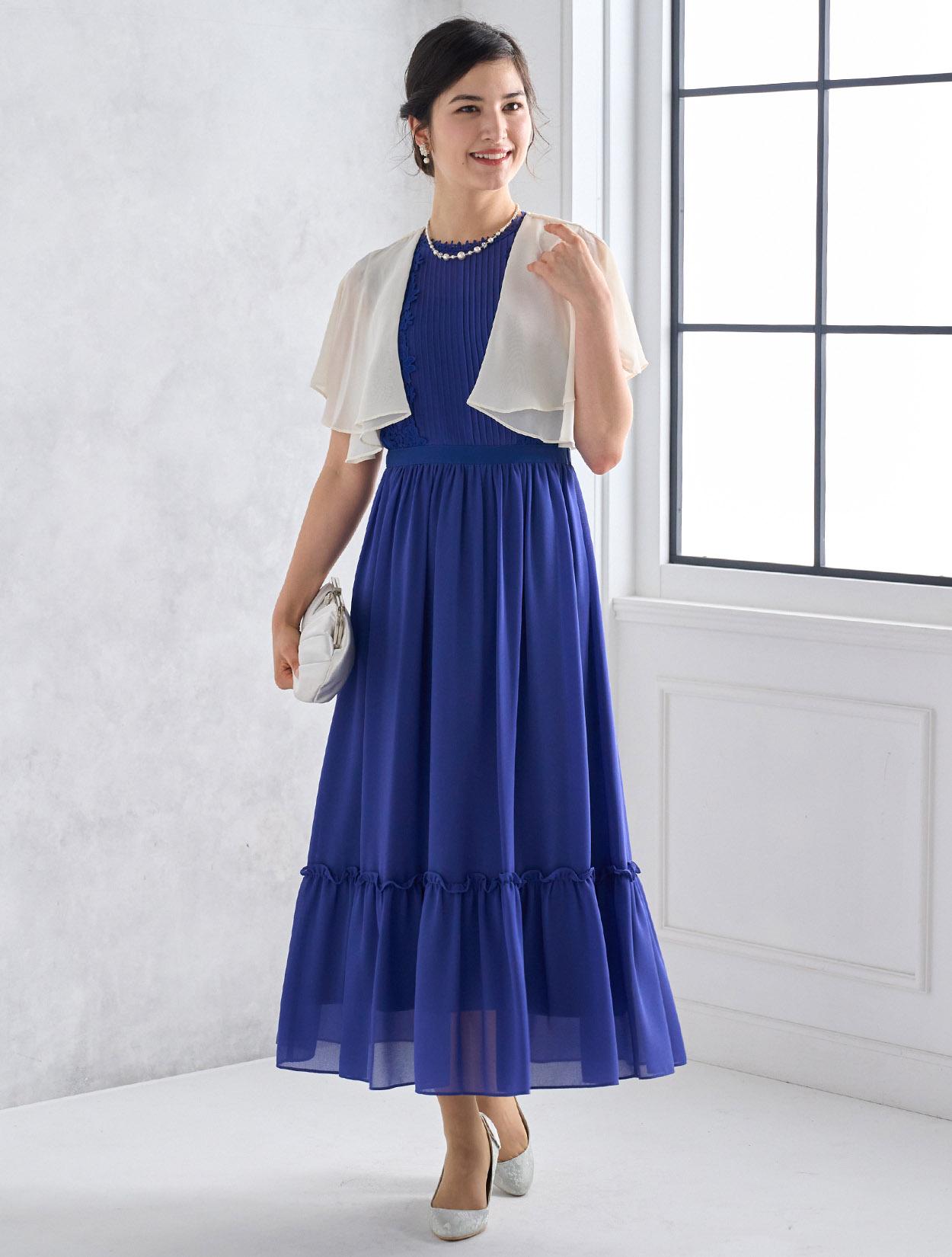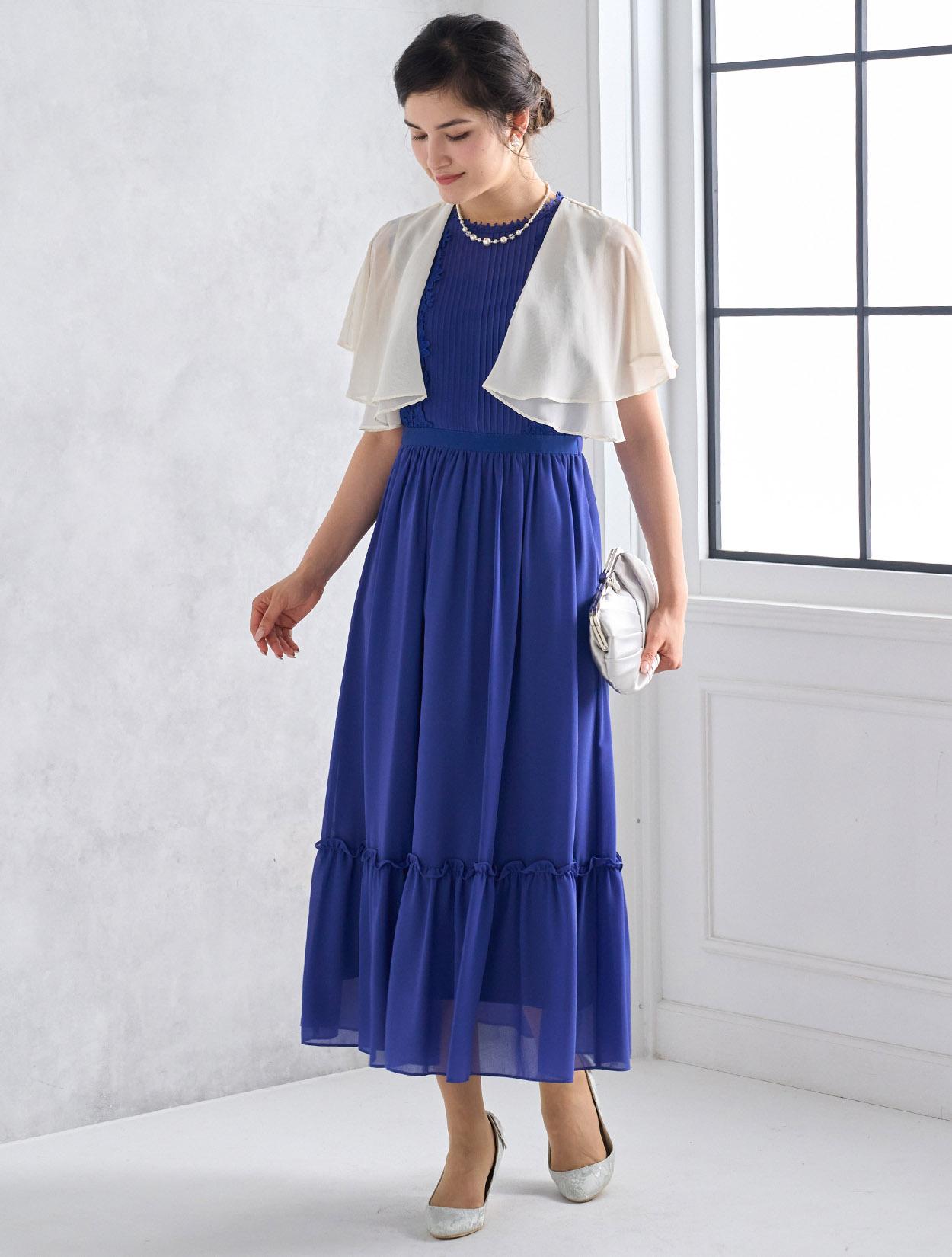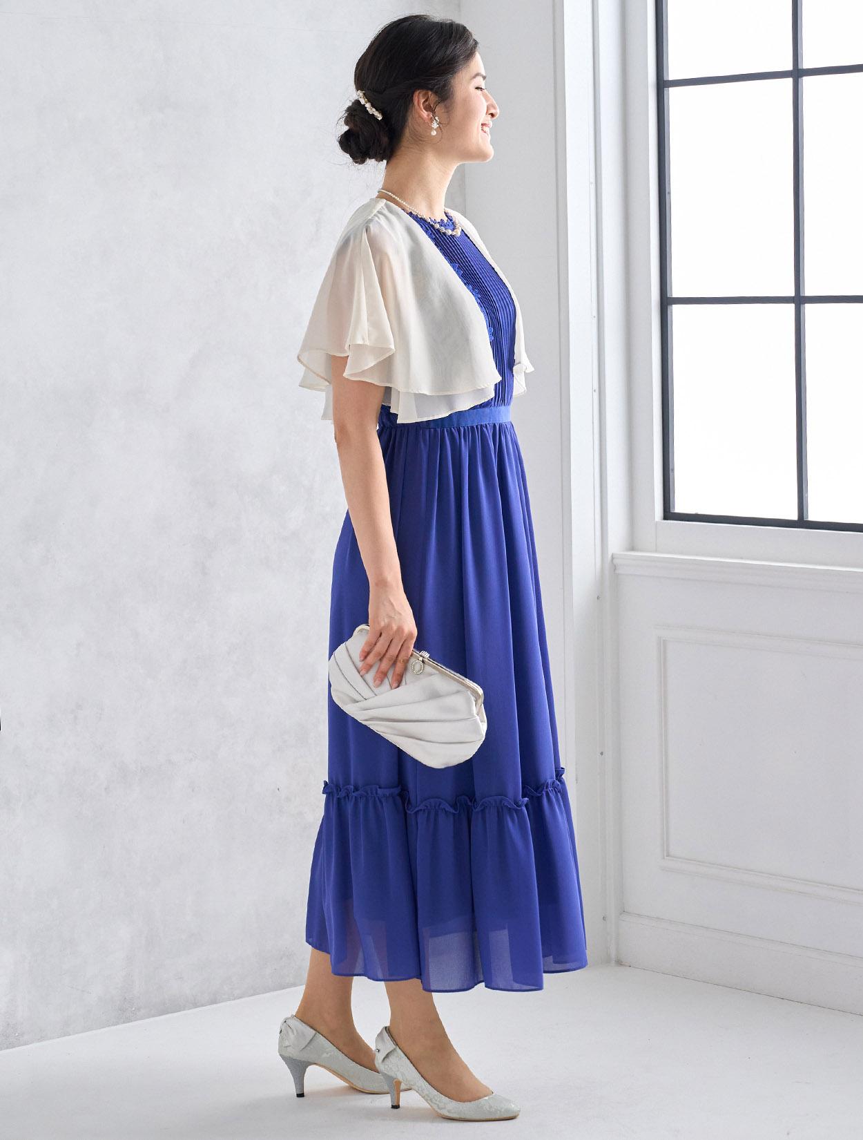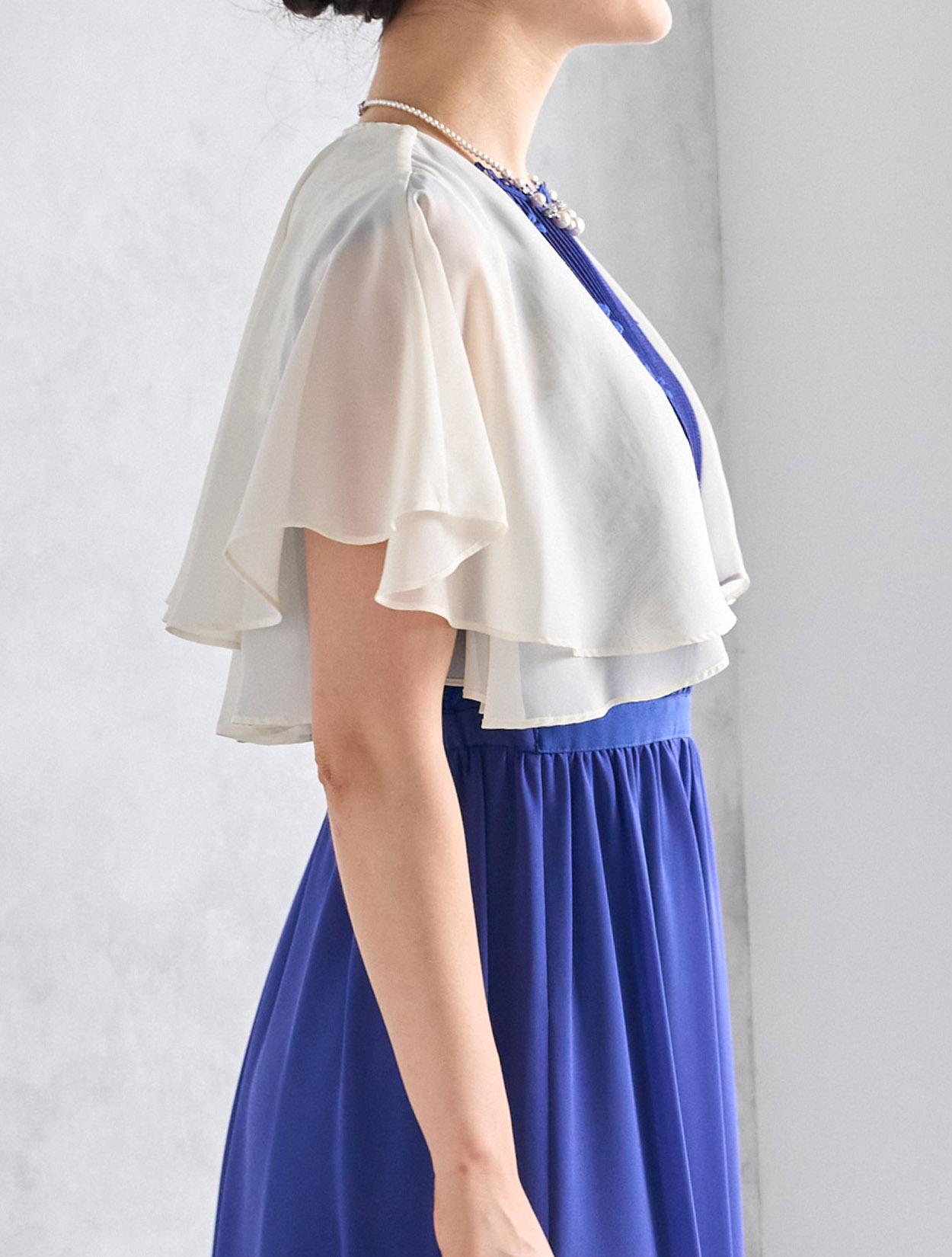アイボリー系のシフォンボレロが爽やかなコーディネート。爽やかなブルー系のドレスもフェミニンな印象で着こなせるコーデです。