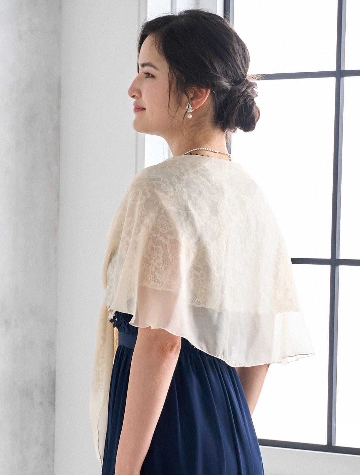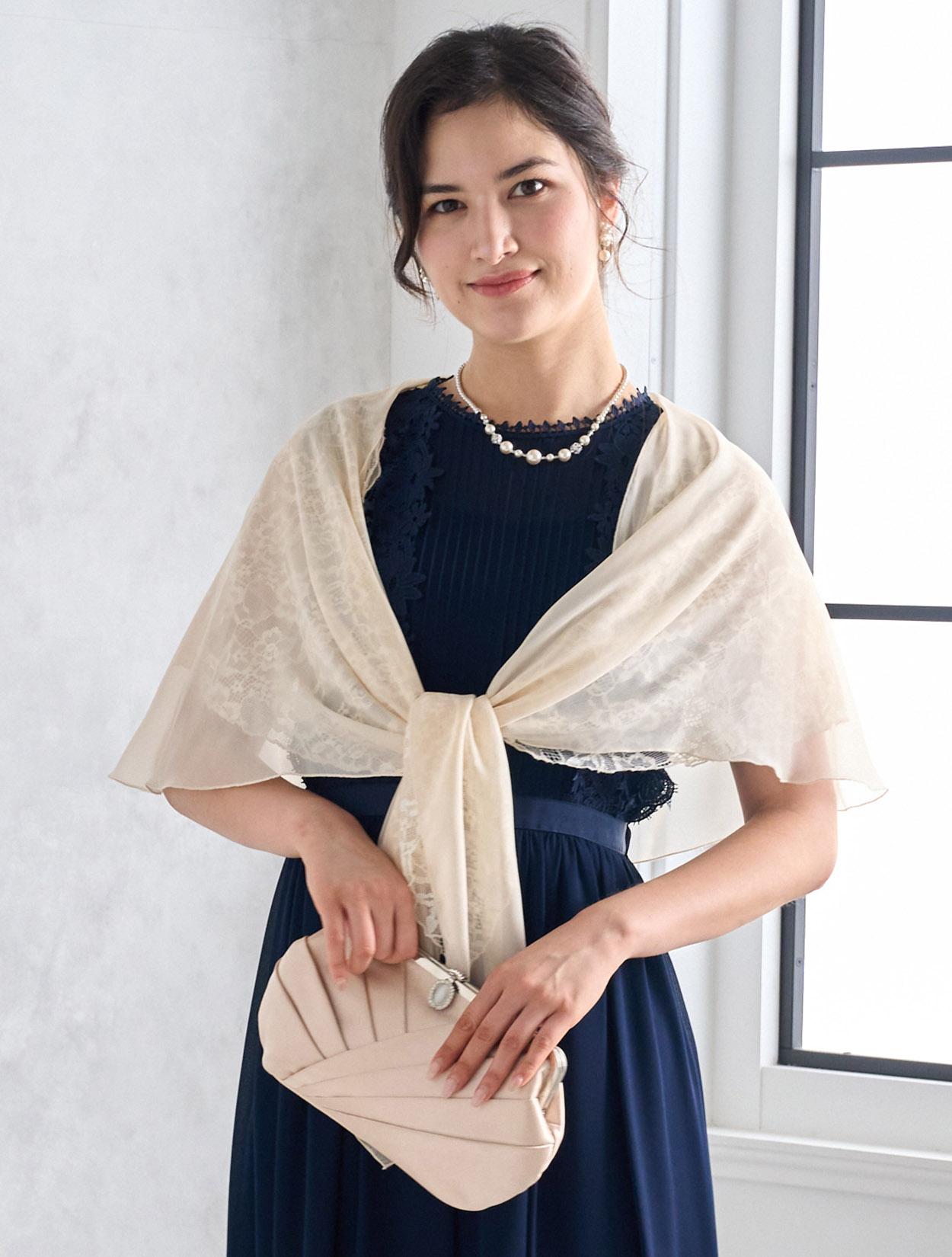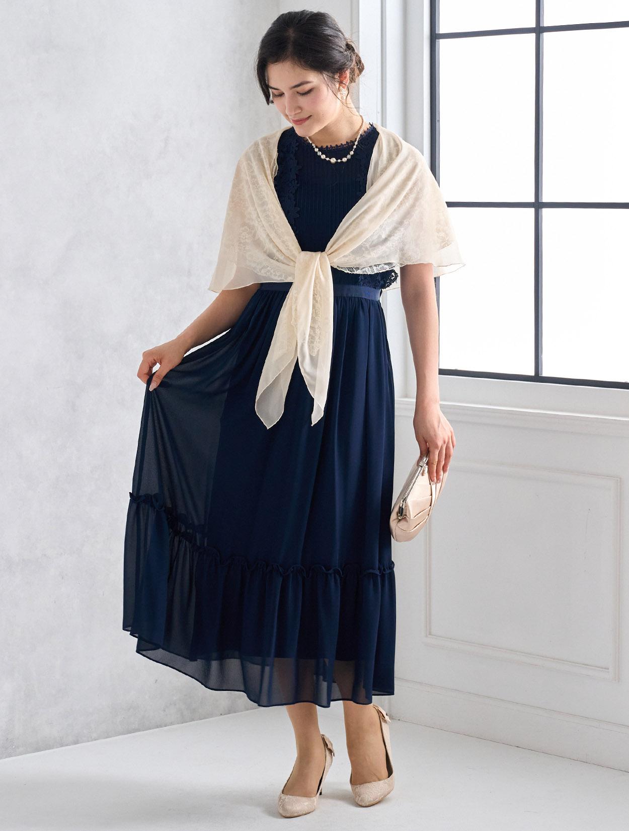 オーガンジーショールを合わせた上品コーデ。オーガンジーから透けるレースがネイビードレスを程よく華やかにしてくれます。袖通し付きのショールなので、着崩れの心配も不要です。20代のご親族ドレスとしてもおすすめです。