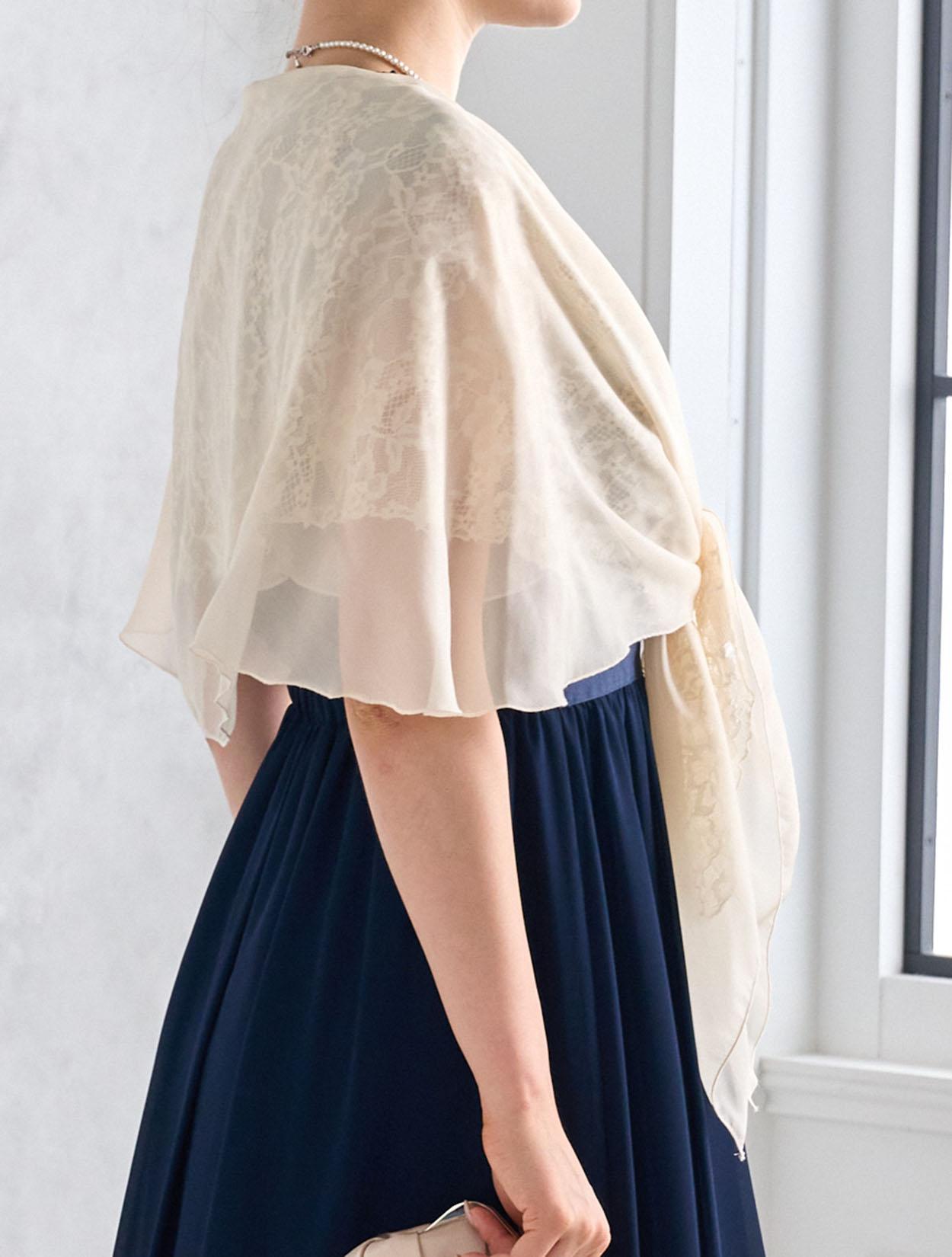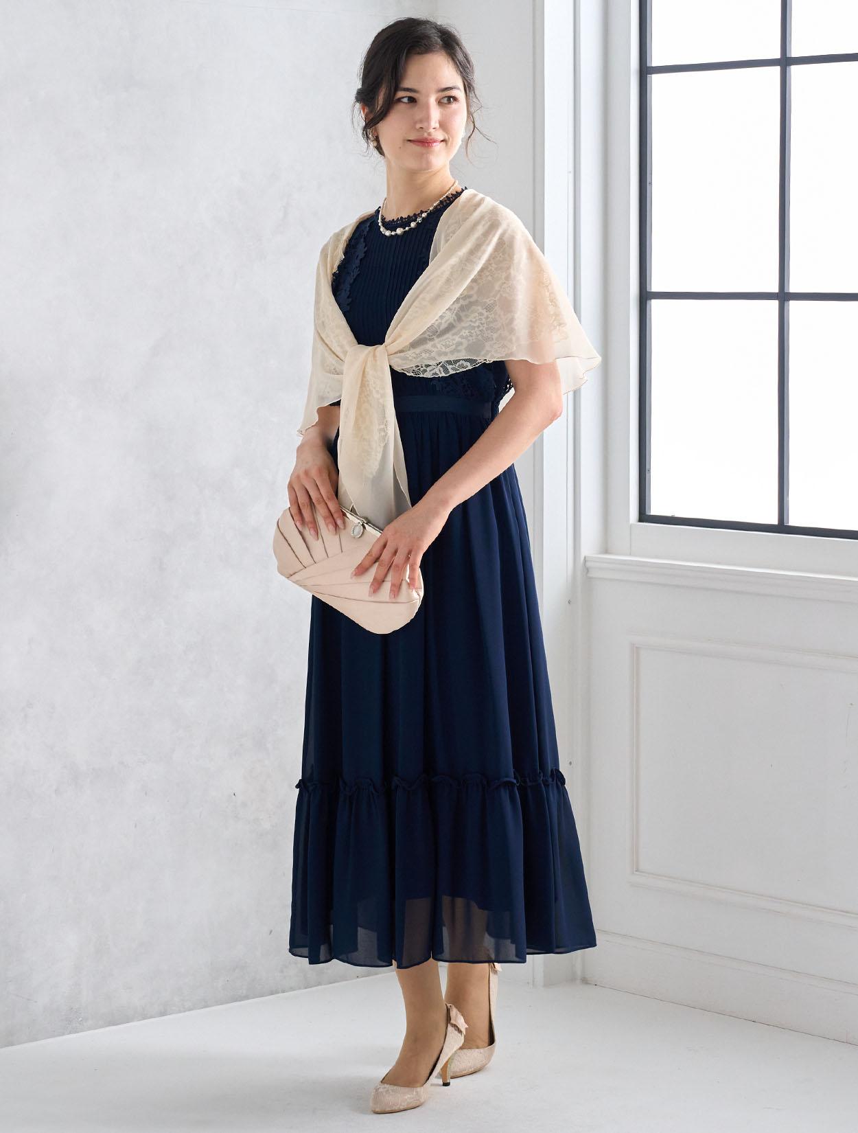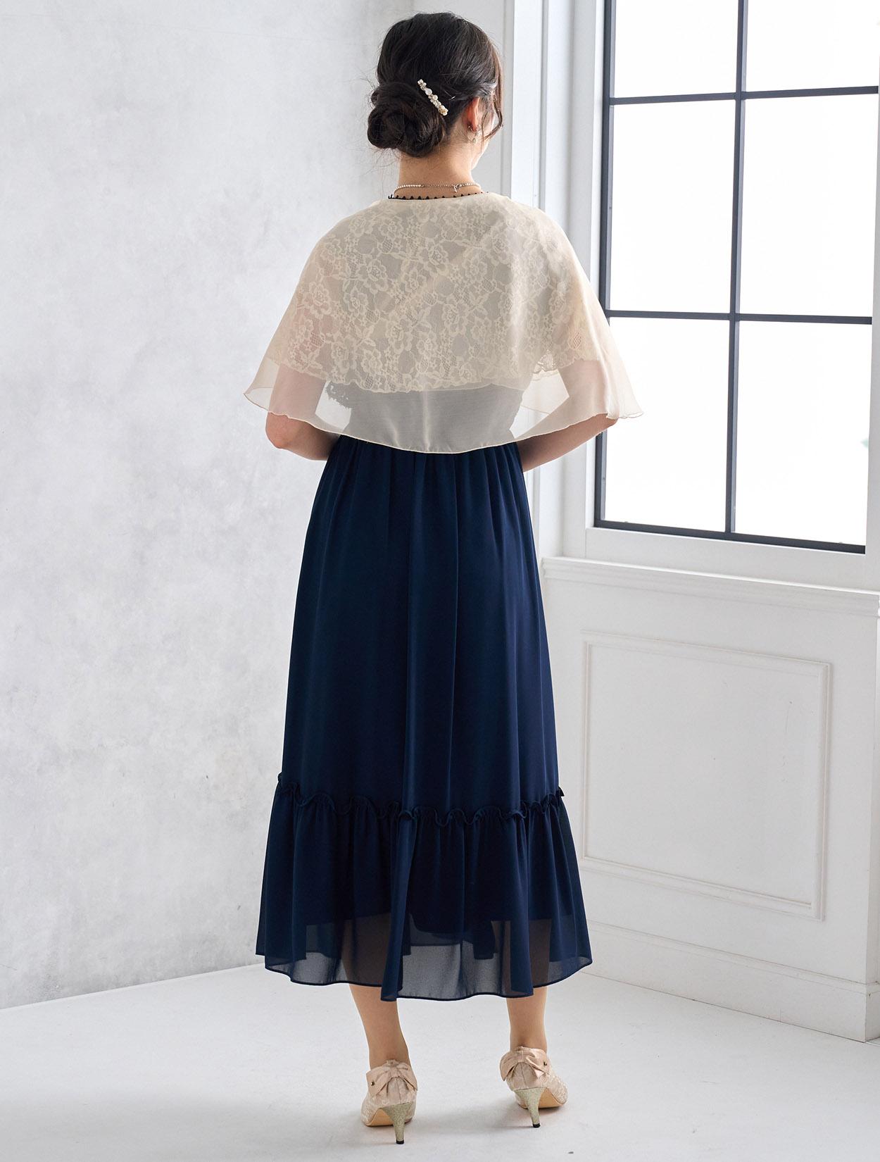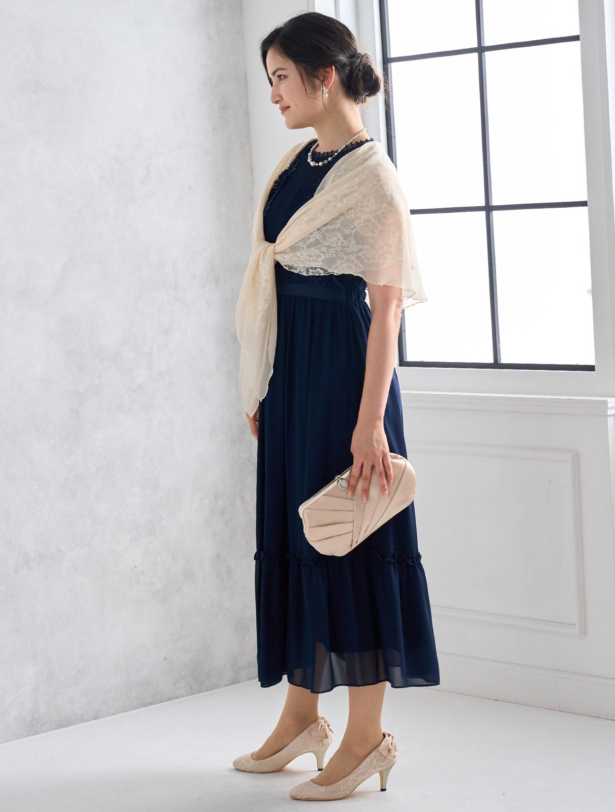 オーガンジーショールを合わせた上品コーデ。オーガンジーから透けるレースがネイビードレスを程よく華やかにしてくれます。袖通し付きのショールなので、着崩れの心配も不要です。20代のご親族ドレスとしてもおすすめです。