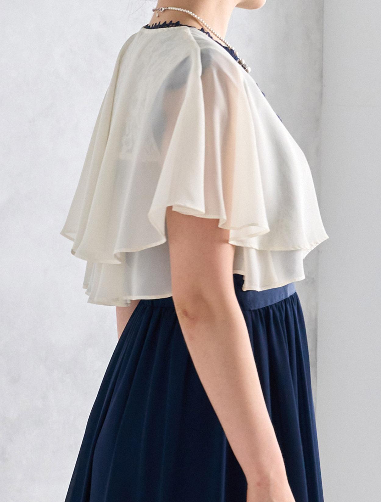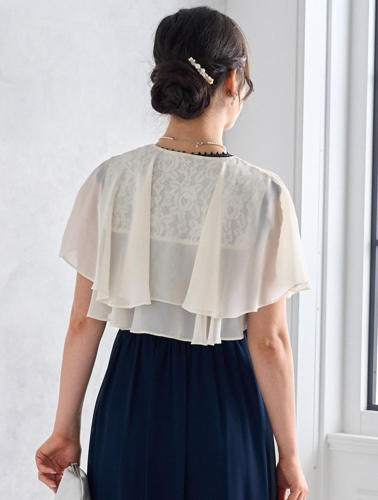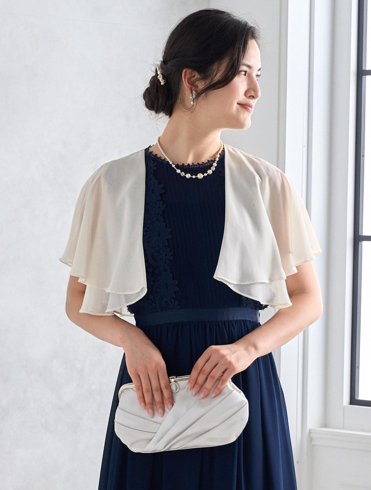 爽やかなアイボリー系のシフォンボレロがネイビードレスを軽やかに見せてくれるコーディネート。バッグはシルバーで全知的にスッキリした印象に。