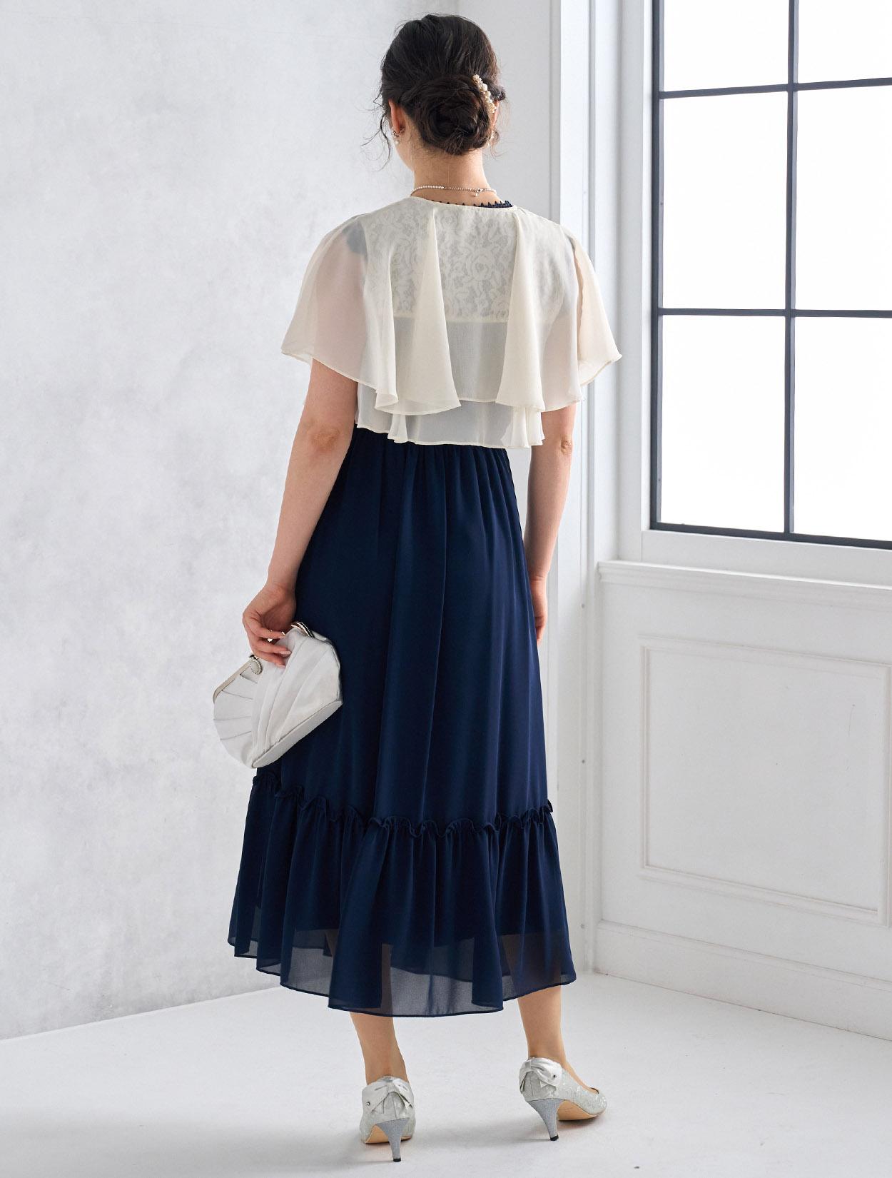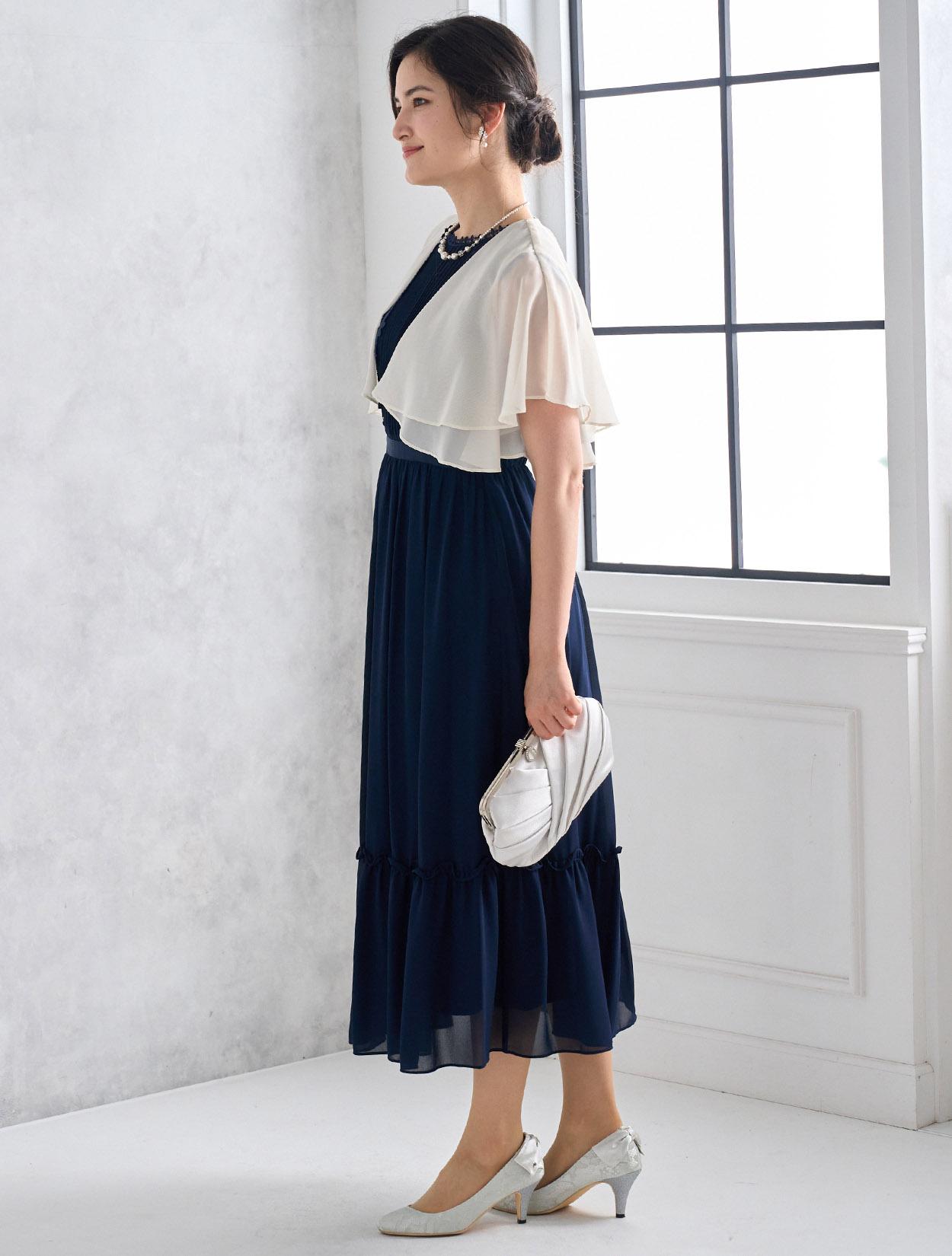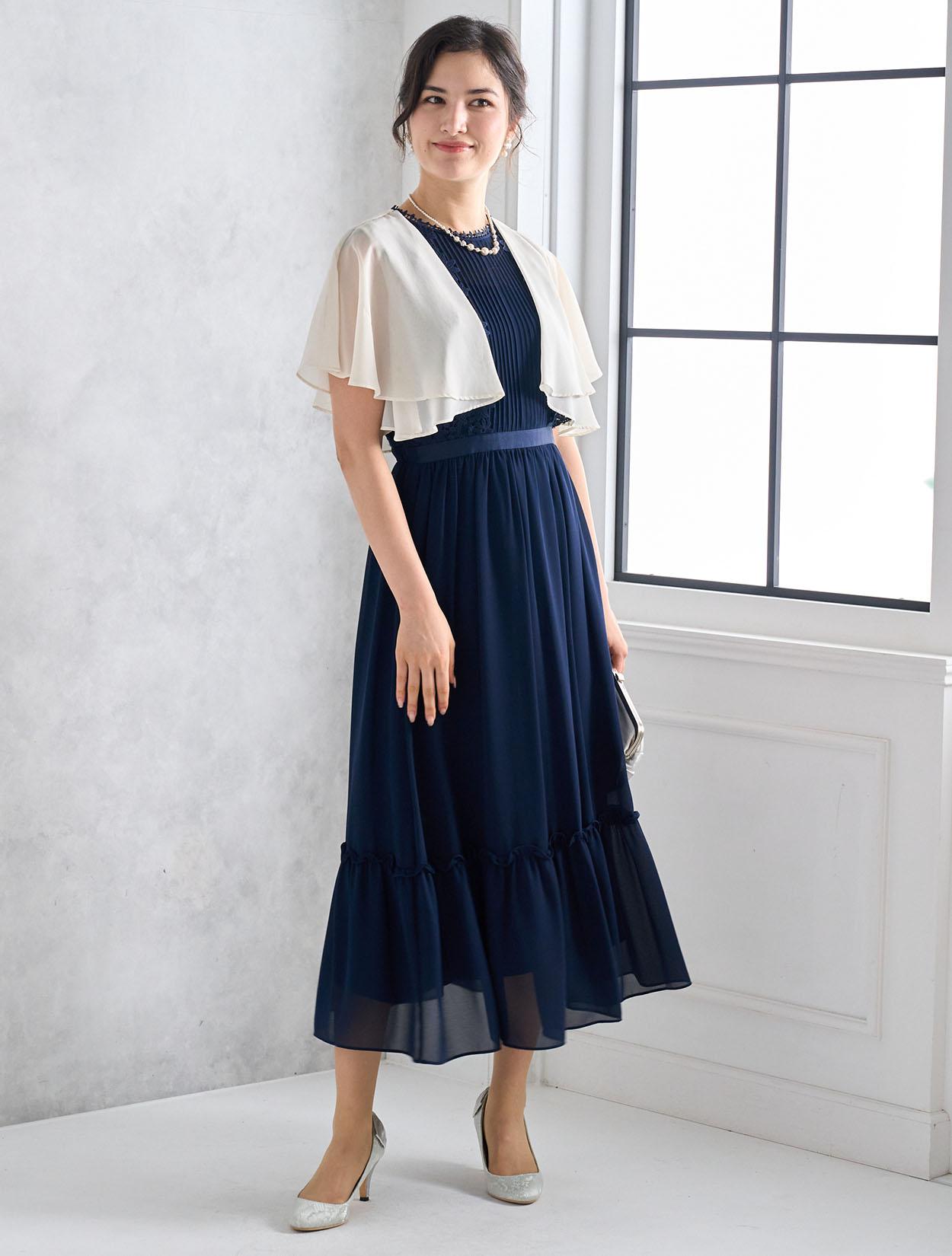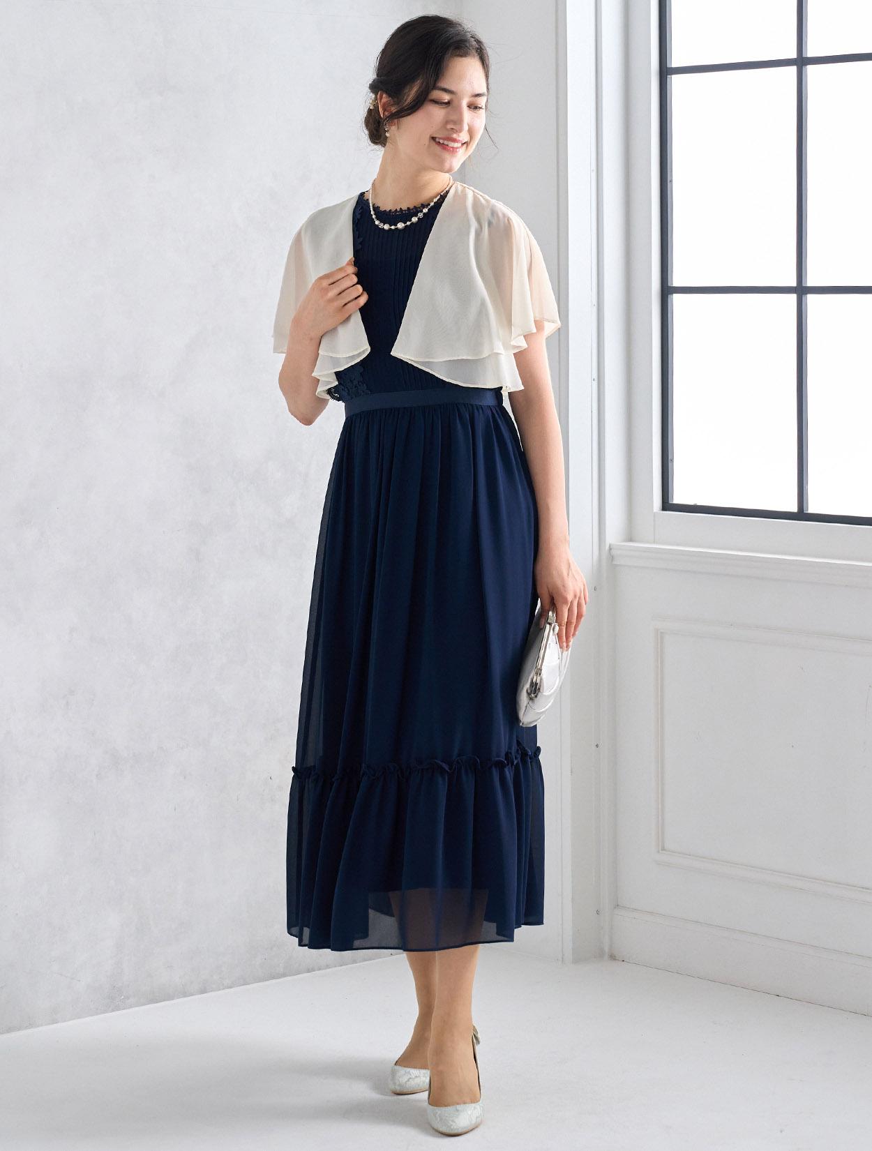 爽やかなアイボリー系のシフォンボレロがネイビードレスを軽やかに見せてくれるコーディネート。バッグはシルバーで全知的にスッキリした印象に。