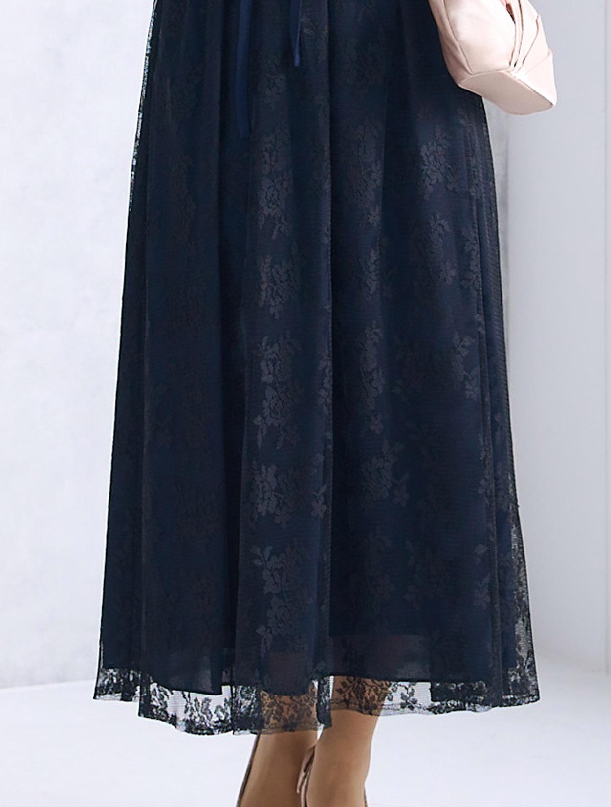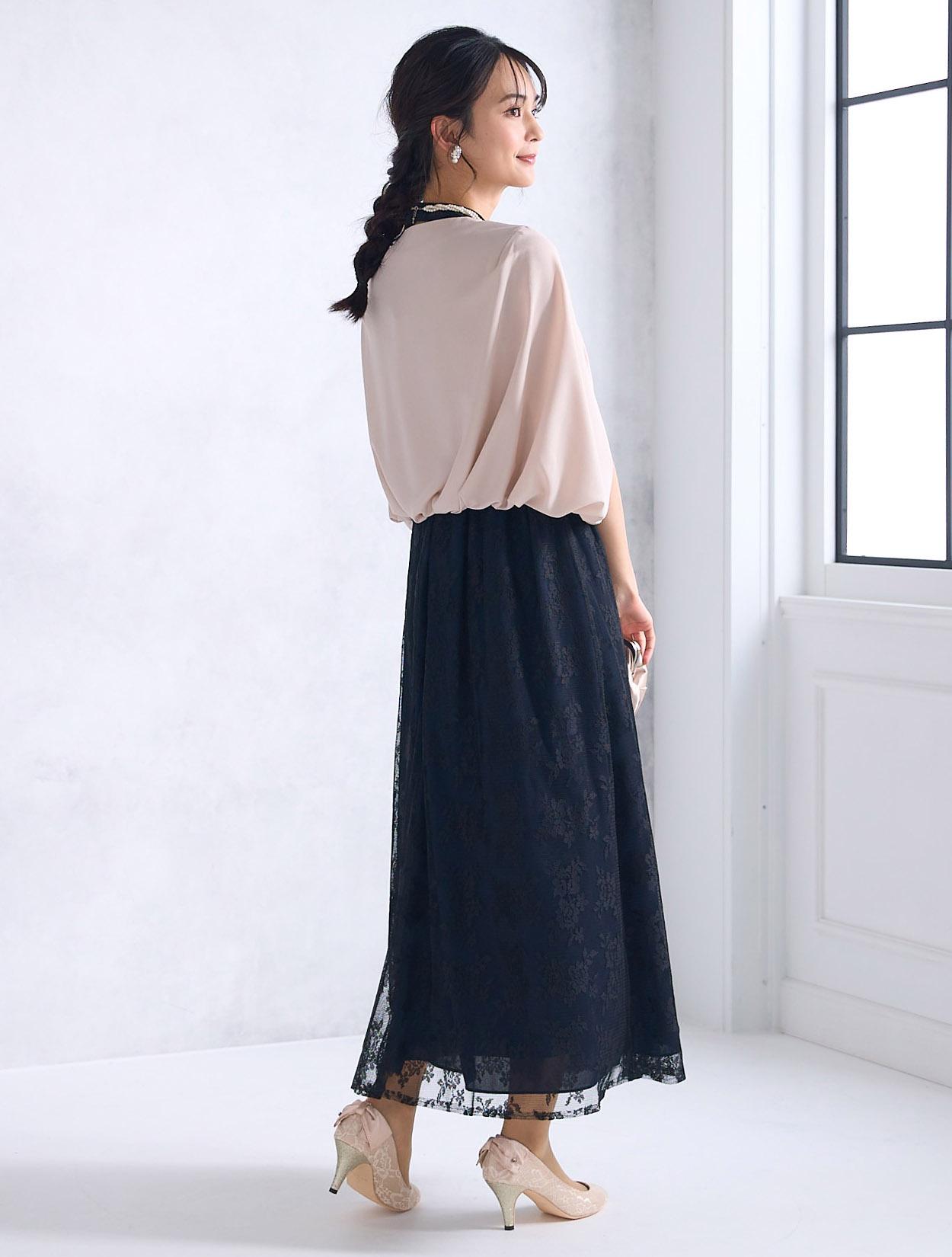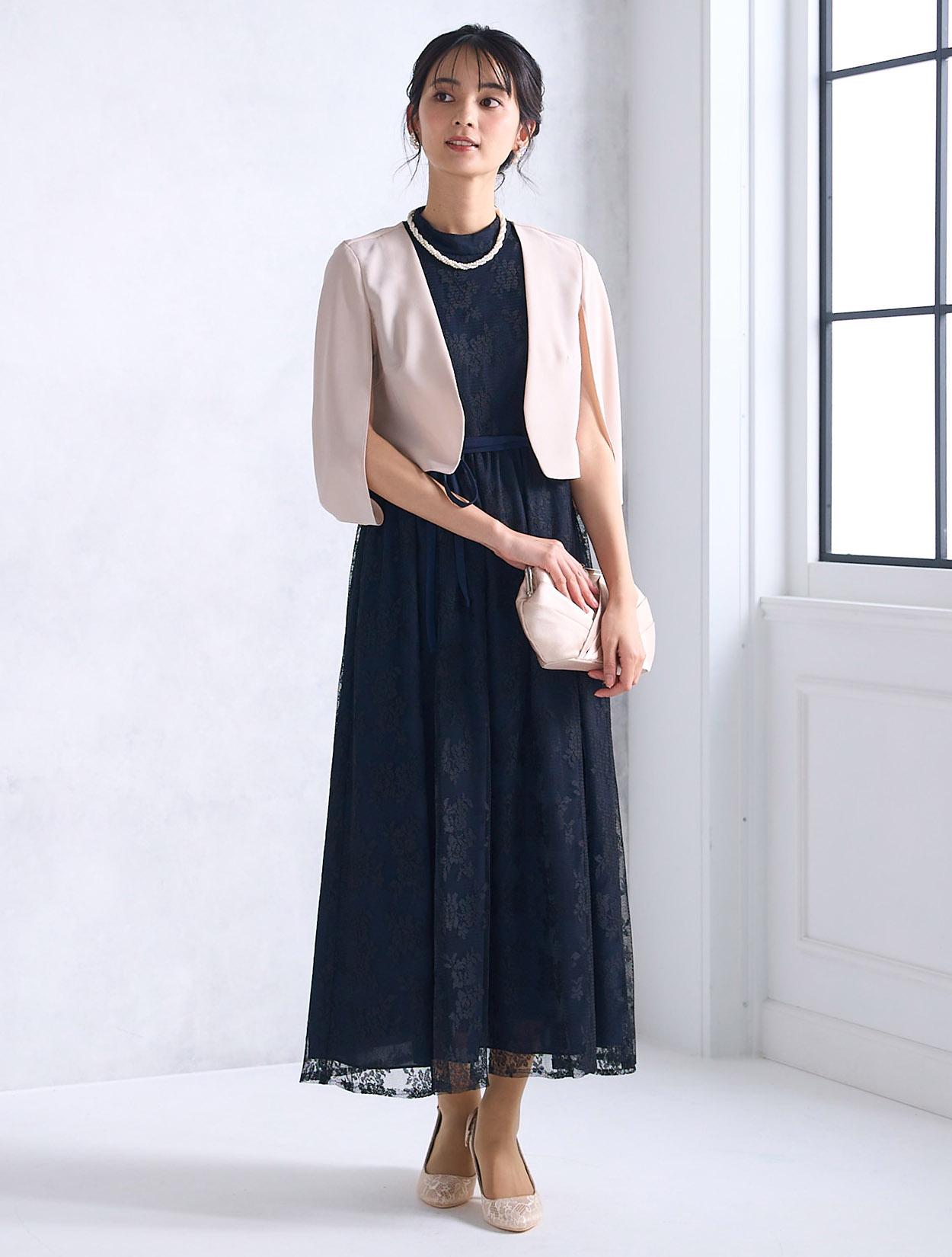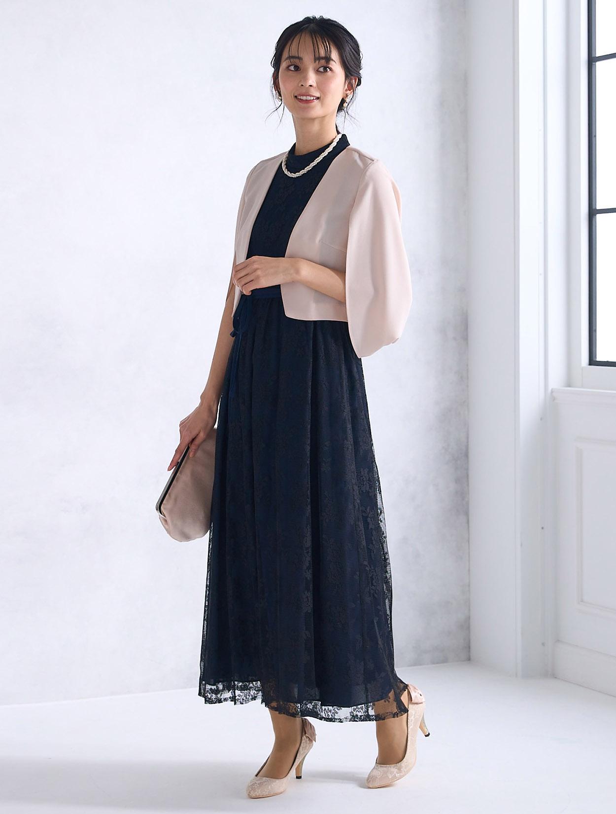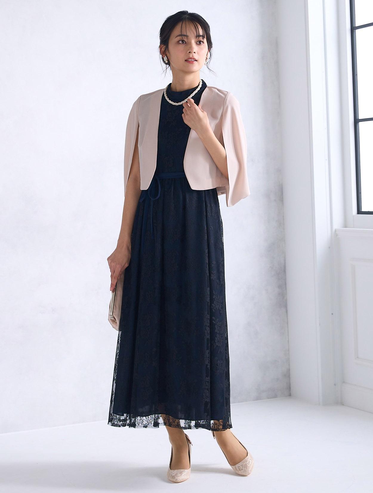 フラワー柄が華やかなメッシュレースが目を引くドレス。ハイウエストの切り替えと、ウエストマークがスタイルアップ効果抜群。ハイウエスト切り替えは、身長が高くない方でもウエスト位置が合いやすく、155㎝以上の方なら着用可能です。ボトルネックデザインは、クラシカルな印象で、露出を抑えた上品な着こなしが出来るのがポイントです。デコルテが華奢な方でもきれいに着られます。三角に開いたバックスタイルも個性的。パーティーなど、肩を隠さなくても良い場面では、一枚で着てバックスタイルを見せるのも◎。