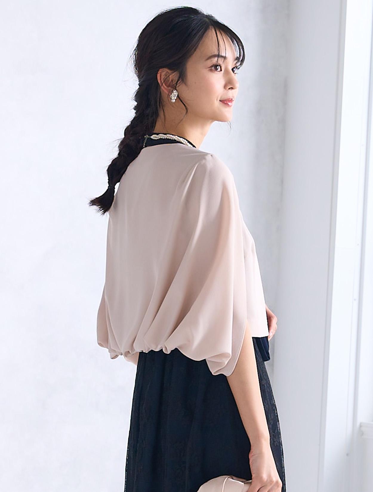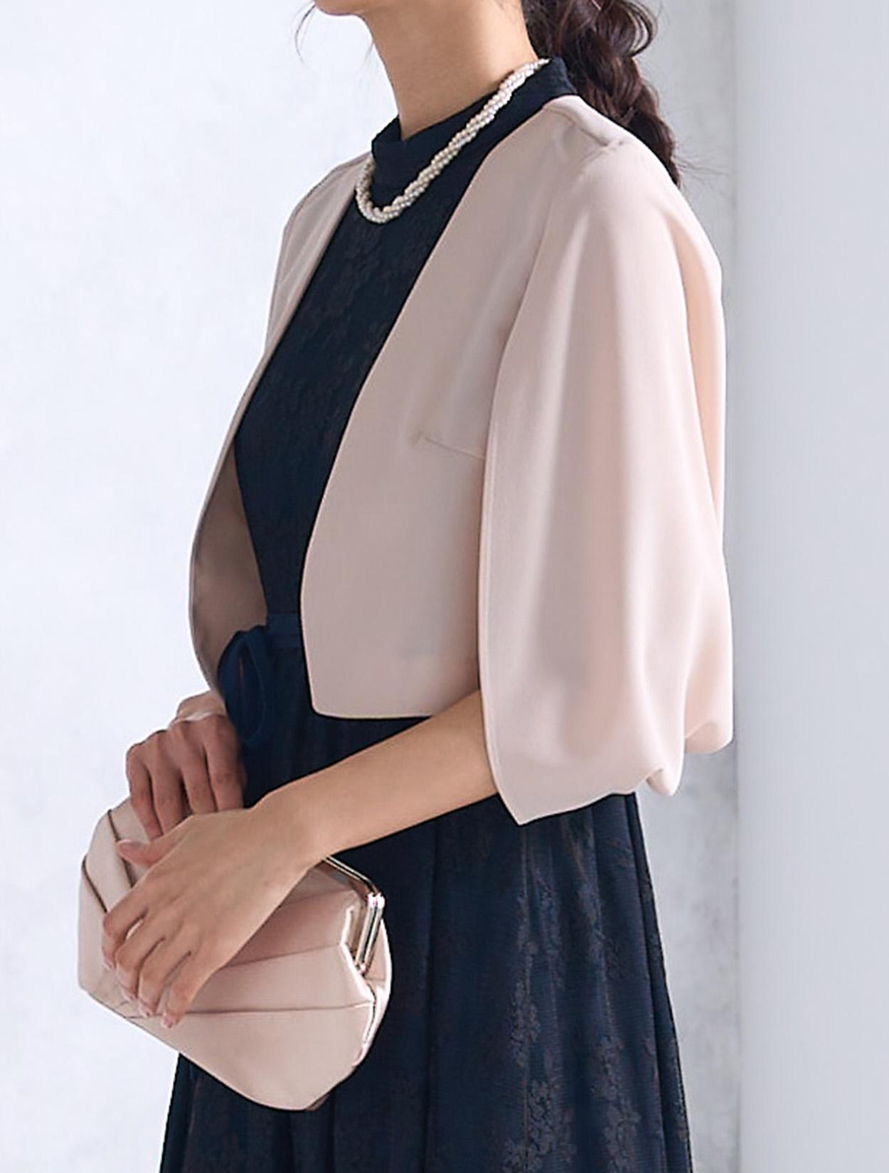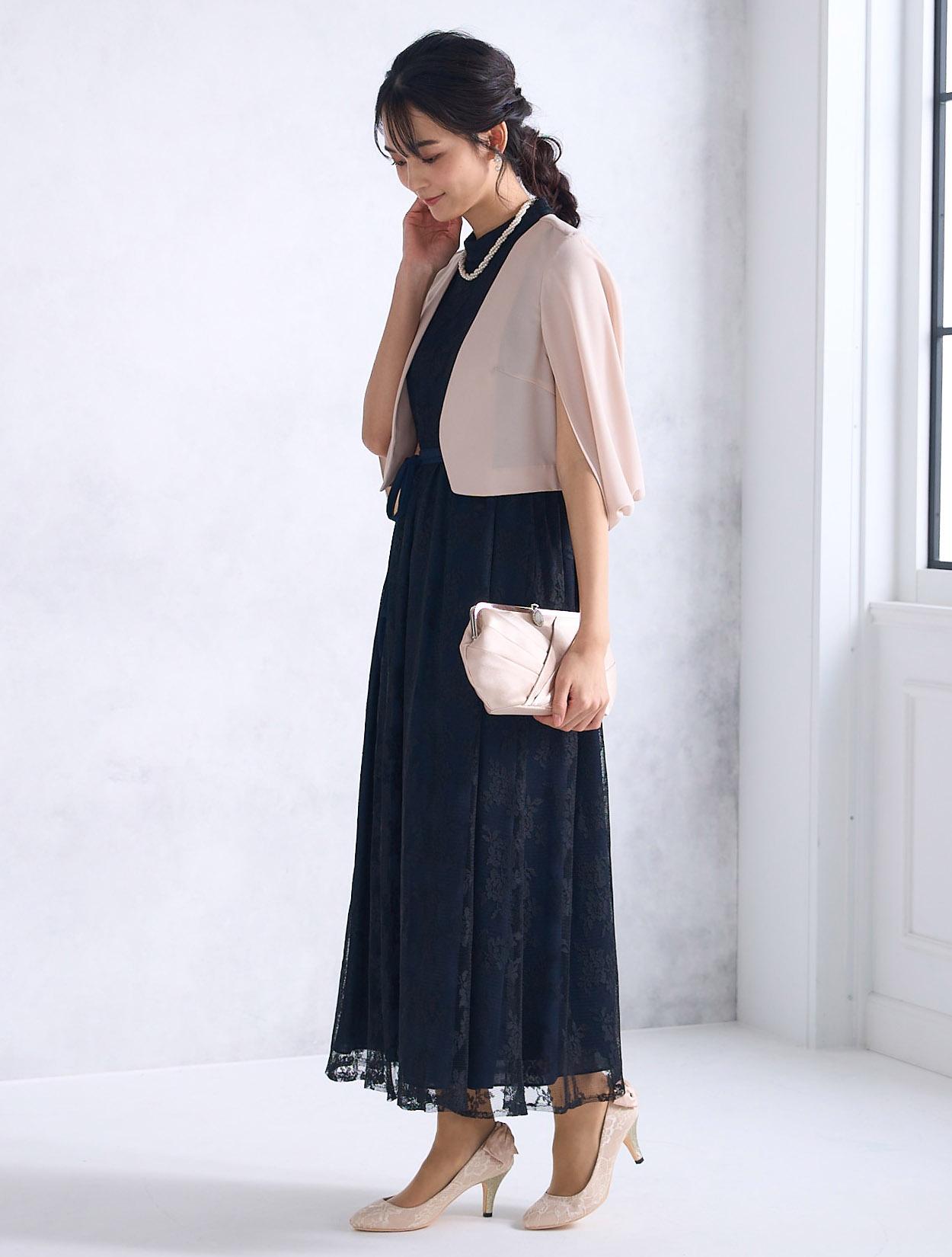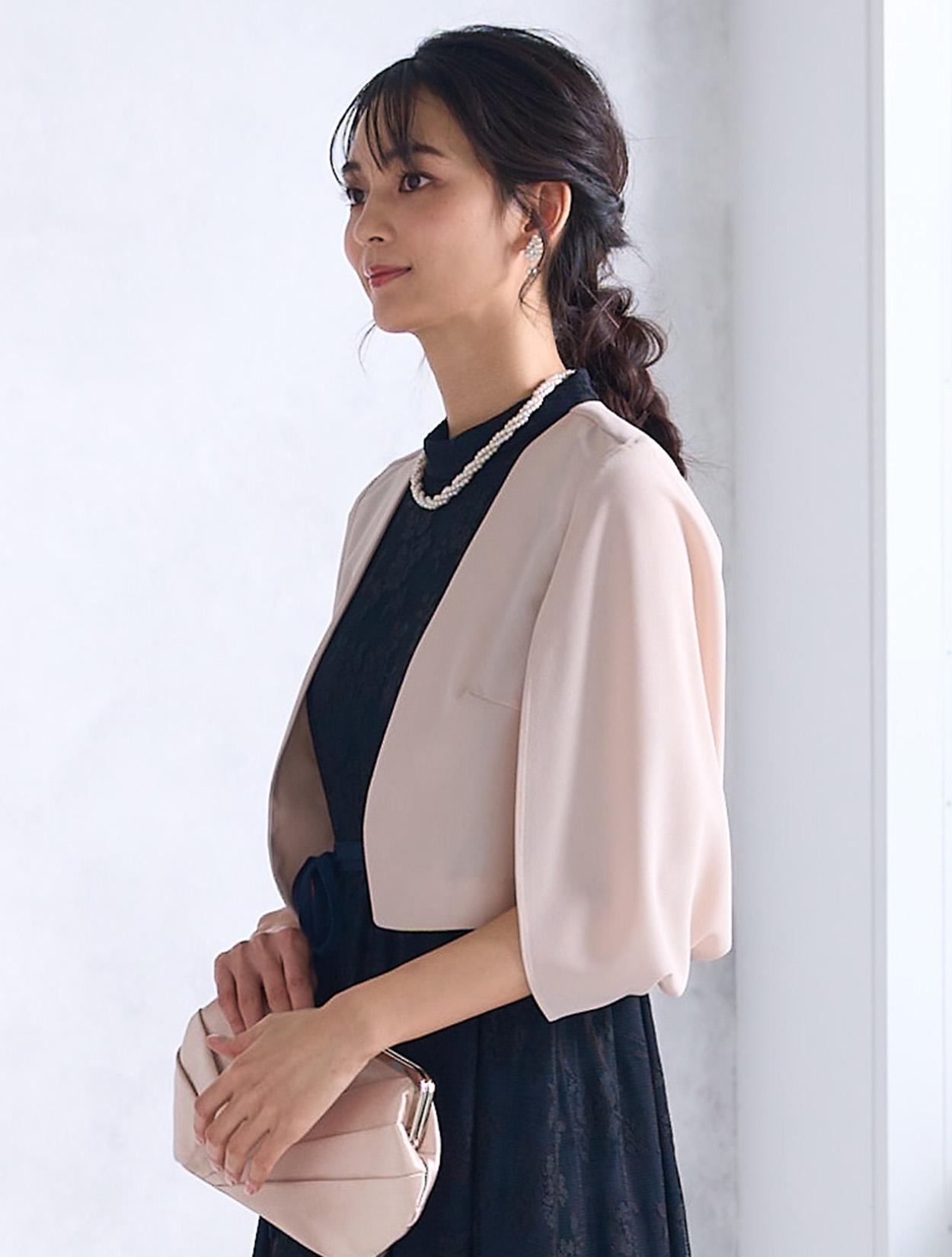 ケープ風のジャケットを合わせたきちんと感のあるコディネート。露出が少なく上品な印象のコーディネートは、親族や受付、神社などでの神前式にもおすすめです。