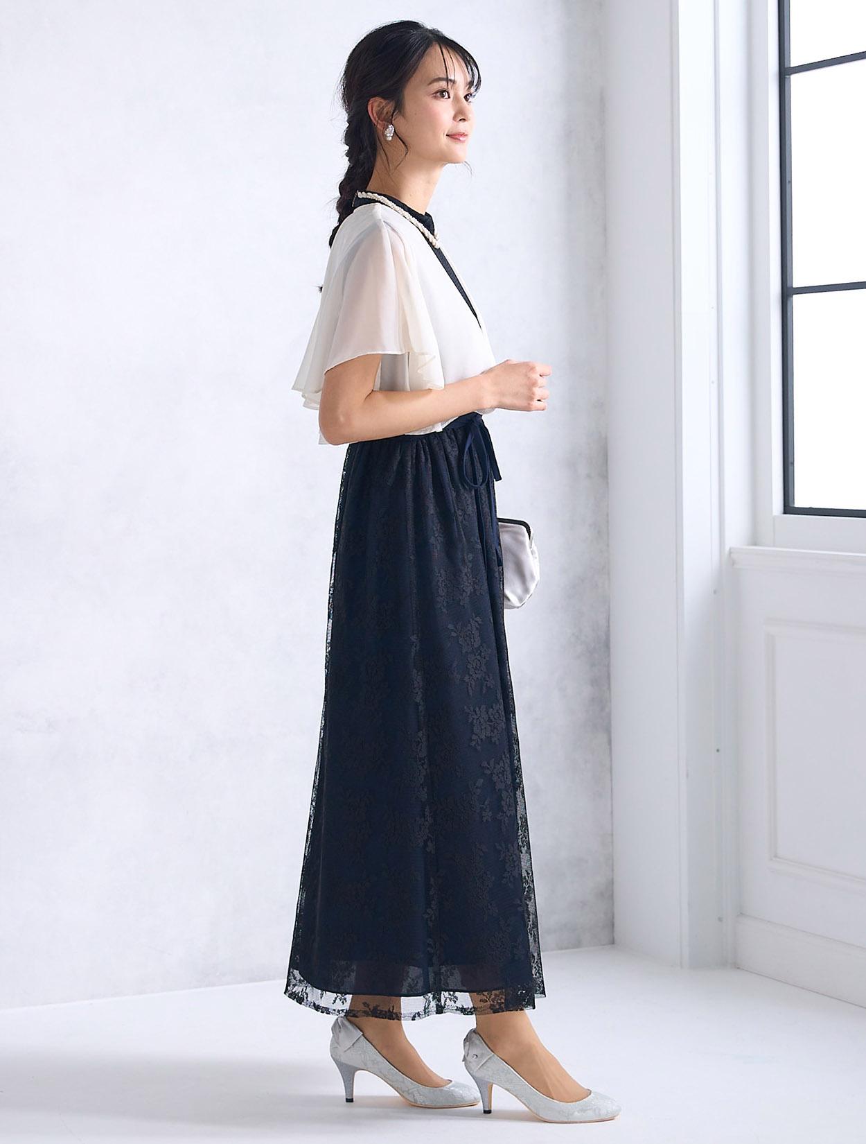 フラワー柄が華やかなメッシュレースが目を引くドレス。ハイウエストの切り替えと、ウエストマークがスタイルアップ効果抜群。ハイウエスト切り替えは、身長が高くない方でもウエスト位置が合いやすく、155㎝以上の方なら着用可能です。ボトルネックデザインは、クラシカルな印象で、露出を抑えた上品な着こなしが出来るのがポイントです。デコルテが華奢な方でもきれいに着られます。三角に開いたバックスタイルも個性的。パーティーなど、肩を隠さなくても良い場面では、一枚で着てバックスタイルを見せるのも◎。
