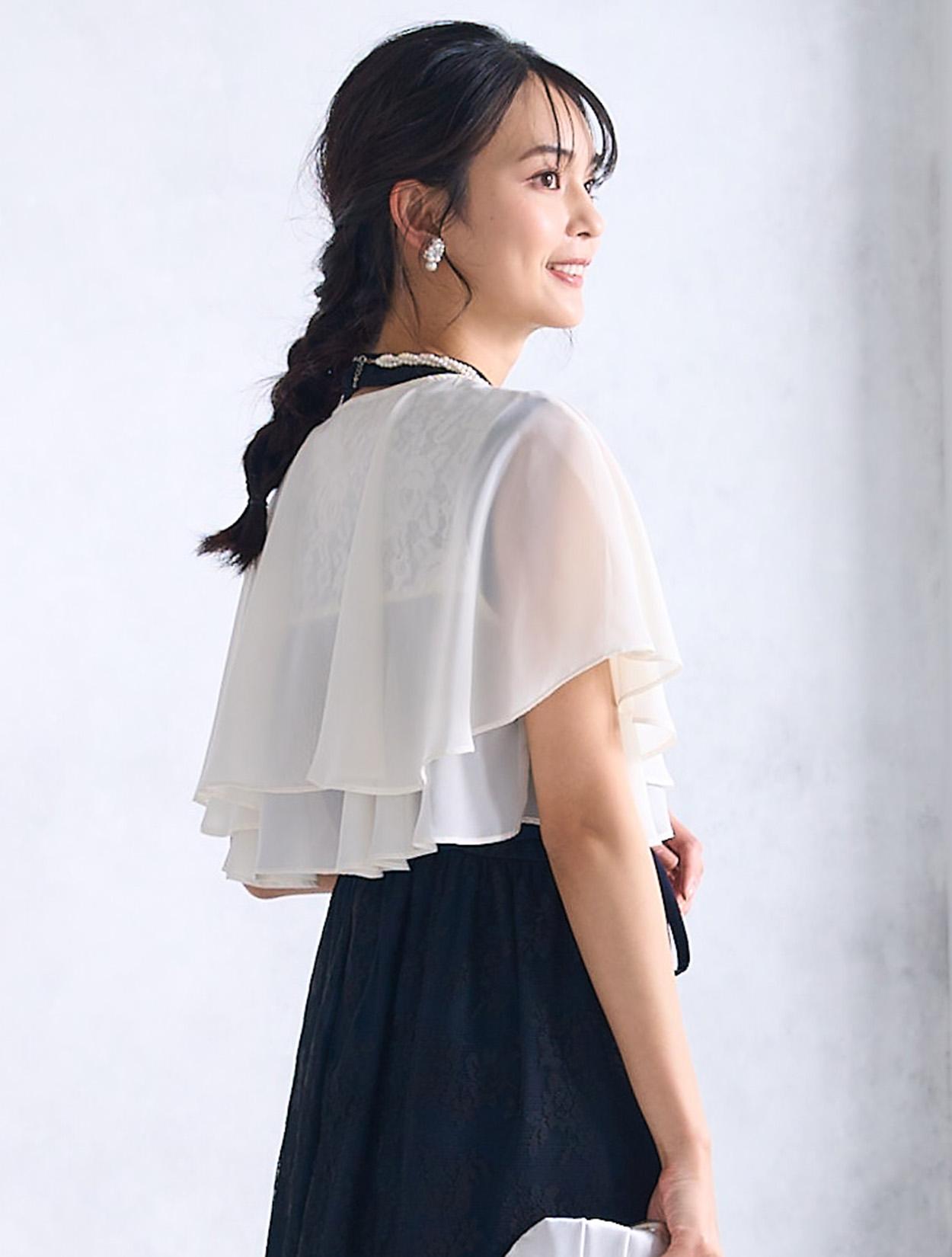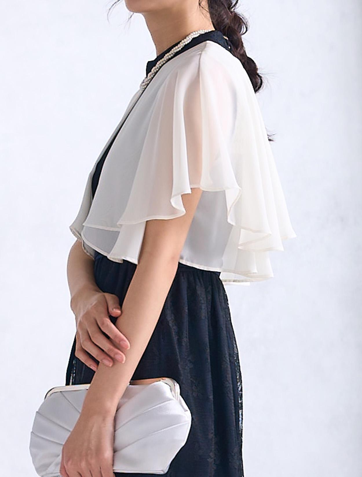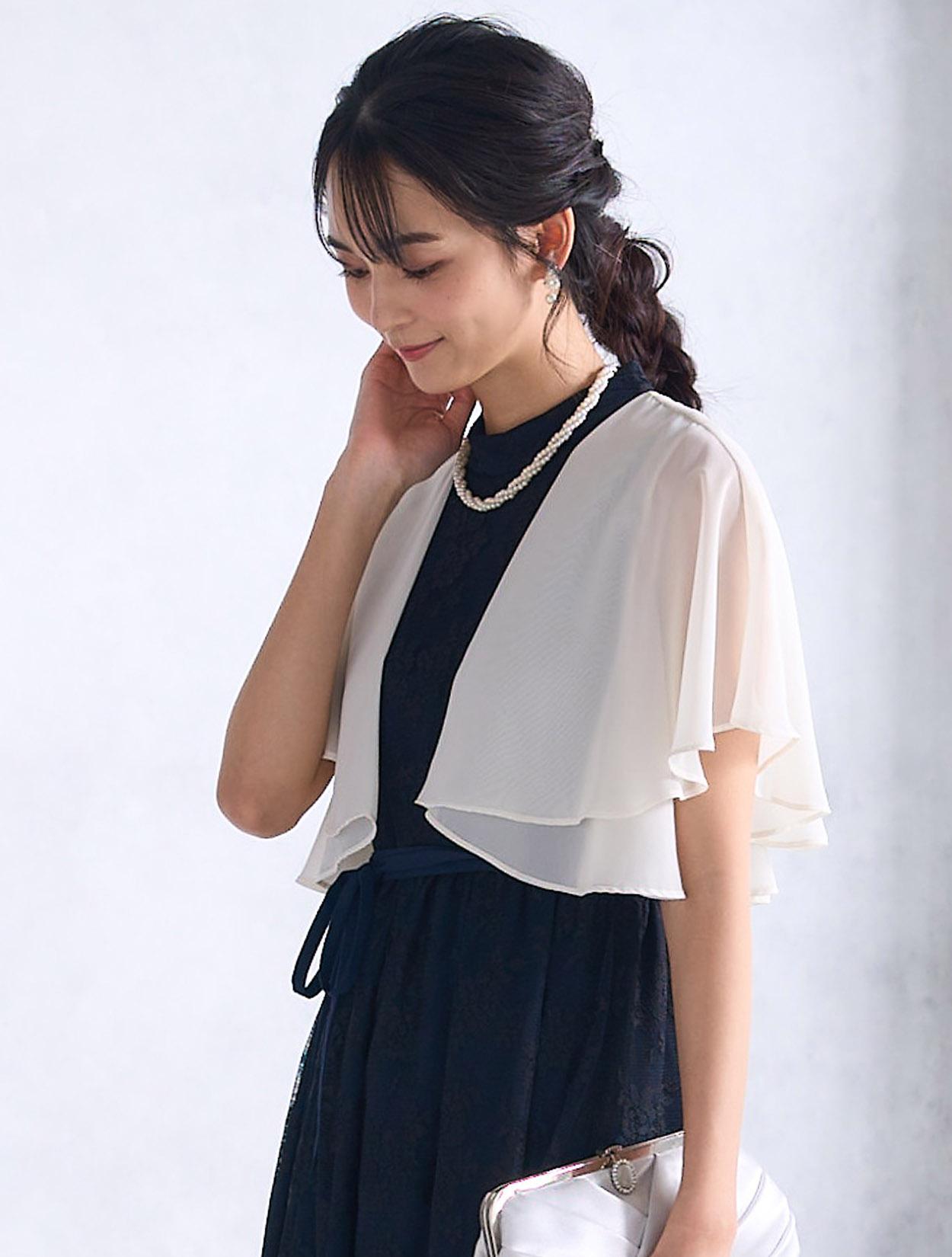 アイボリー系のシフォンボレロを合わせた爽やかなコーディネートです。ダークカラーのドレスでも重たくなりすぎないコーデで、落ち着いたカラーのドレスもフェミニンに着こなせます。