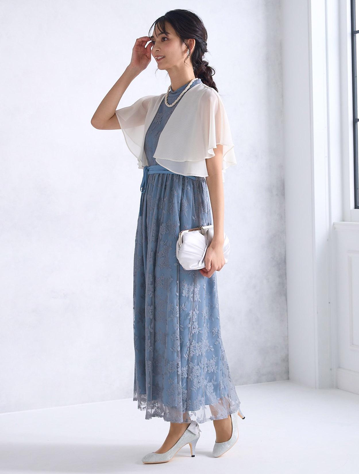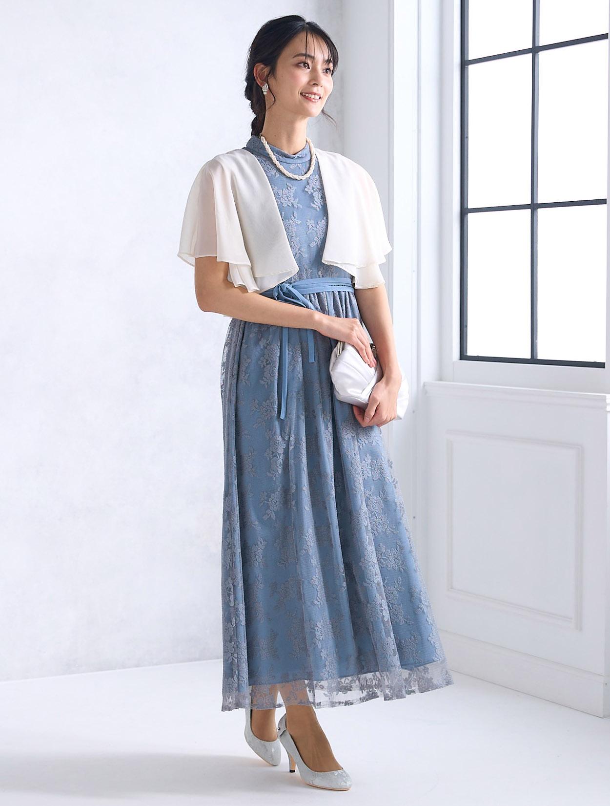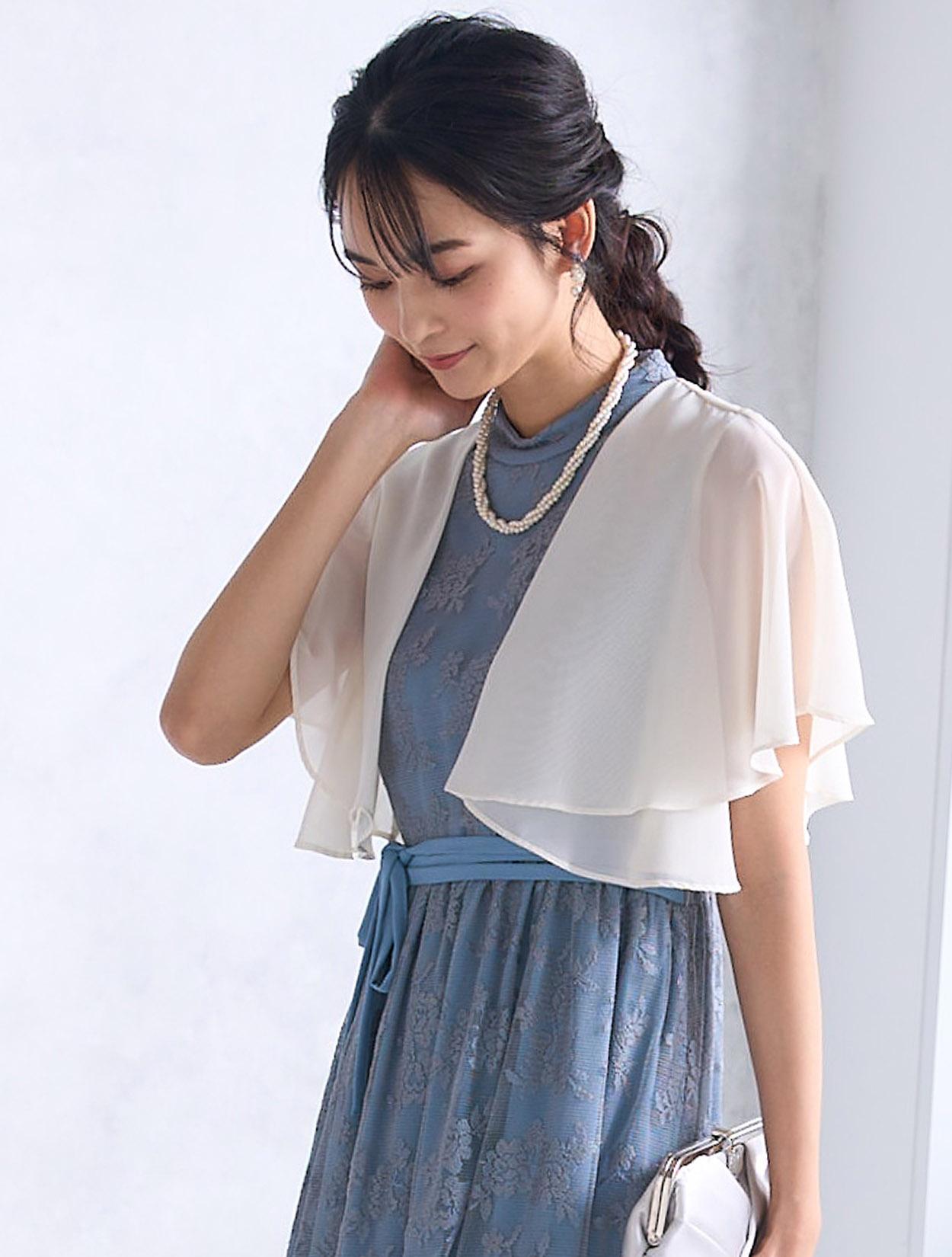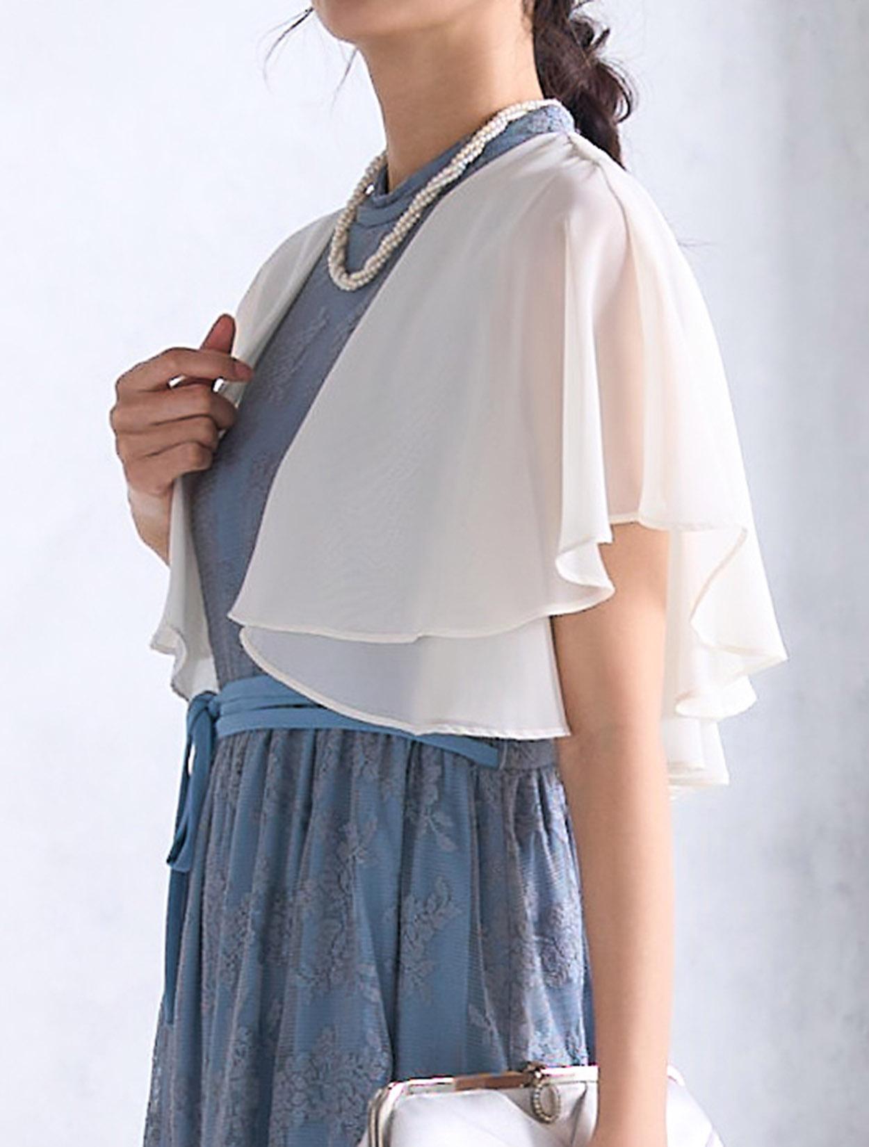 すっきりとしたアイボリーのボレロは寒色系のブルードレスにぴったり。ボレロはシフォンの軽い素材なので、ロング丈のドレスでも重たく見えないコーディネートです。また、シンプルなデザインなのでドレスの総レースの柄がキレイに引き立ちます。
