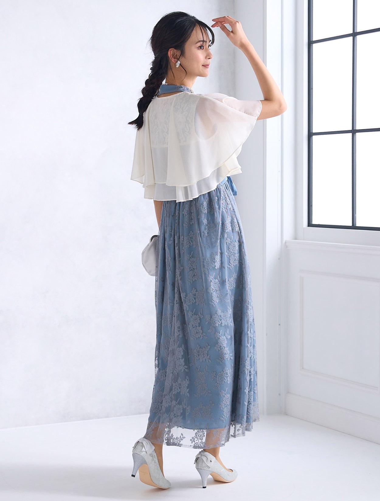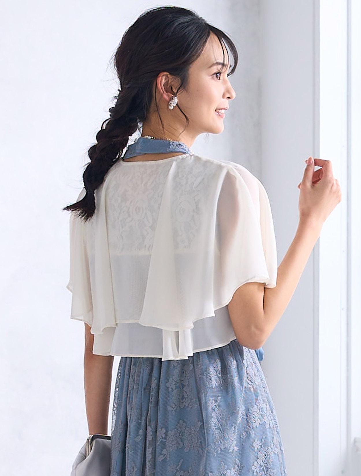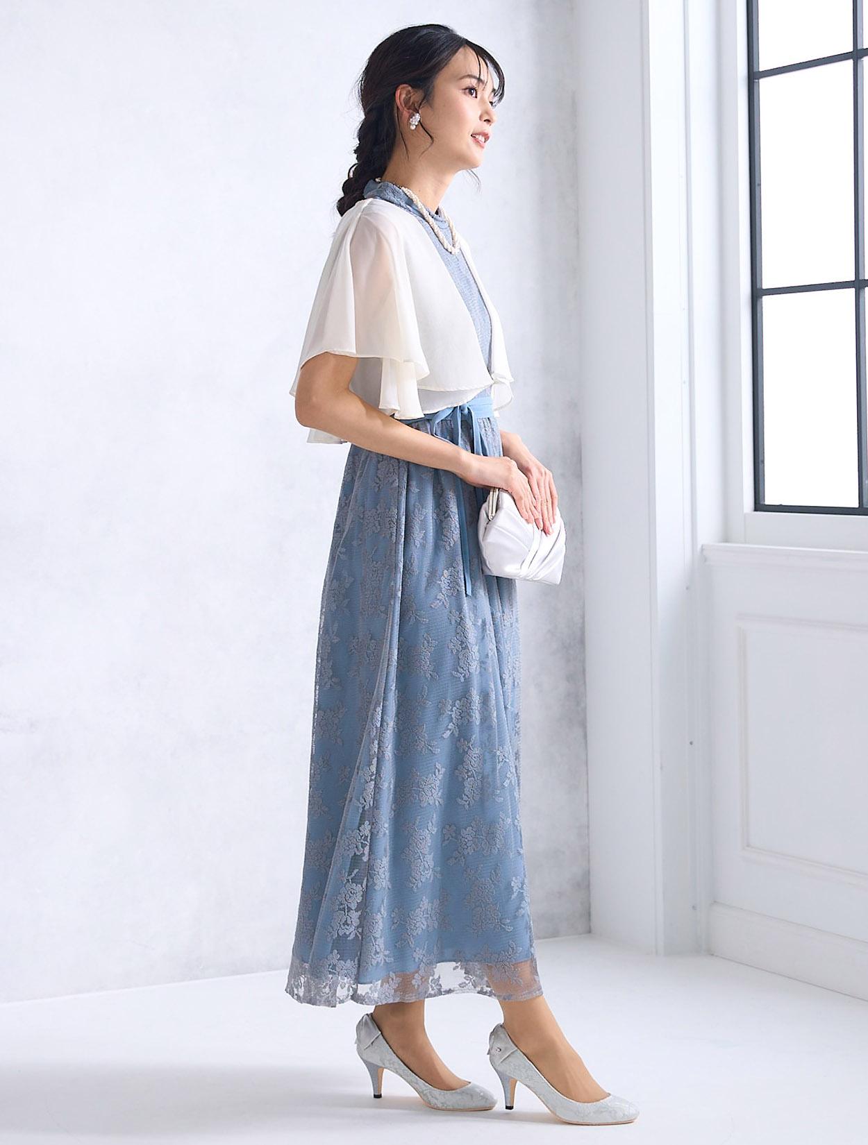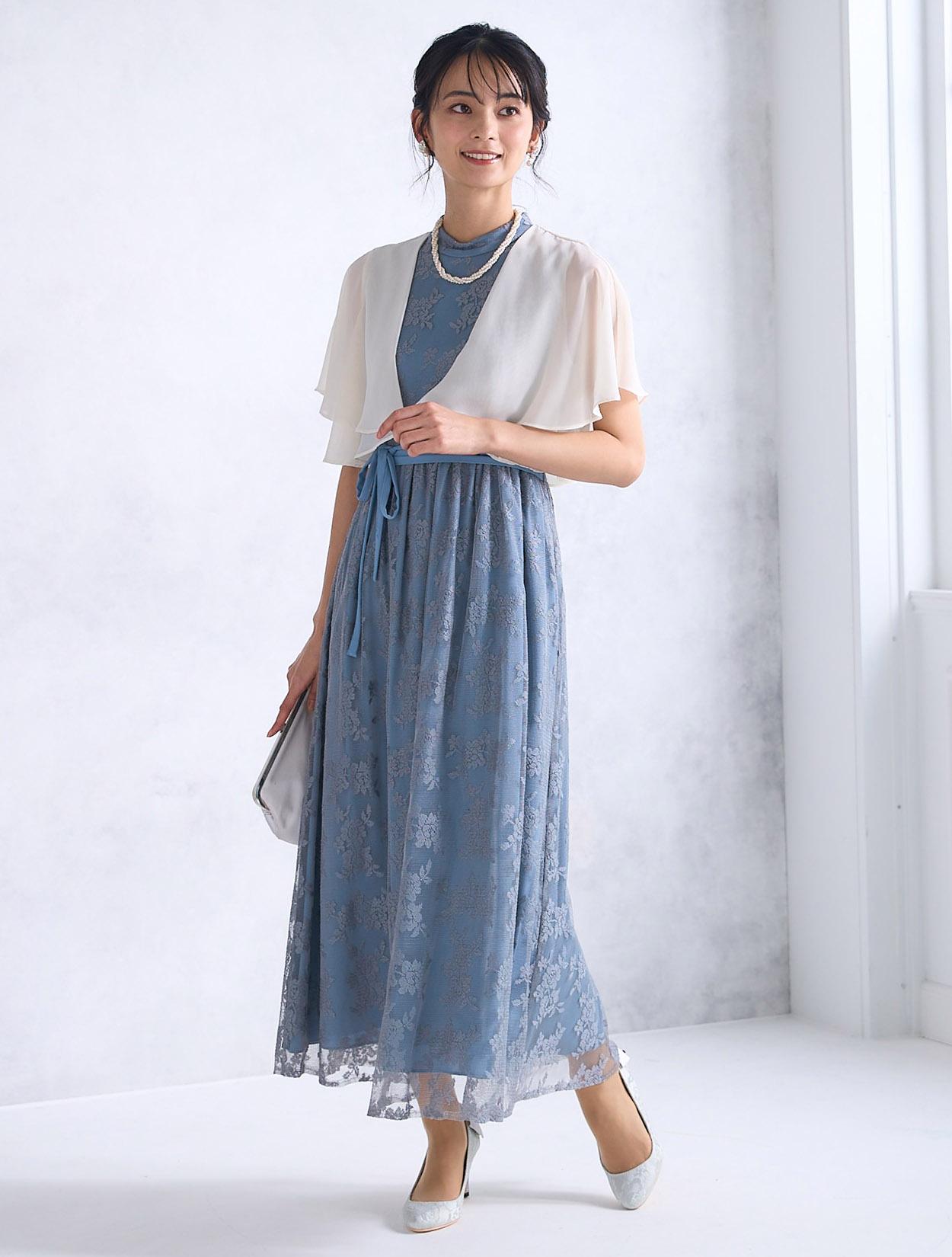 すっきりとしたアイボリーのボレロは寒色系のブルードレスにぴったり。ボレロはシフォンの軽い素材なので、ロング丈のドレスでも重たく見えないコーディネートです。また、シンプルなデザインなのでドレスの総レースの柄がキレイに引き立ちます。
