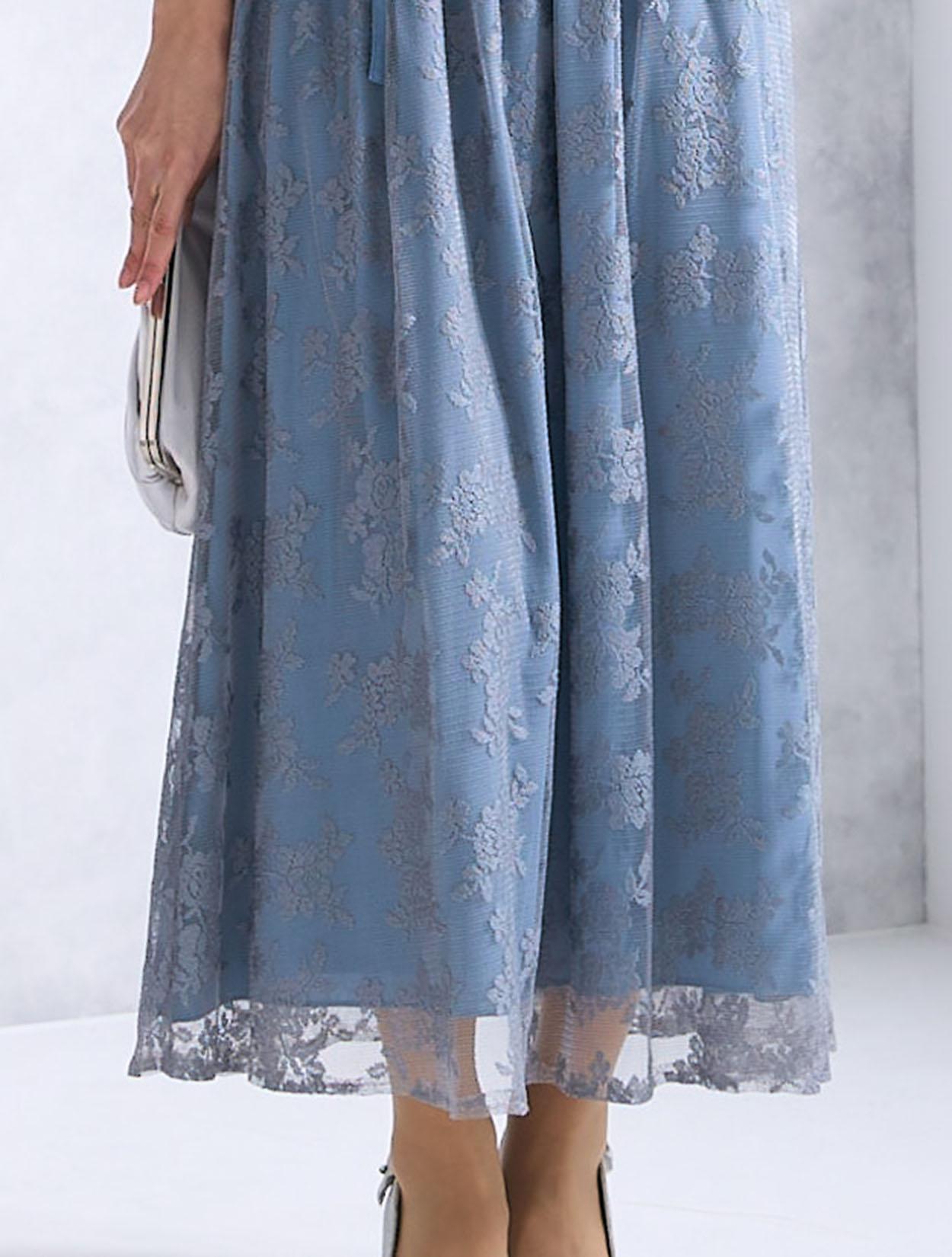 きれいな水色が清楚な雰囲気のドレス。グレーがかったレースが、トレンドのニュアンスカラーにアップデートしてくれます。寒色系でも優しい色合いなので、挑戦しやすいカラードレスです。