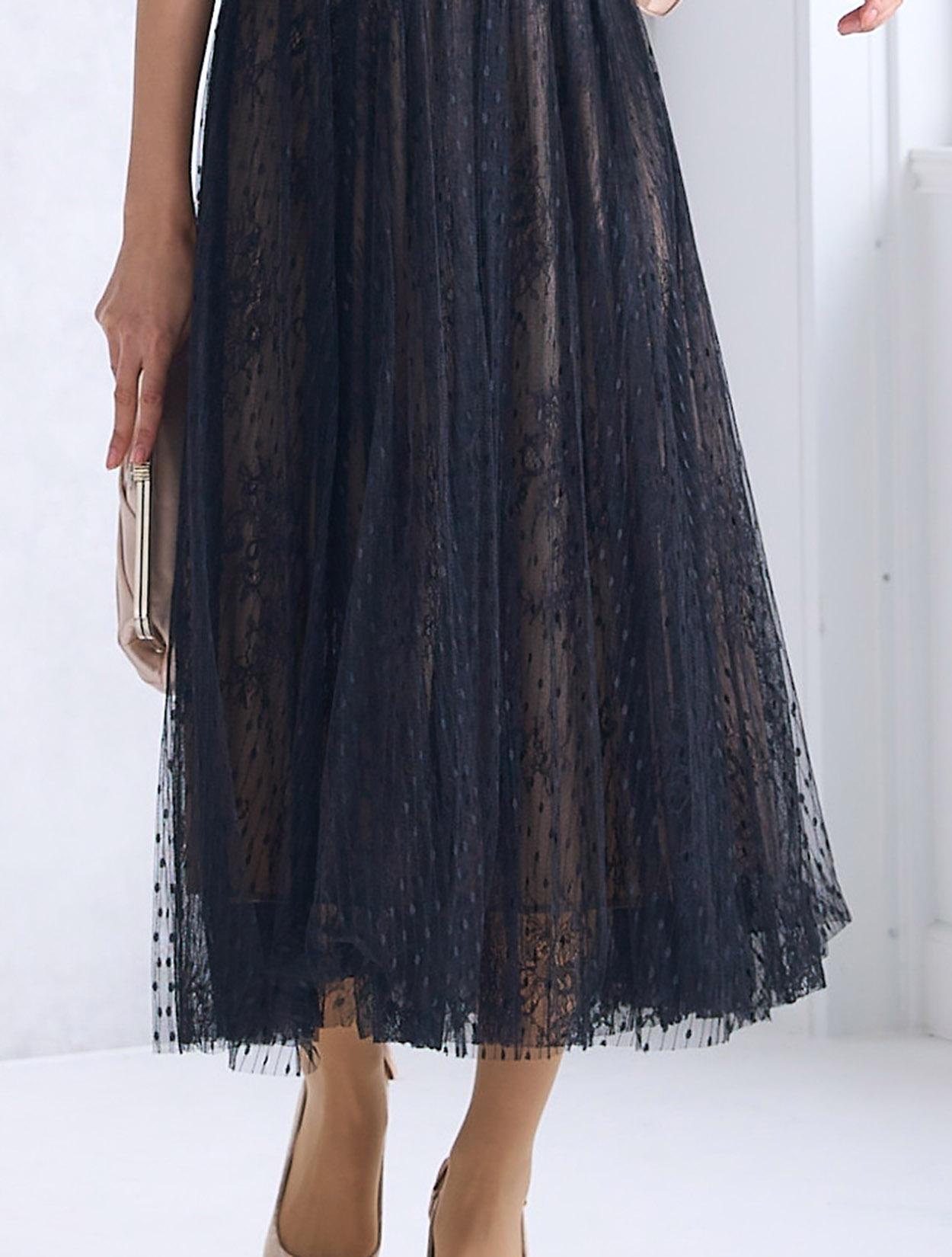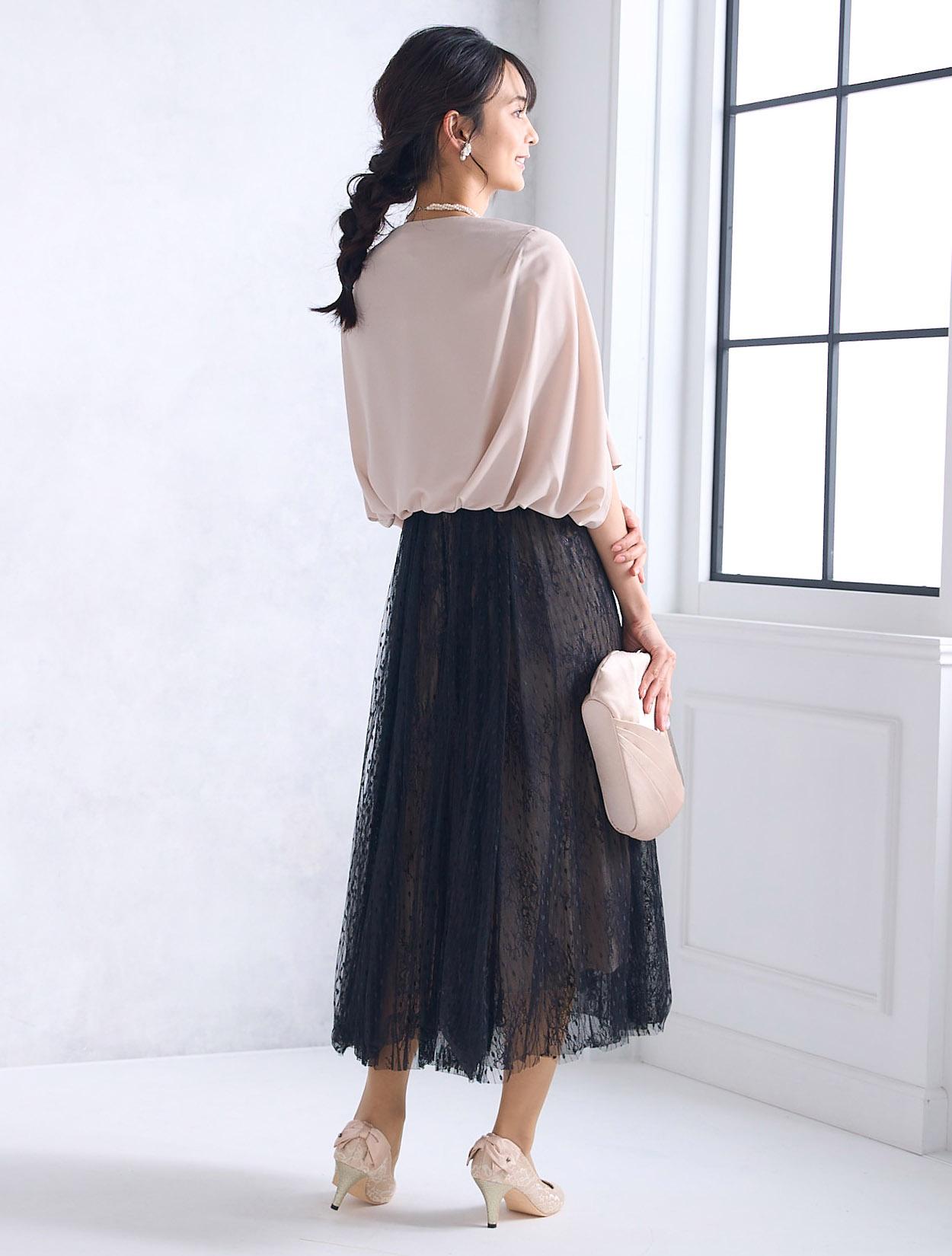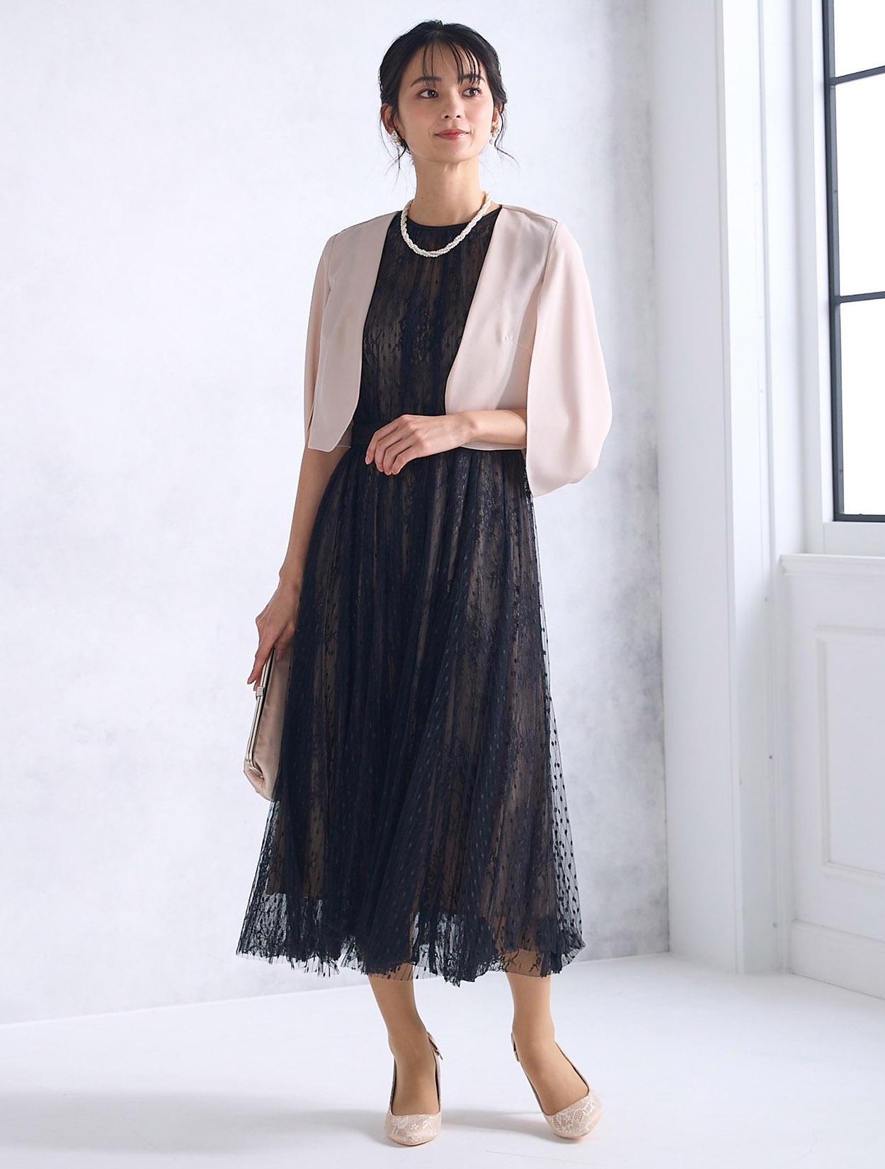 ドット柄とフラワー柄のレースを2枚重ねた、凝ったデザインがポイントのドレス。レースは軽くエアリー感たっぷり。ウエストに切り替えがあるので、どの角度からでもスッキリ見えます。スカートは長すぎないミモレ丈。足首が見えるくらいの長さは、全体の印象を軽くしてくれるので、背が高くない方にもおすすめです。背中ファスナーは上半身をきれいに形成してくれるので、ドレスらしいフォーマルな着こなしが出来ます。首元は開いていないので、レースの透け感ともバランスよく上品な印象に。背中側の首元で結ぶリボンで、バックスタイルも◎。