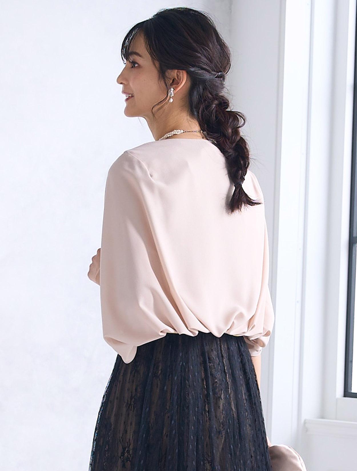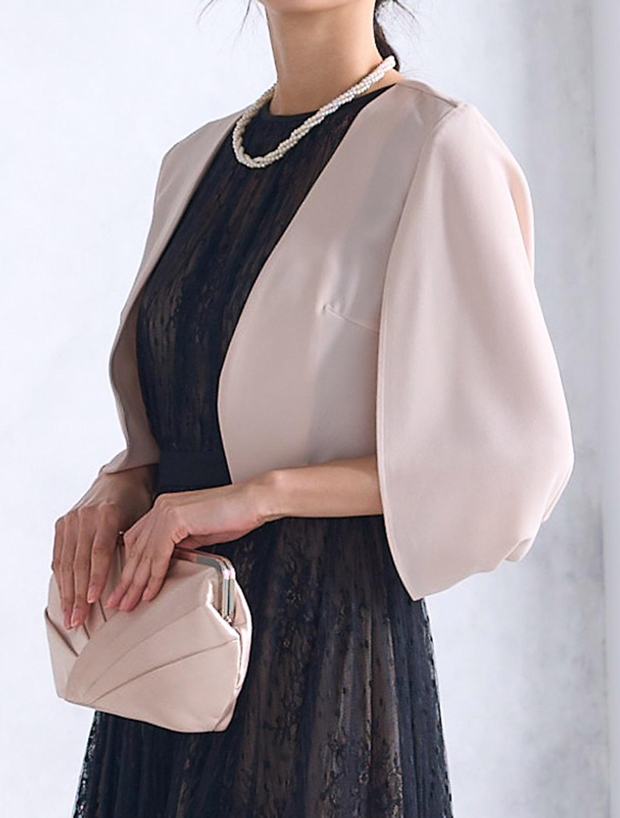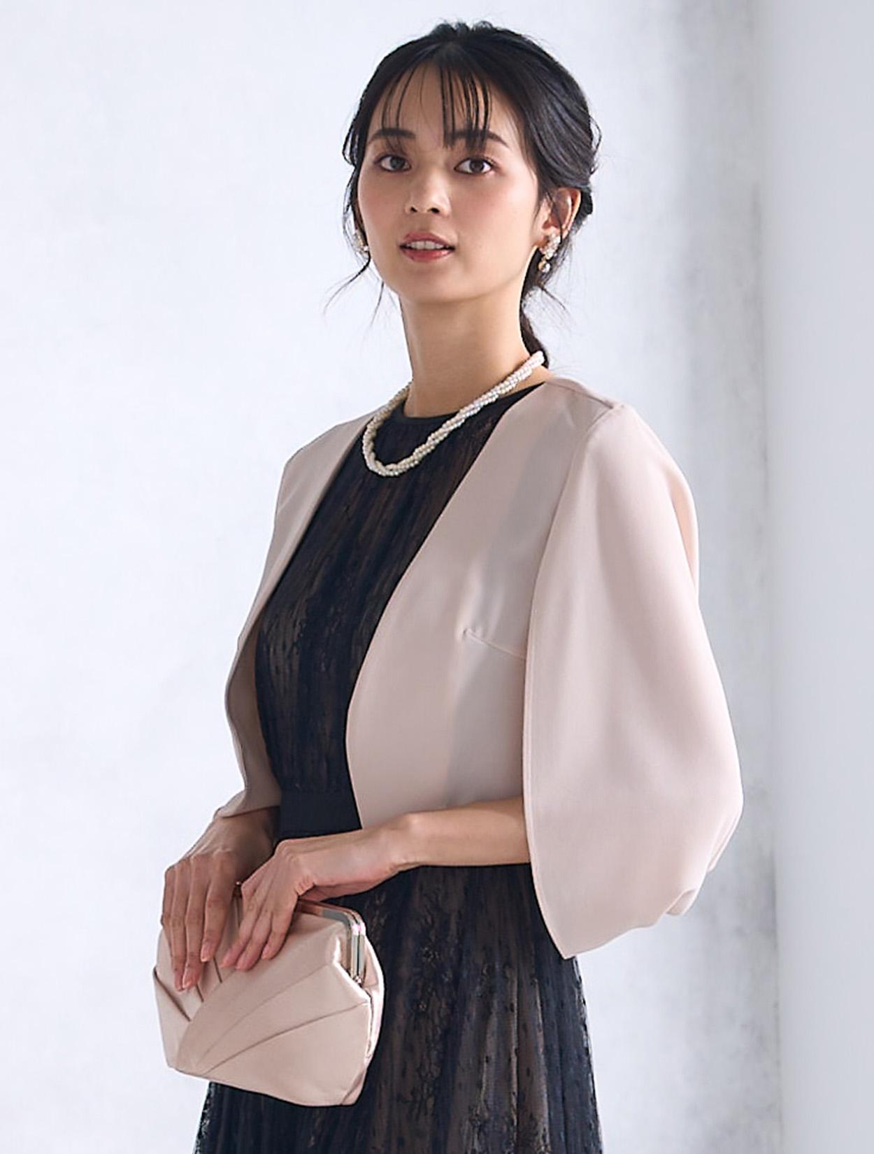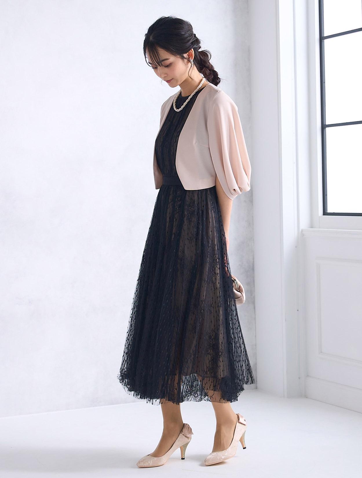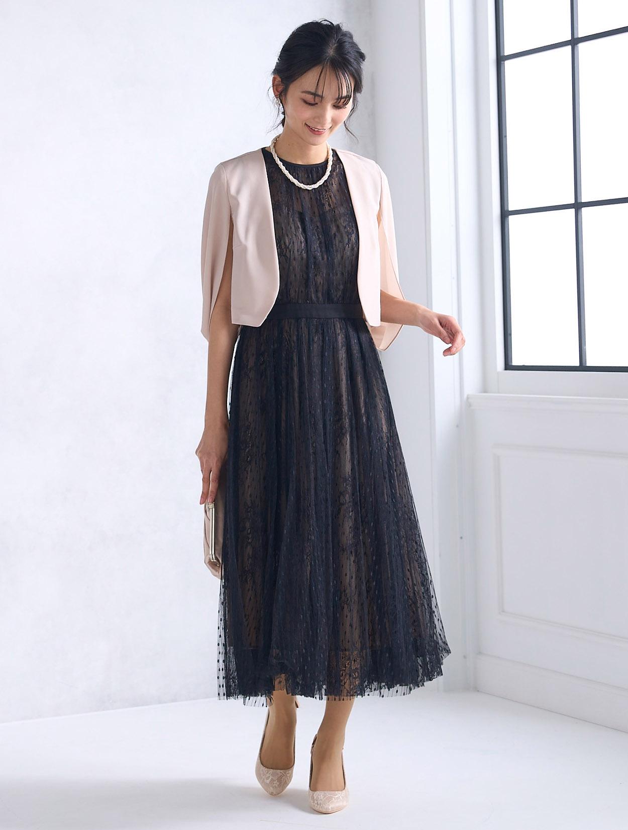 トレンドのケープ風の羽織を合わせたきちんと感のあるコーディネートは特に20代後半から30代に人気。お呼ばれドレスとしてはもちろん、親族ドレスや受付、神社などの神前式にもおすすめのコーデです。