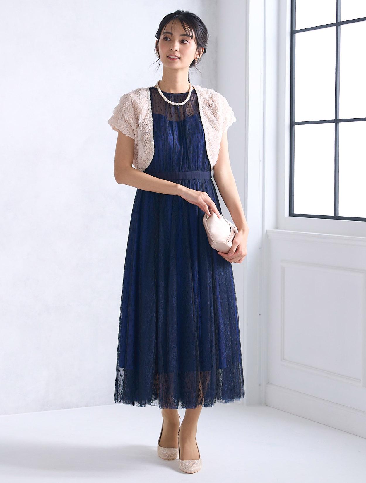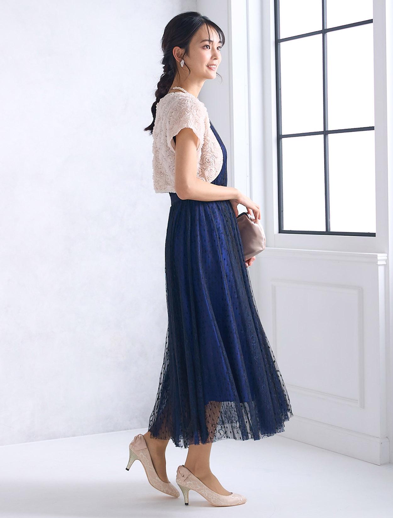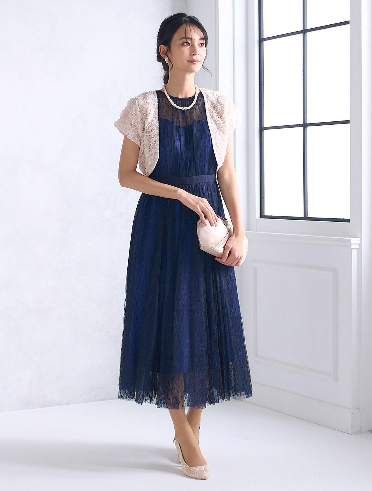 ドット柄とフラワー柄のレースを2枚重ねた、凝ったデザインがポイントのドレス。レースは軽くエアリー感たっぷり。ウエストに切り替えがあるので、どの角度からでもスッキリ見えます。スカートは長すぎないミモレ丈。足首が見えるくらいの長さは、全体の印象を軽くしてくれるので、背が高くない方にもおすすめです。背中ファスナーは上半身をきれいに形成してくれるので、ドレスらしいフォーマルな着こなしが出来ます。首元は開いていないので、レースの透け感ともバランスよく上品な印象に。背中側の首元で結ぶリボンで、バックスタイルも◎。
