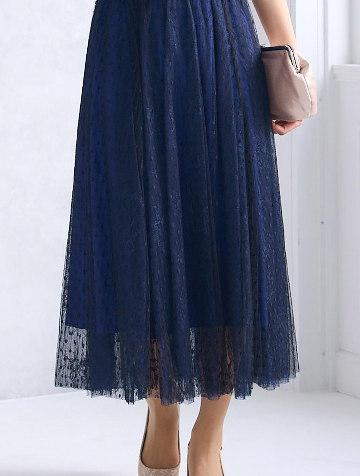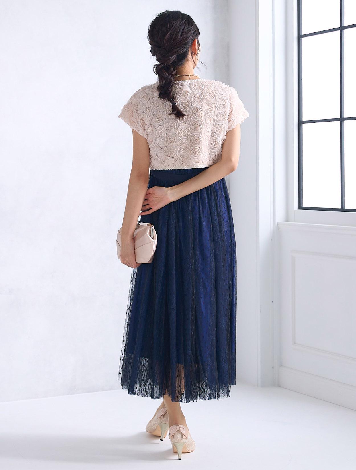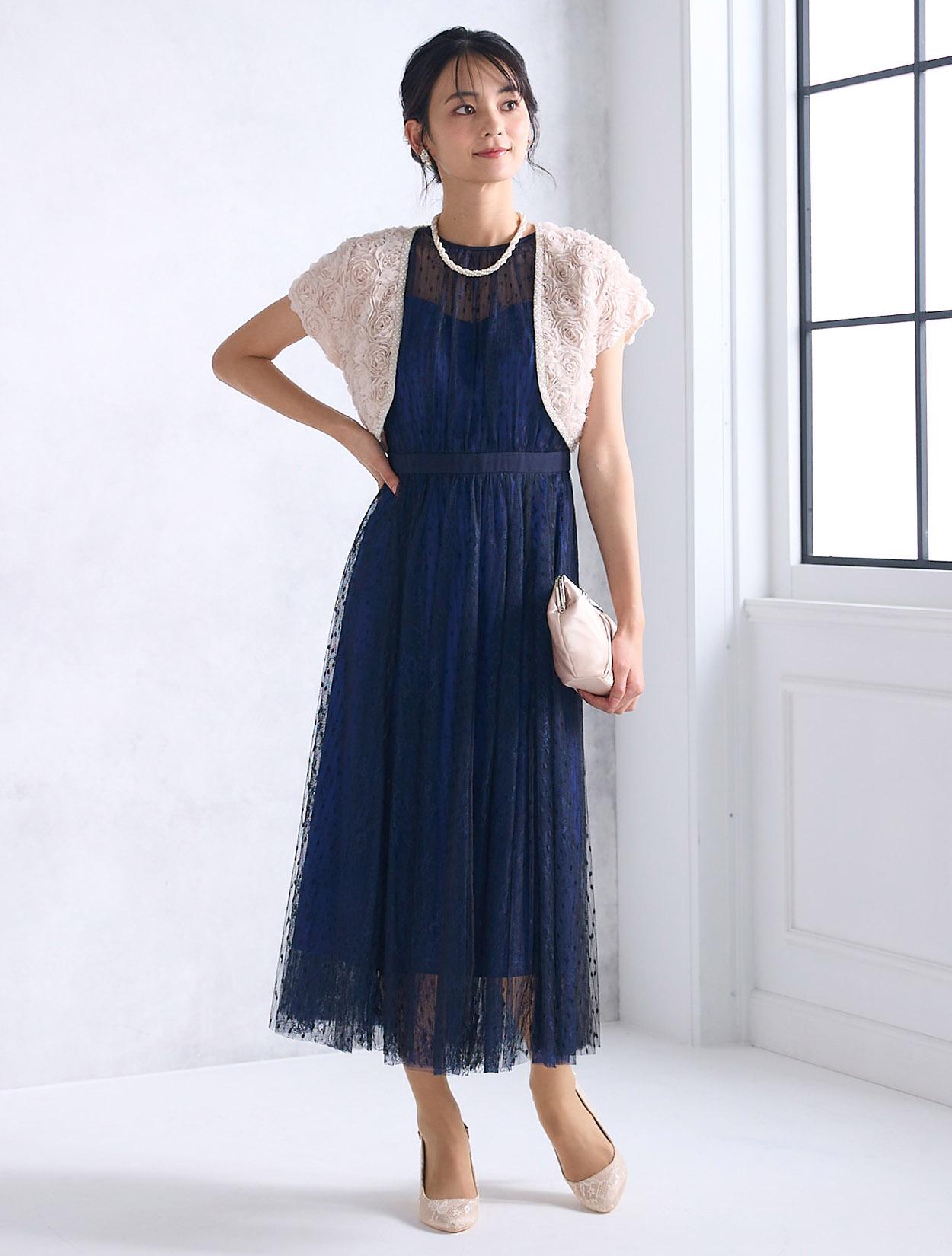 ドット柄とフラワー柄のレースを2枚重ねた、凝ったデザインがポイントのドレス。レースは軽くエアリー感たっぷり。ウエストに切り替えがあるので、どの角度からでもスッキリ見えます。スカートは長すぎないミモレ丈。足首が見えるくらいの長さは、全体の印象を軽くしてくれるので、背が高くない方にもおすすめです。背中ファスナーは上半身をきれいに形成してくれるので、ドレスらしいフォーマルな着こなしが出来ます。首元は開いていないので、レースの透け感ともバランスよく上品な印象に。背中側の首元で結ぶリボンで、バックスタイルも◎。