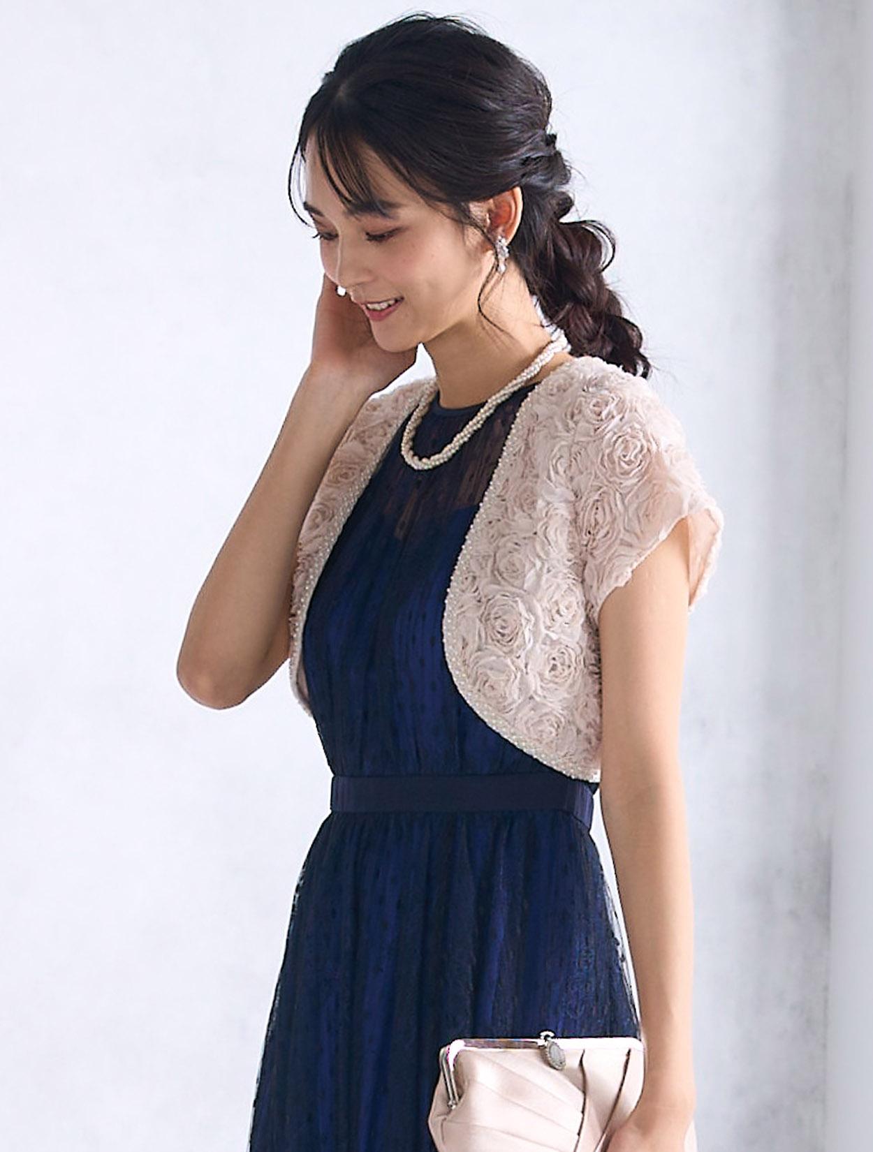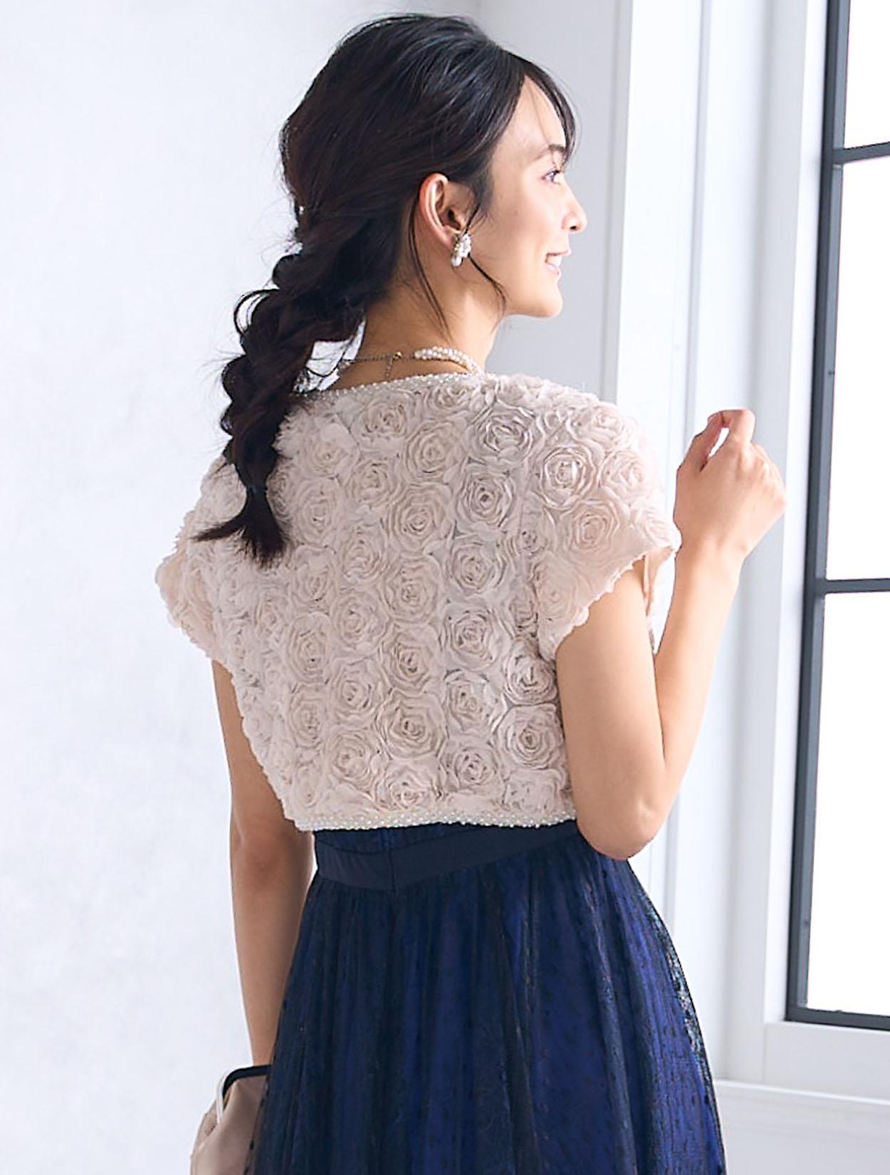 コンパクトなシルエットのボレロはロング丈ドレスとの相性抜群。スッキリと見えて脚長効果もあります。大人っぽいカラーのドレスにバラのモチーフで甘さをプラスしたコーディネートです。