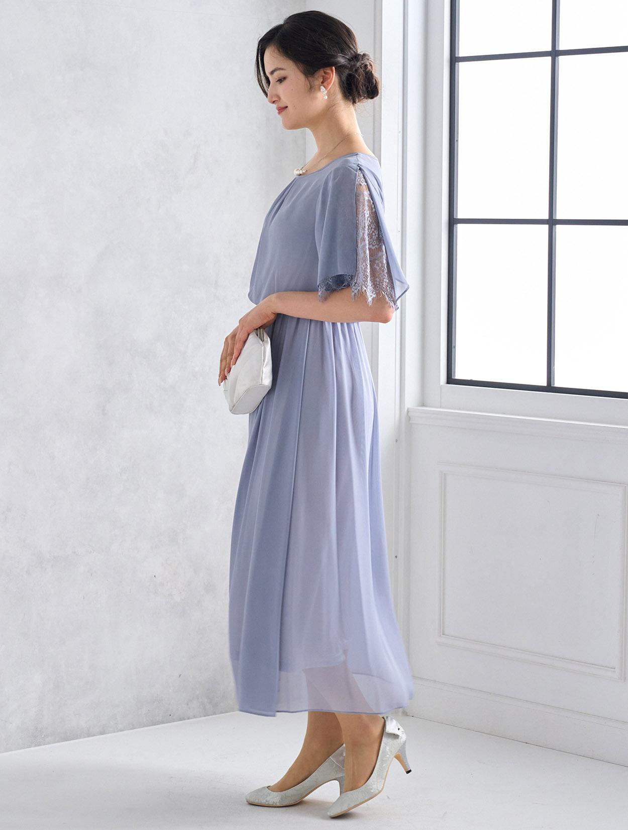 サイドに入ったスリットからのぞくレースがさりげなくおしゃれな一着。肘まであるフレアデザインのお袖は二の腕カバーに最適です。しっかりお袖があるので、結婚式でも安心して一枚で着用できます。ギャザーが入った首元は、シンプルなドレスに程よいアクセントをプラス。バストサイズがきついとギャザー部分に横じわが入ってしまうので、バストに余裕があるサイズがオススメです。ふんわりとしたウエストラインはウエストはゴム仕様で、長時間着用していても疲れずらいデザインです。丈は長めですが、裾が透けているので重たく見えにくく、身長が高くなくても着こなしやすいロングドレスです。