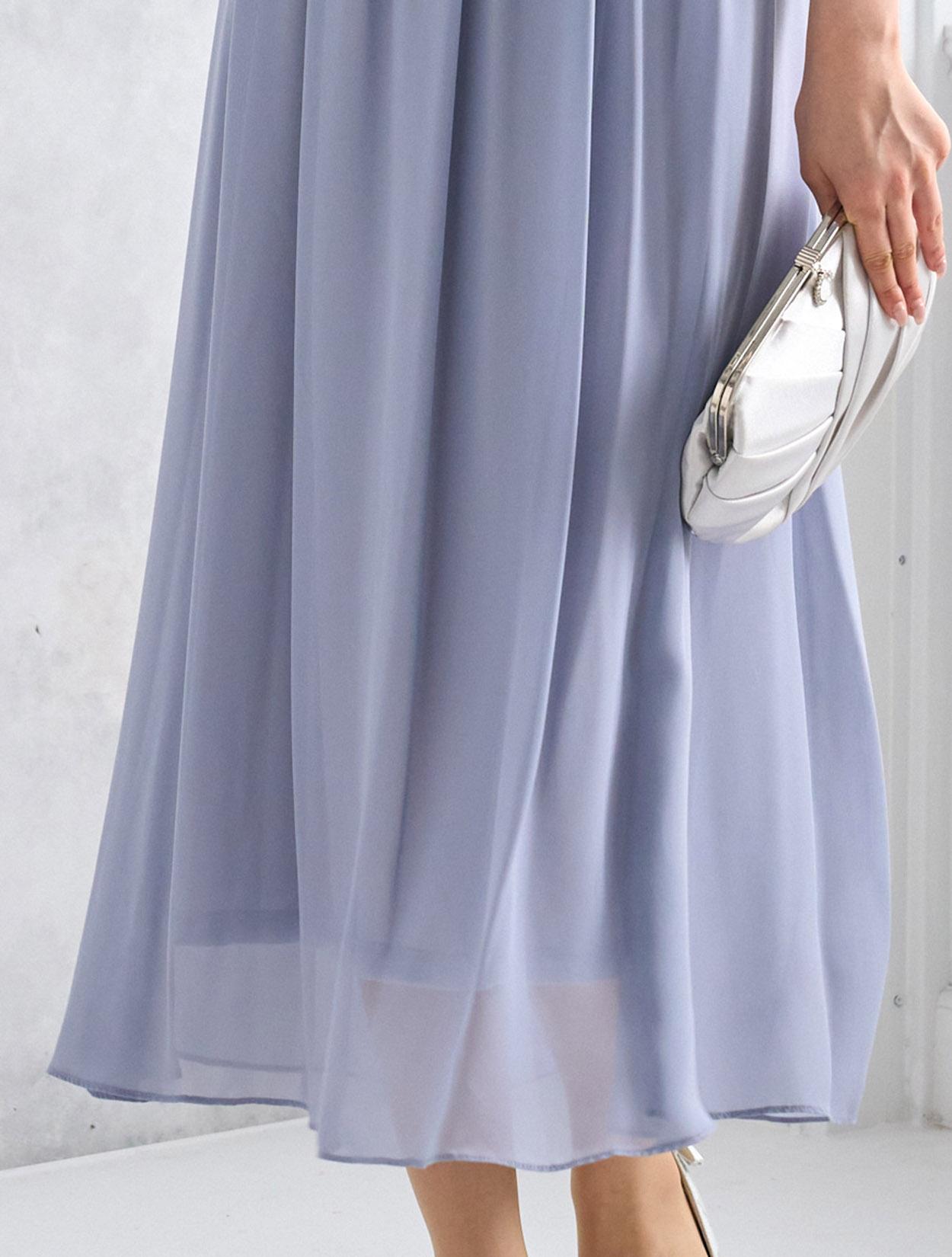 水色に近いライトグレーのカラーは透明感抜群。お顔映りがとても明るくなります。優しい淡い寒色系で、トレンドのペールカラーは肌なじみが良く色浮きしないので、カラードレスに挑戦したい方にもおすすめです。