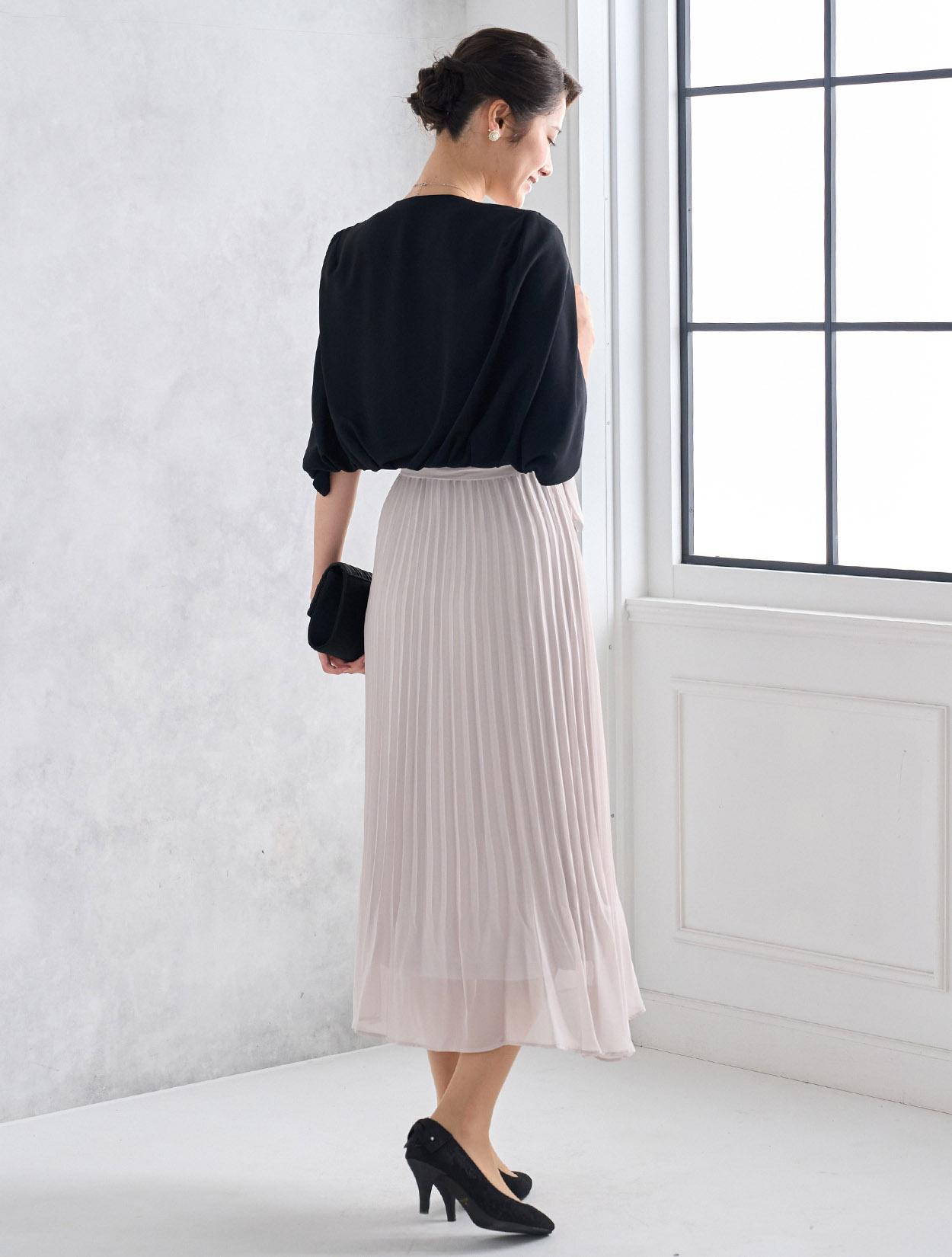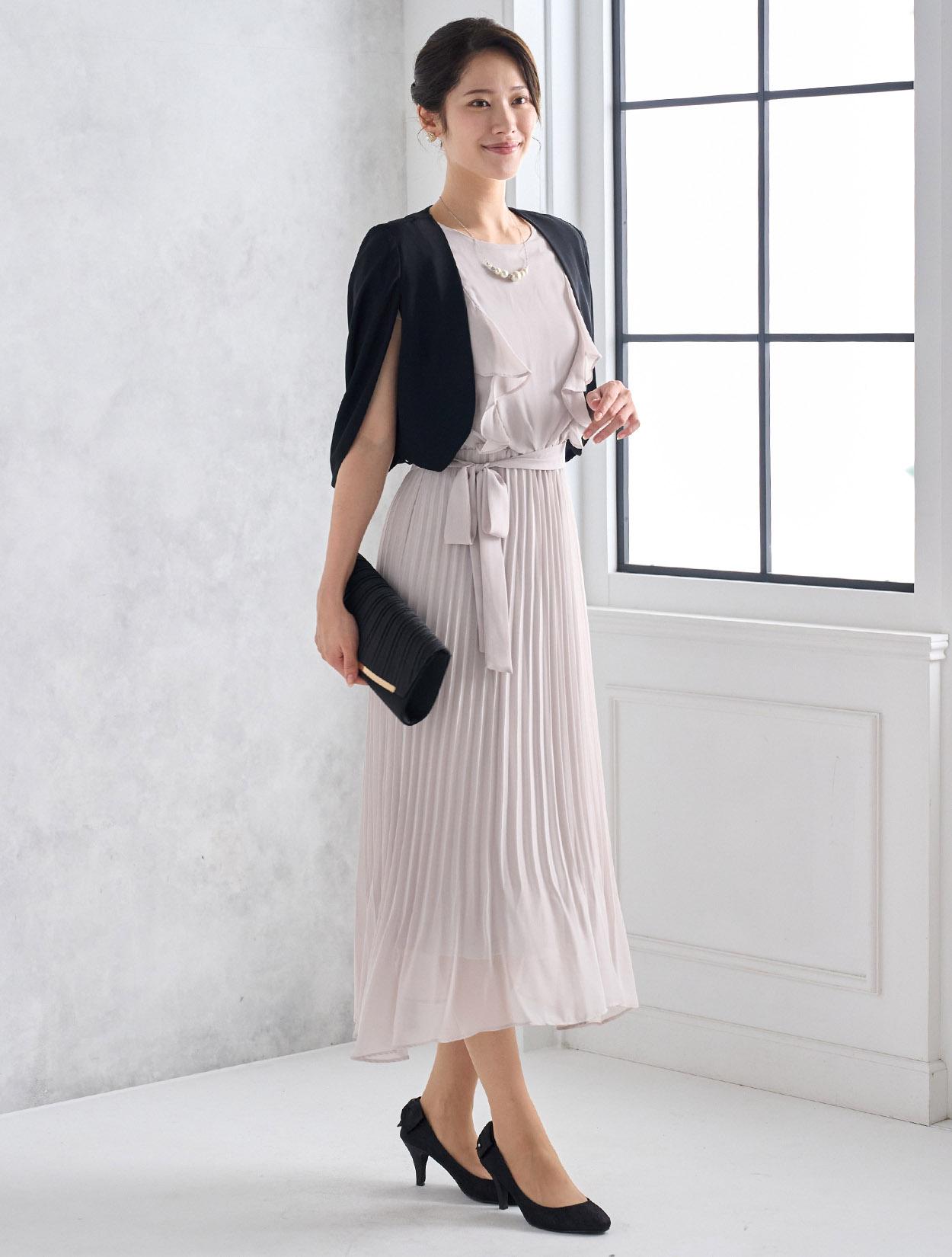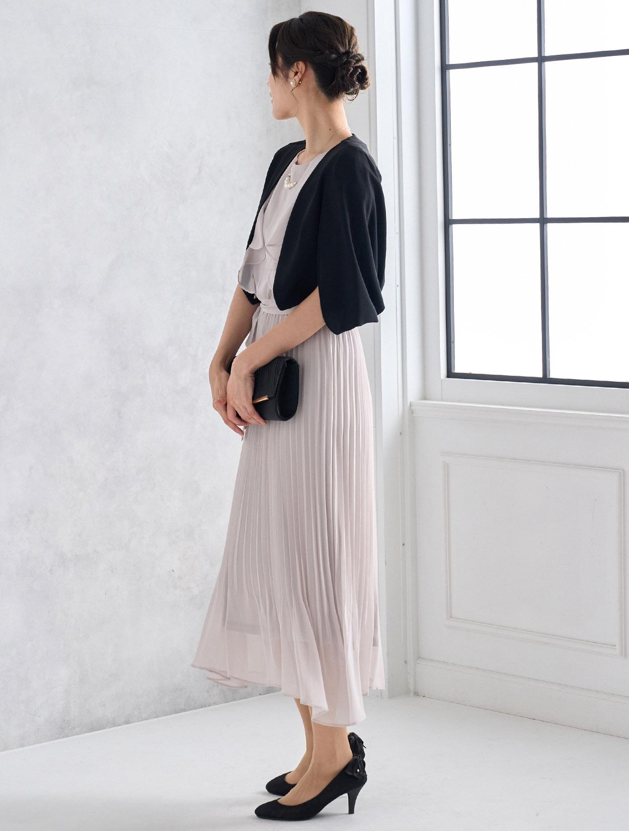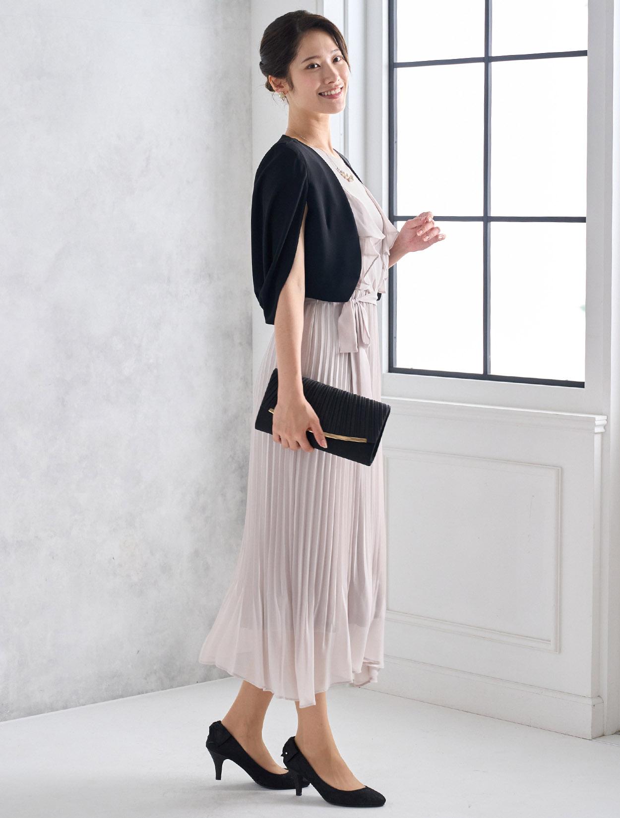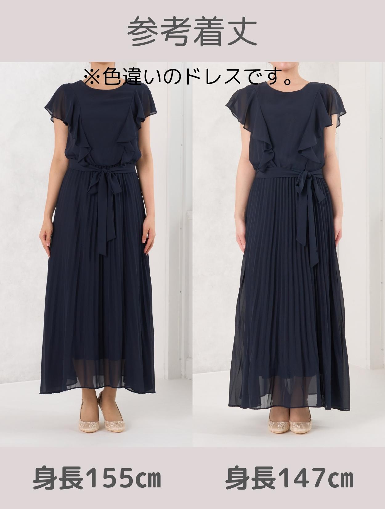 お顔周りを華やかに見せてくれるラッフルスリーブ。縦のラインを強調するプリーツ加工のスカートはスタイルアップ効果もあるトレンドのデザインです。広がり過ぎないスカートは、全体を大人っぽい印象に。裾に向かってプリーツがほどけていくデザインは、足元にエアリーな動きを出してくれます。リボンベルトでウエストマークができるので、メリハリのあるシルエットですっきり着こなせるのも嬉しいポイントです。袖ありドレスなので、結婚式でも一枚で着用可能です。特に暑い夏の結婚式にはおすすめのドレスです。バストサイズに少し余裕があるときれいに着られます。