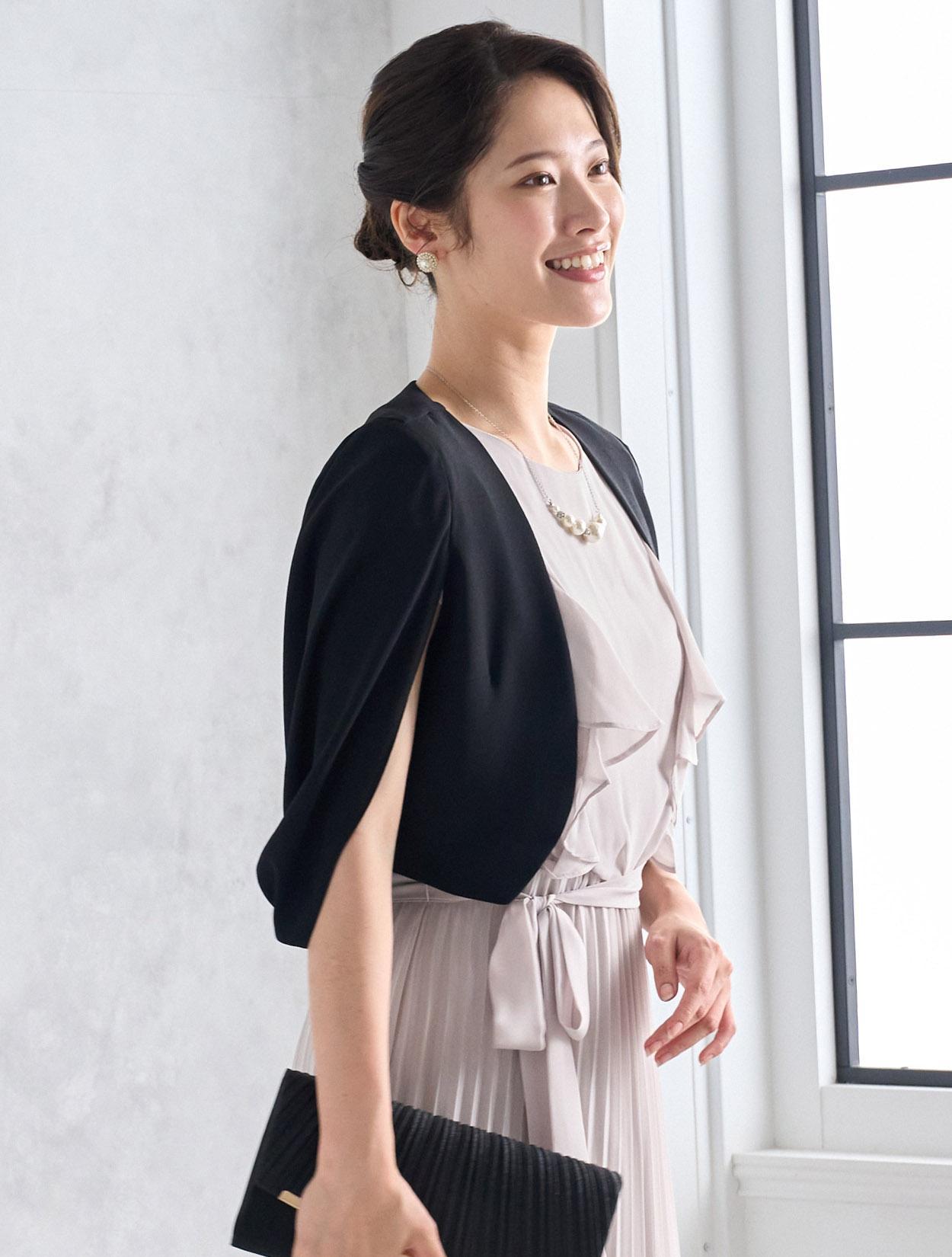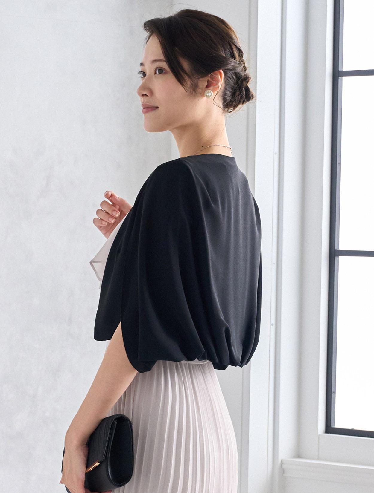 トレンドのケープ風ジャケットを合わせたきちんと感のあるコーディネートです。30代40代のご親族に人気があります。