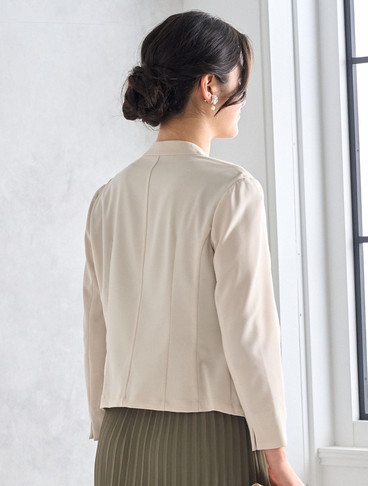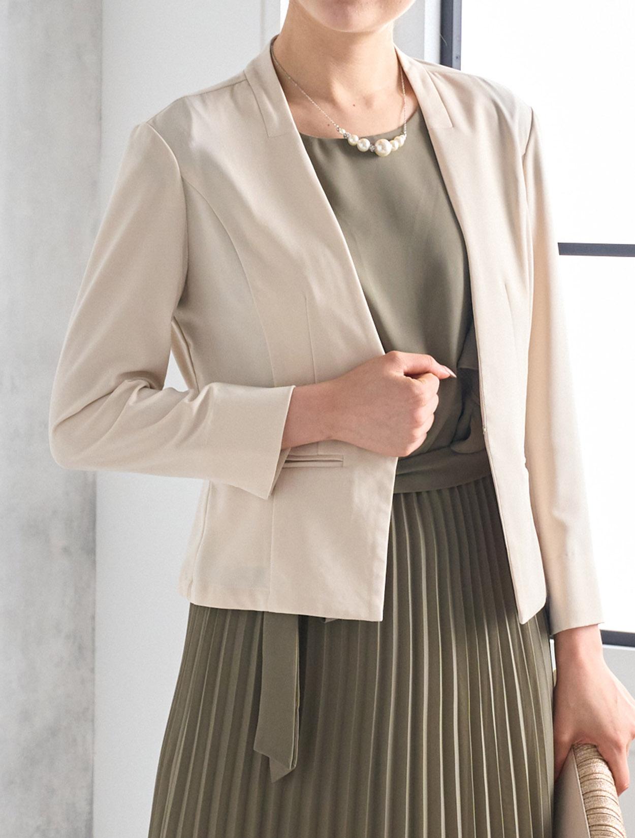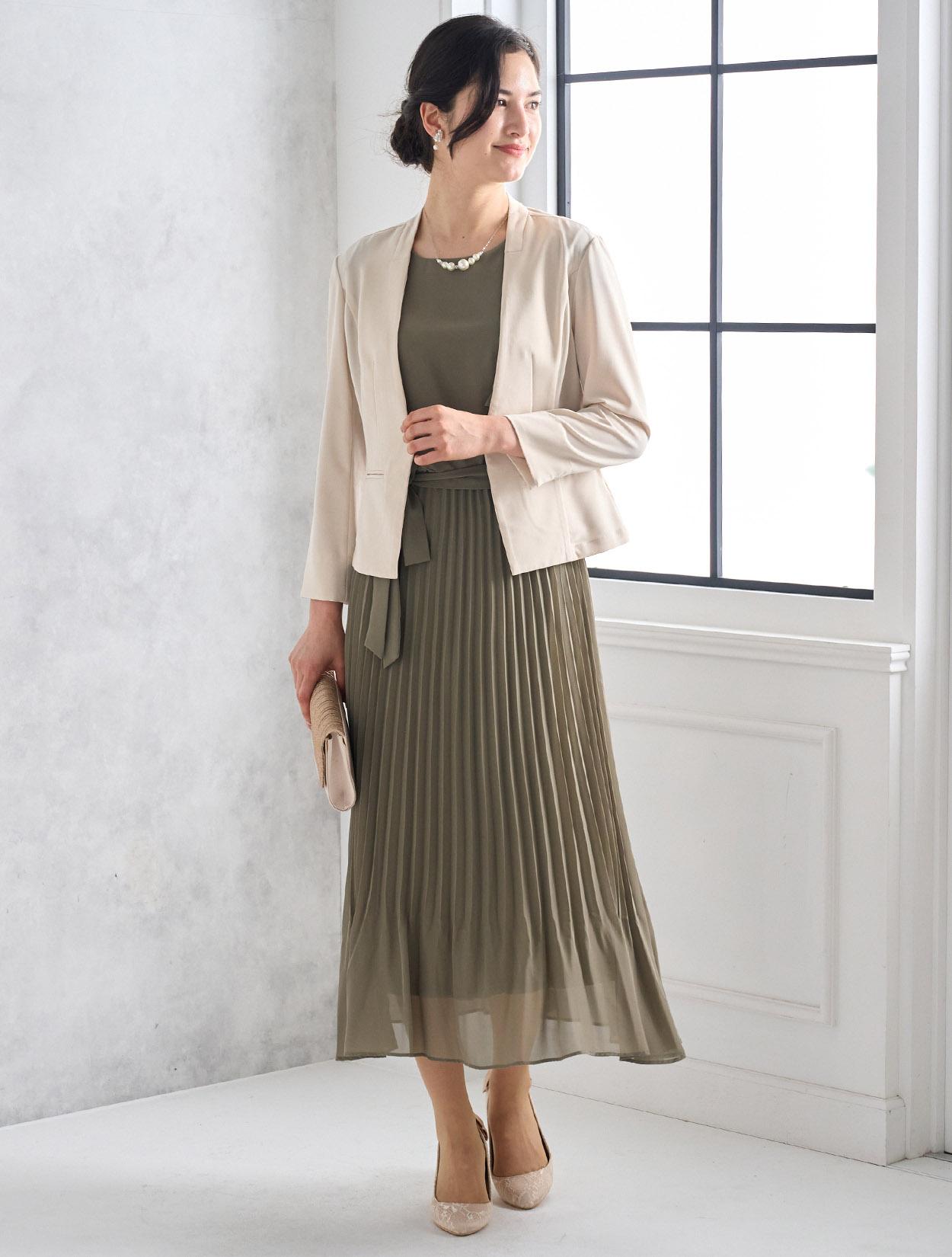 ベージュのジャケットを合わせたきちんと感のあるコーディネート。全体は明るい印象になりますが、着丈の長めのジャケットが派手さを抑えてくれます。親族でもカラーのあるドレスを着たい方にもおすすめです。