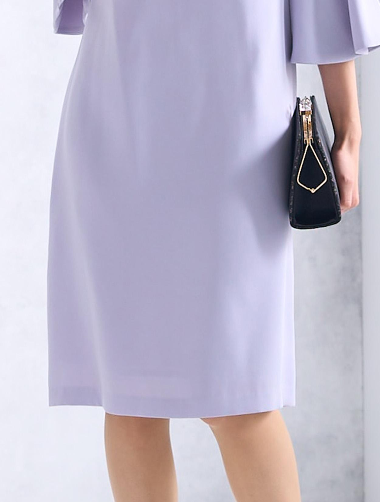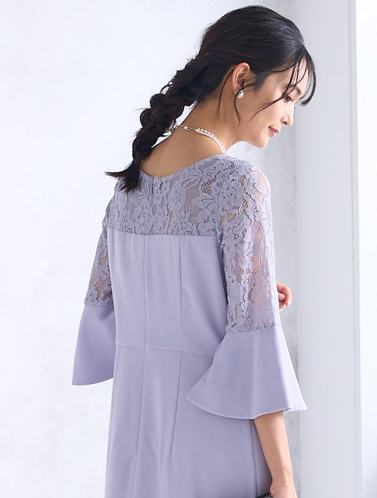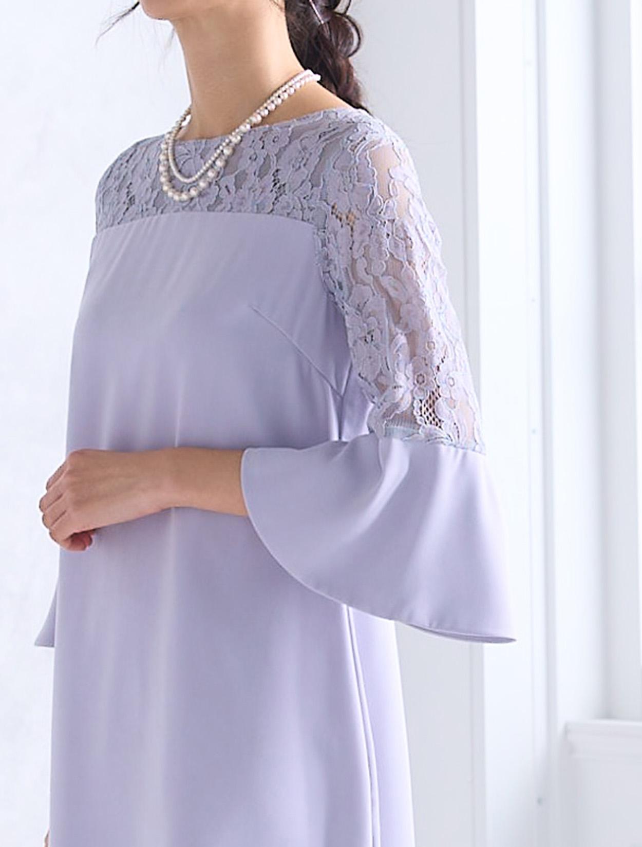 華やかに広がったベルスリーブが目を引くドレス。手首に向かって広がるお袖のデザインは、手首を華奢に女性らしく見せてくれます。デコルテ部分からお袖にかけて使われているレースは、程よく目の詰まった厚みのあるレースなので、透け感が気になる方でも安心して着用できます。人気の袖ありドレスは、結婚式でも羽織なしで一枚で着られます。ストンとしたデザインのボックスドレスですが、緩やかにウエストにくびれがあるのがポイントです。背中側には切り替えがあるので、後ろ姿はスッキリと見せてくれます。