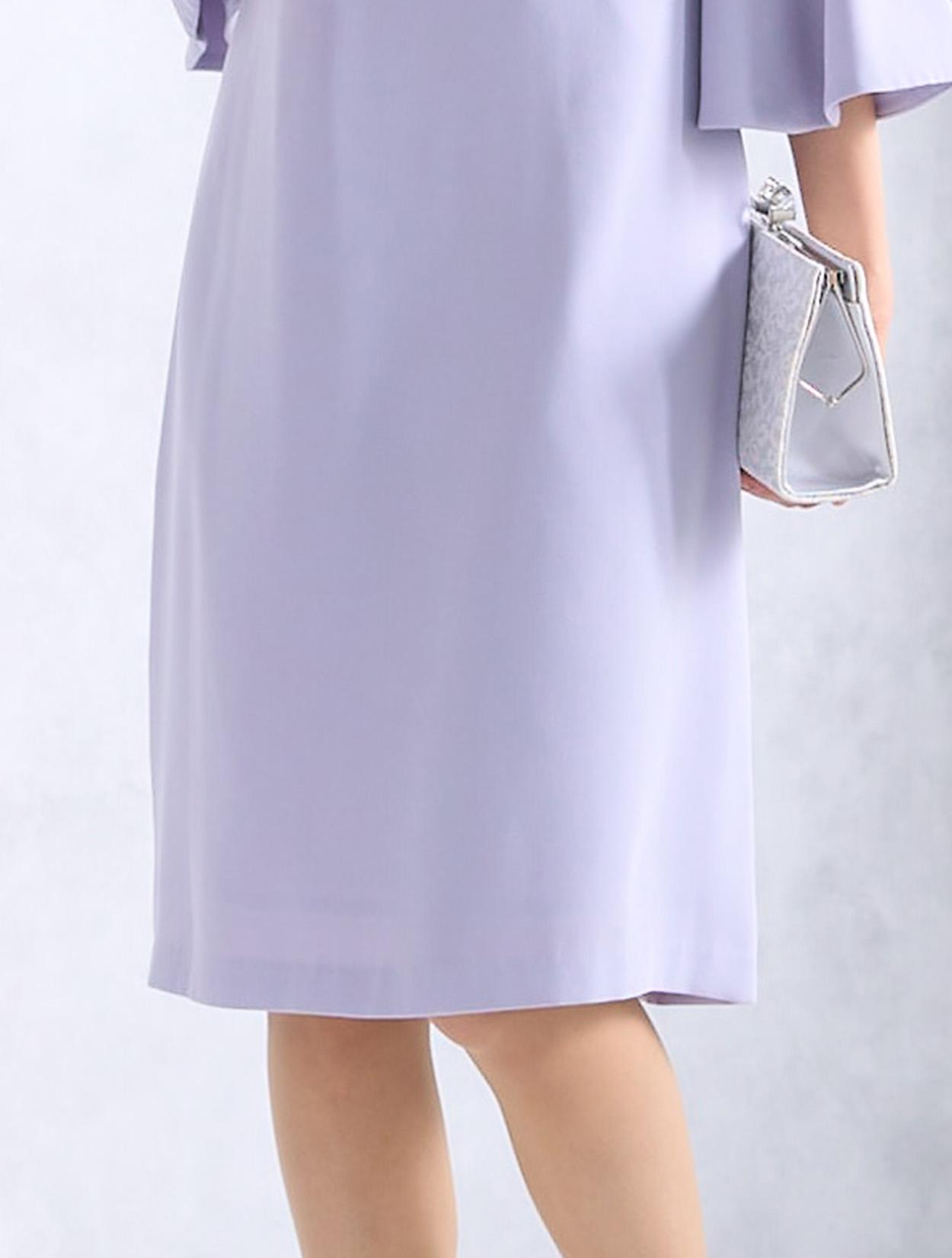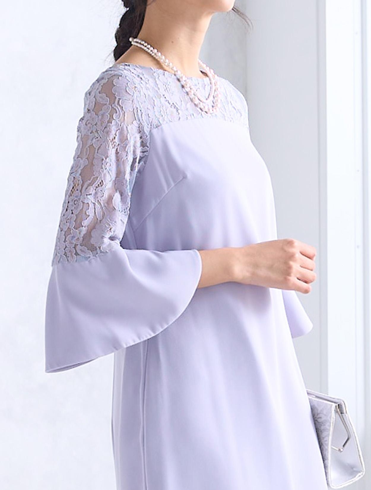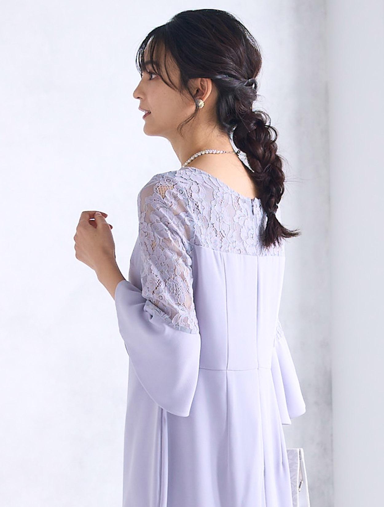 華やかに広がったベルスリーブが目を引くドレス。手首に向かって広がるお袖のデザインは、手首を華奢に女性らしく見せてくれます。デコルテ部分からお袖にかけて使われているレースは、程よく目の詰まった厚みのあるレースなので、透け感が気になる方でも安心して着用できます。人気の袖ありドレスは、結婚式でも羽織なしで一枚で着られます。ストンとしたデザインのボックスドレスですが、緩やかにウエストにくびれがあるのがポイントです。背中側には切り替えがあるので、後ろ姿はスッキリと見せてくれます。
