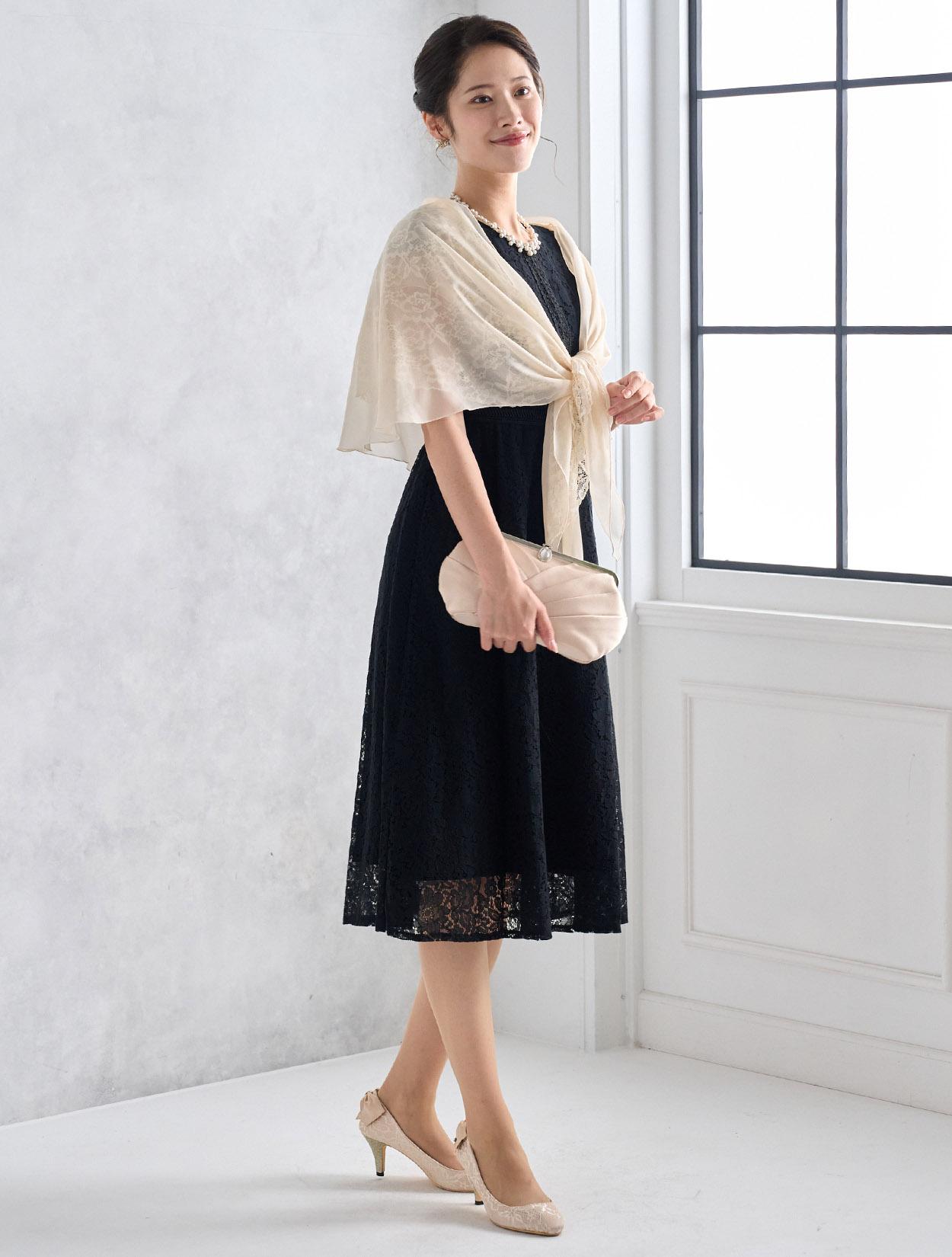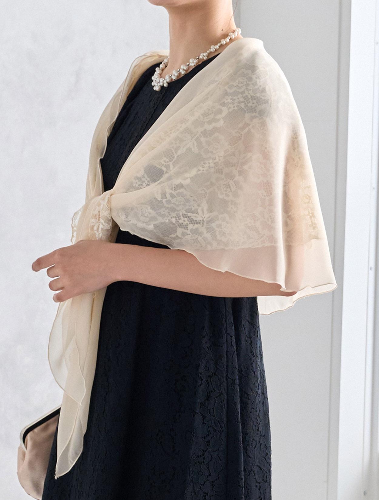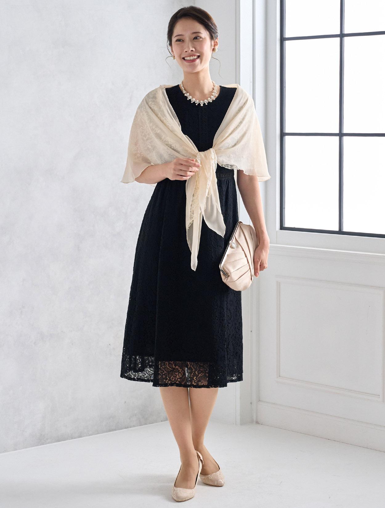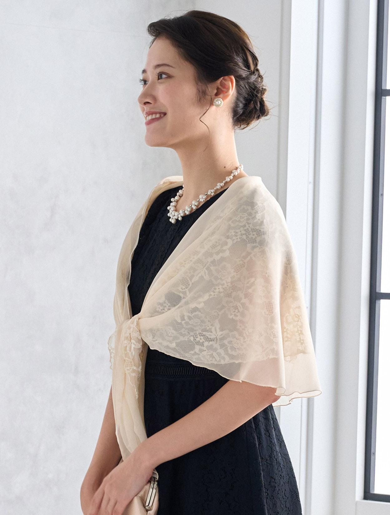 オーガンジーレースのショールが上品でフェミニンな雰囲気のコーディネート。ブラックドレスでも重たく見えず明るく着こなせます。スカラップ調のネックレスでお顔回りが華やかに見えるので写真写りも◎。
