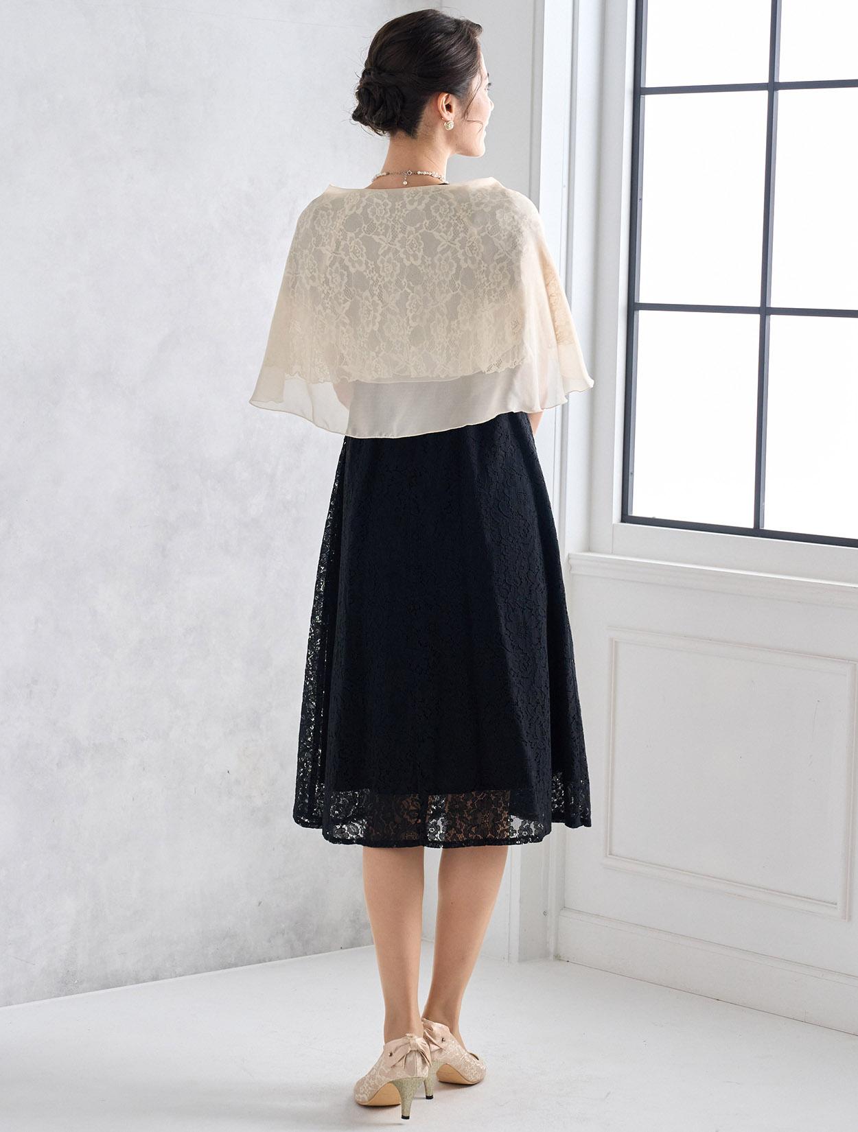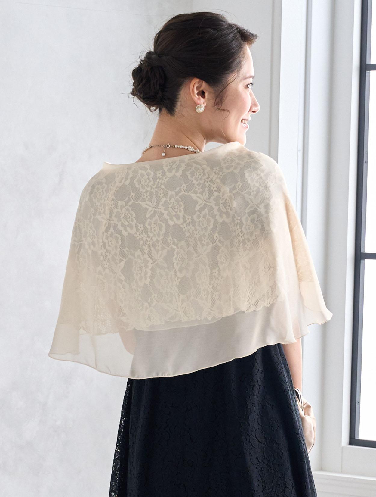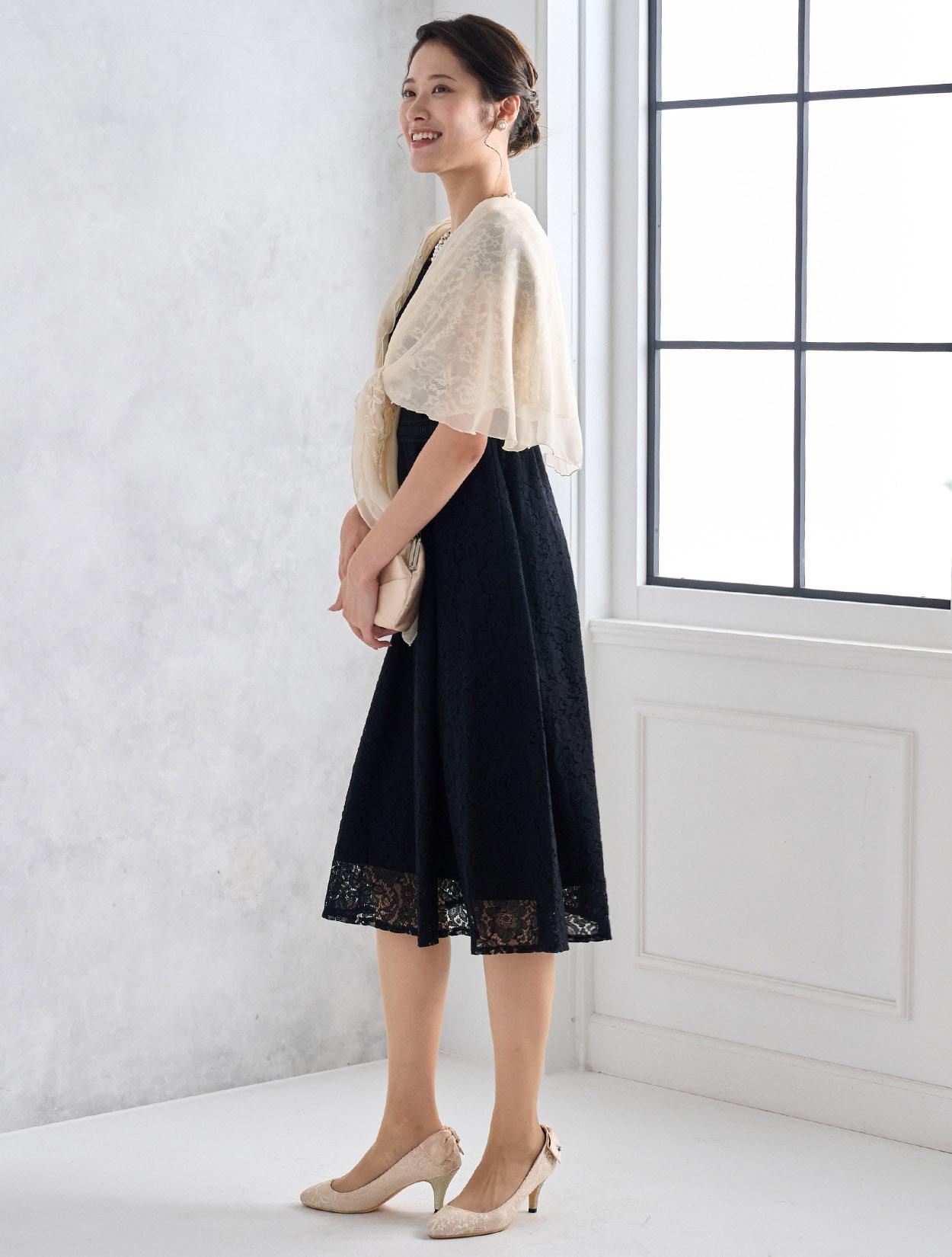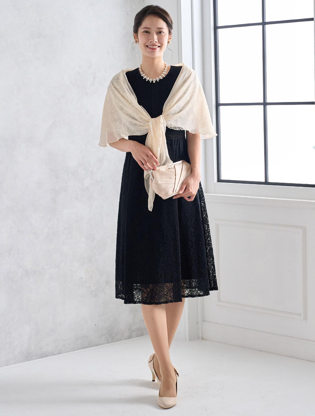 オーガンジーレースのショールが上品でフェミニンな雰囲気のコーディネート。ブラックドレスでも重たく見えず明るく着こなせます。スカラップ調のネックレスでお顔回りが華やかに見えるので写真写りも◎。