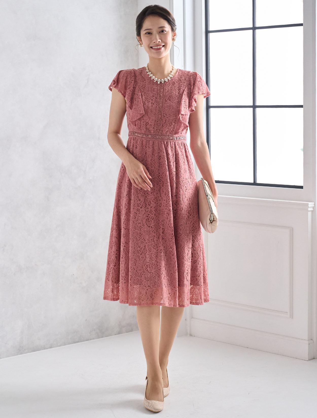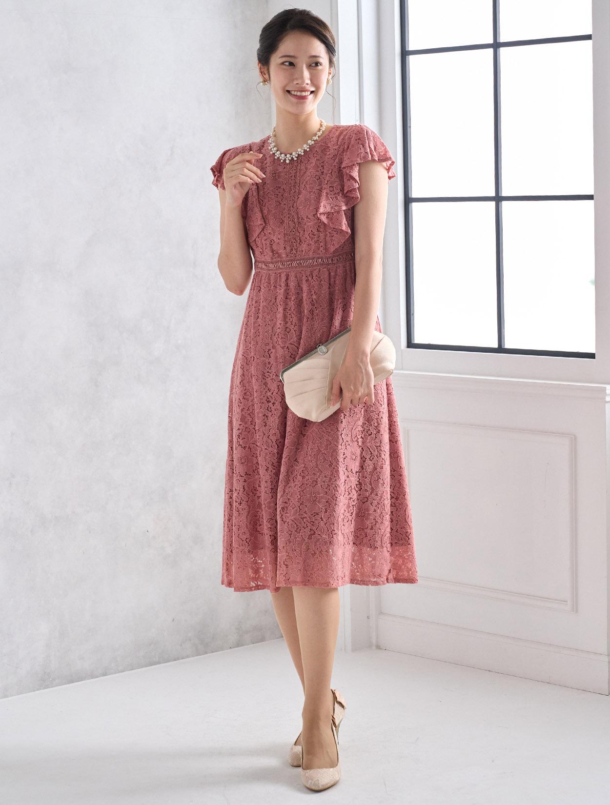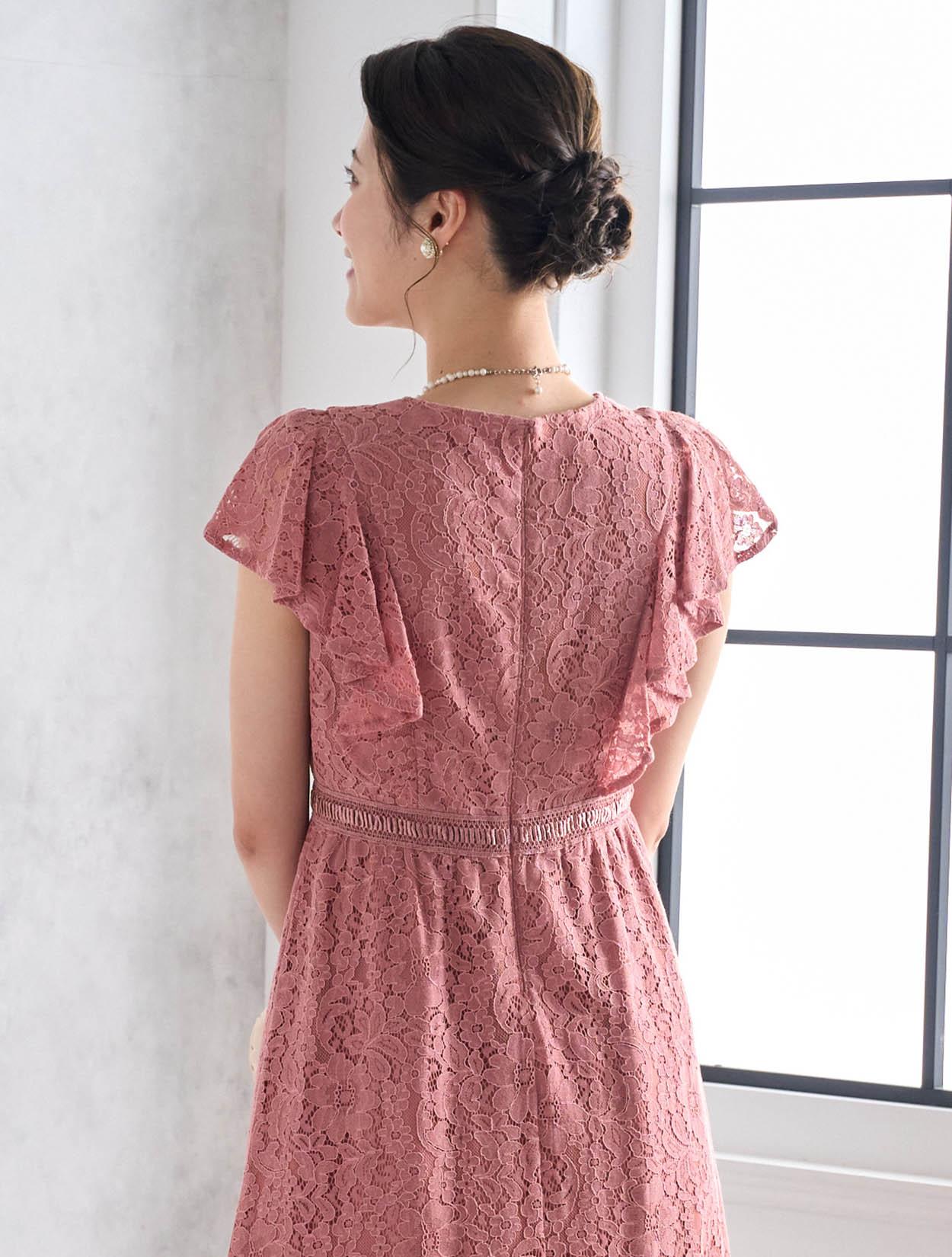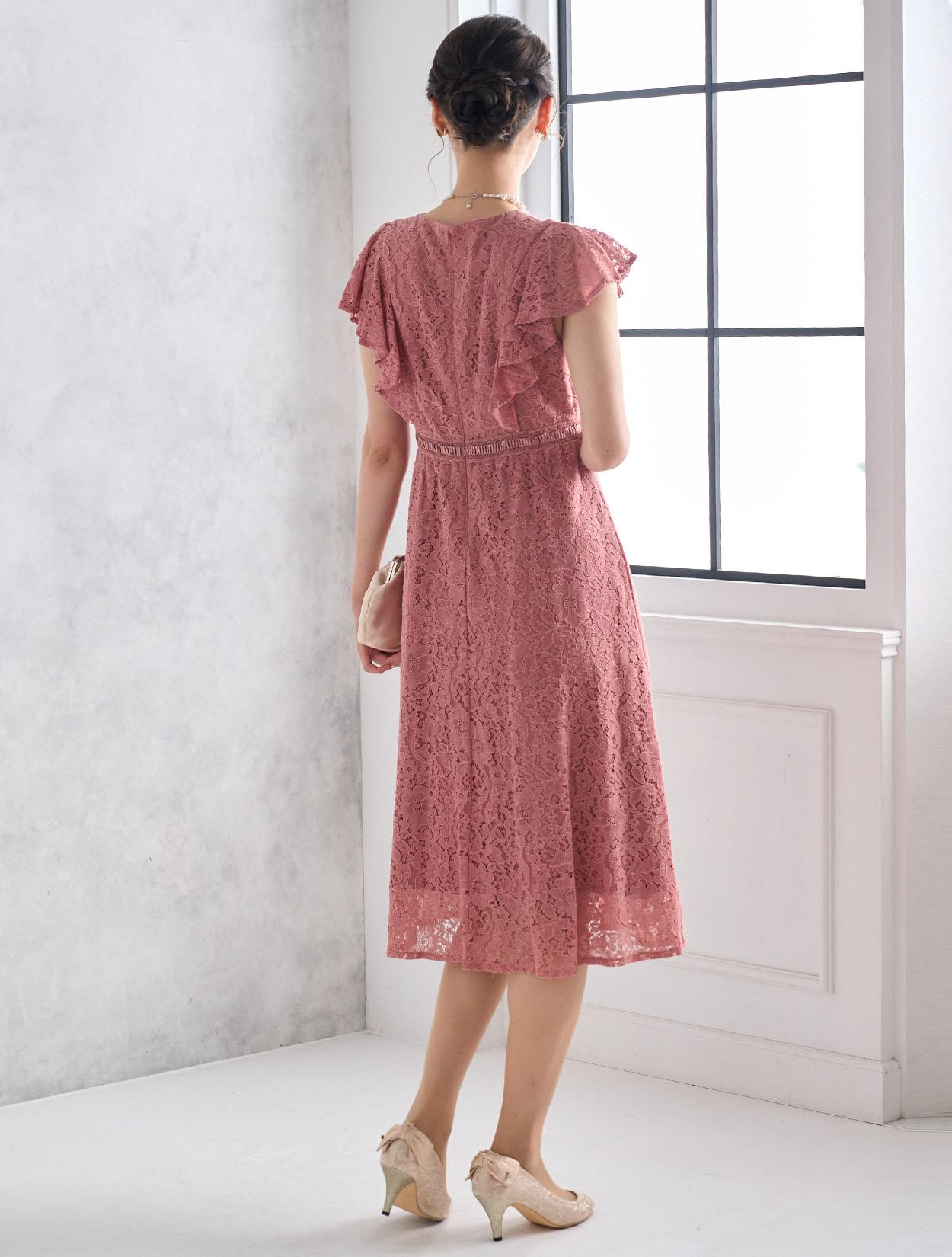 大きく華やかなラッフルのお袖が目を引くドレス。ラッフル×レースの清楚でガーリーなデザインが印象的です。高めのウエスト位置に長すぎないミディ丈は、小柄な方でもバランスよくきれいに着こなせます。背中ファスナーなので、上半身やウエスト周りが華奢な方でももたつきにくく、見栄えがするドレスです。すっきりしたフレンチスリーブ程の袖ありドレスなので、結婚式でも一枚で着て頂けます。特に暑い夏の結婚式では涼しく着用できるのでおすすめです。