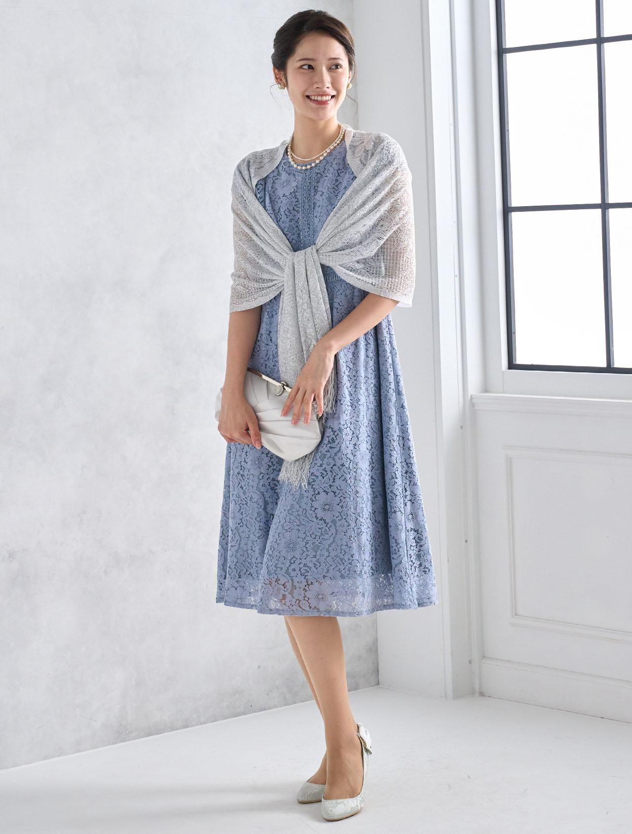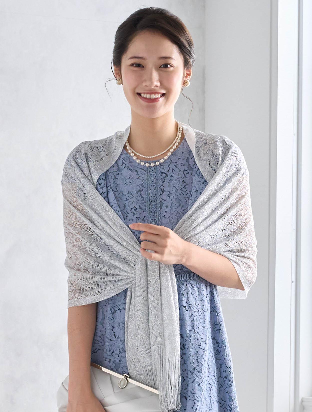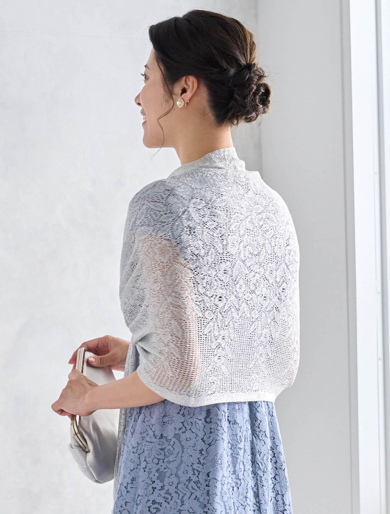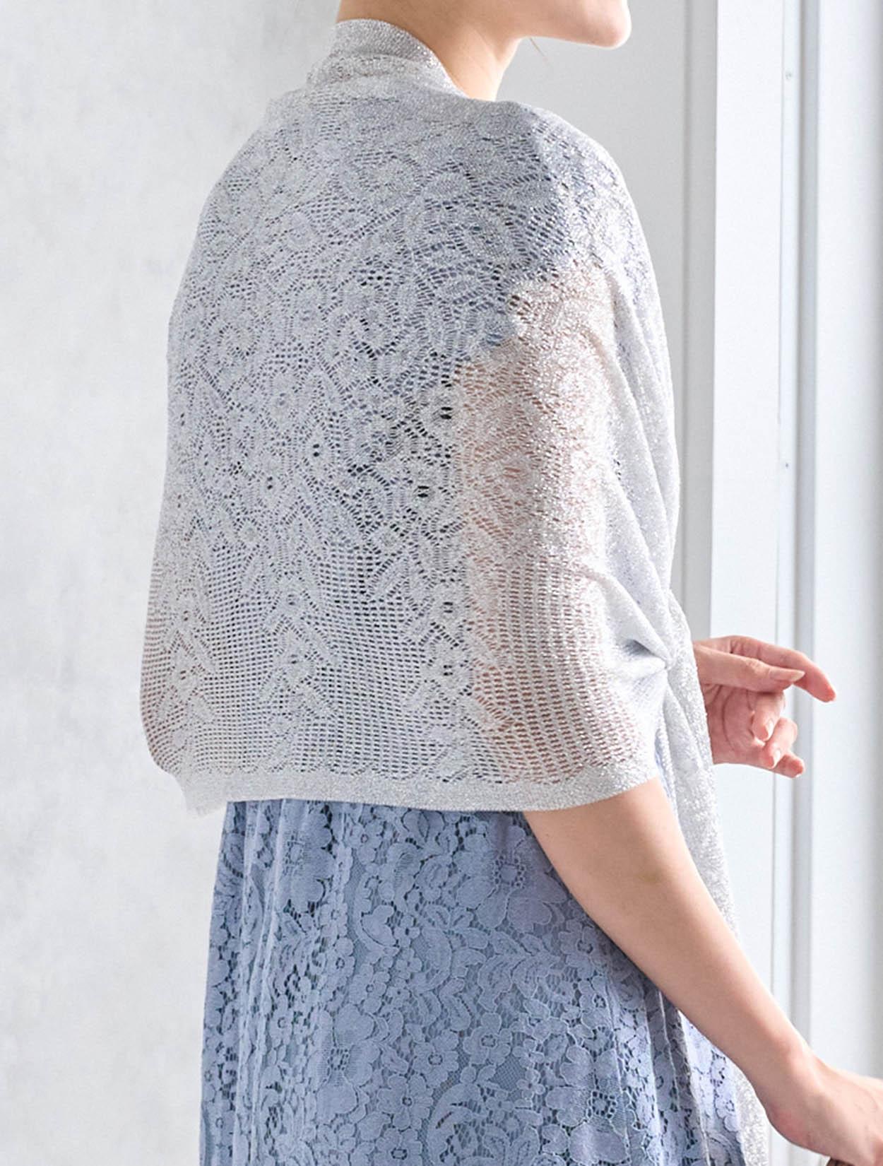 シルバーのショールが総レースのドレスに大人っぽさをプラス。可愛さもありながらスッキリとした印象の着こなしになります。