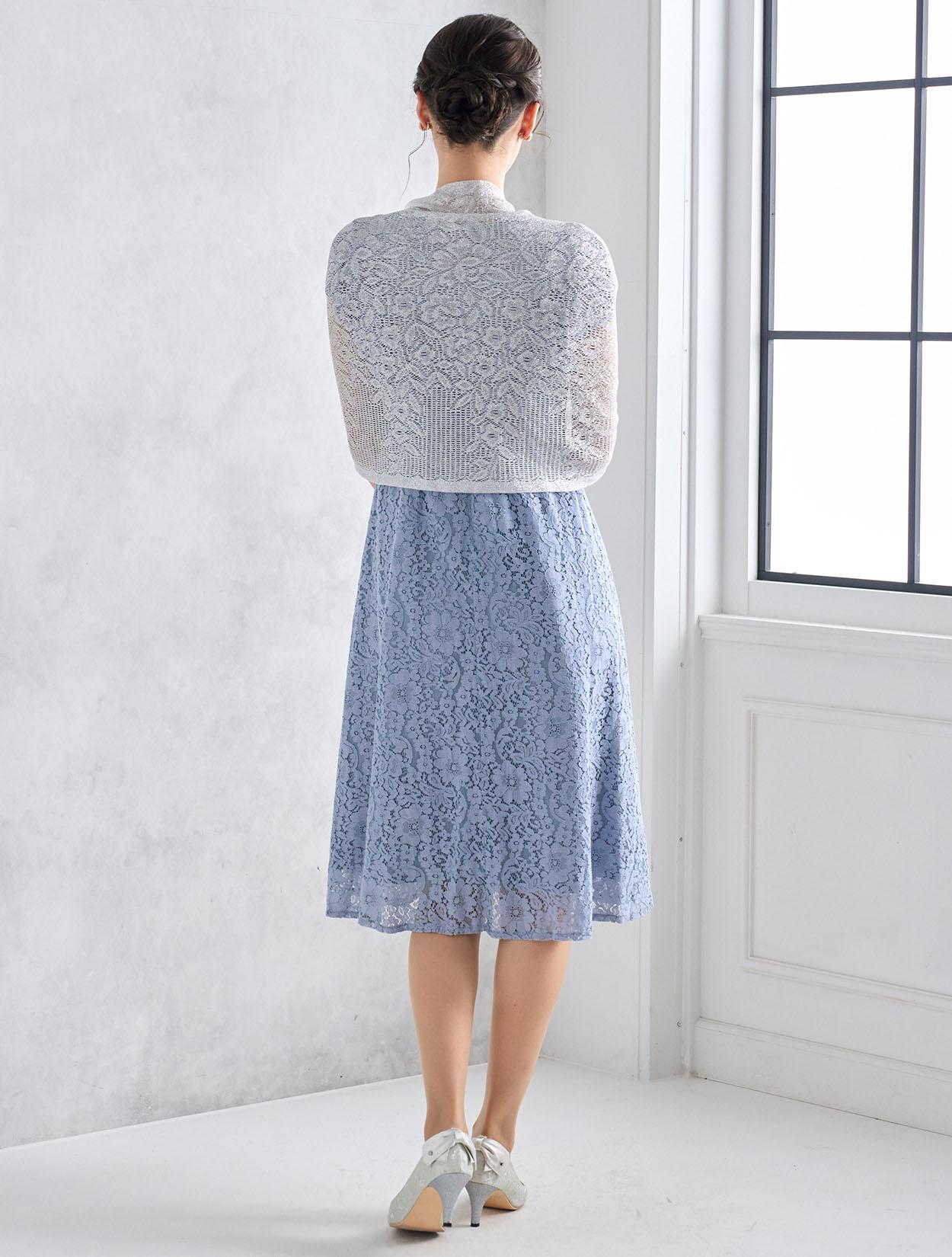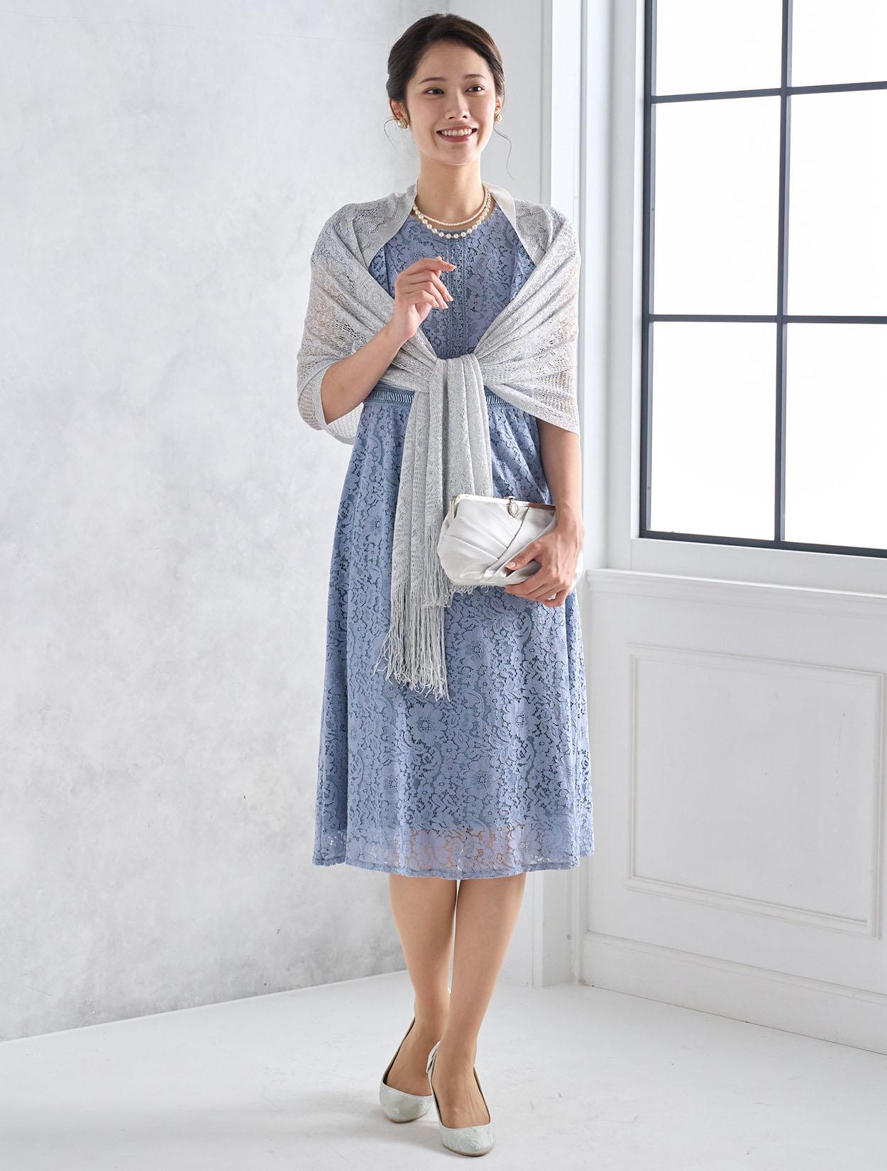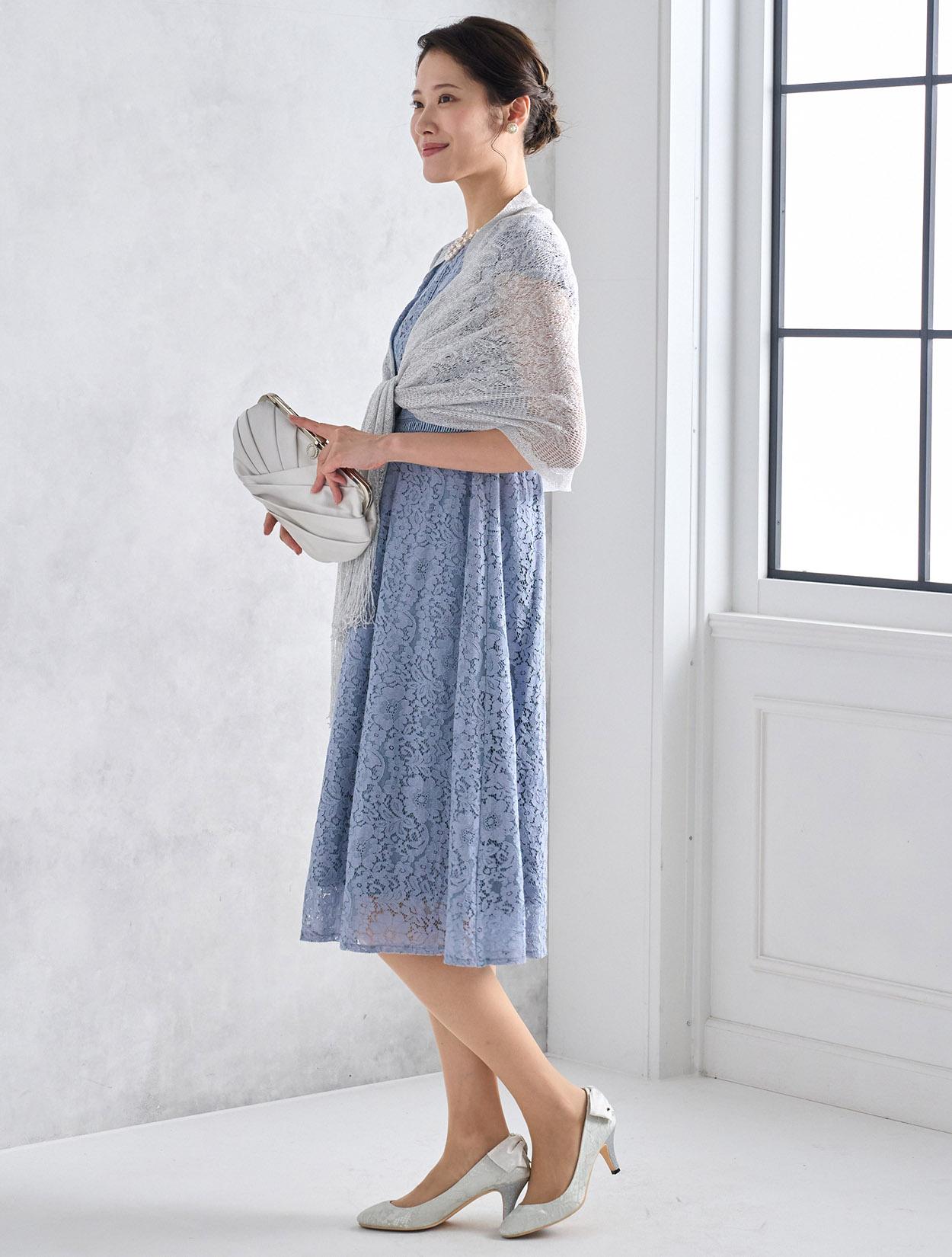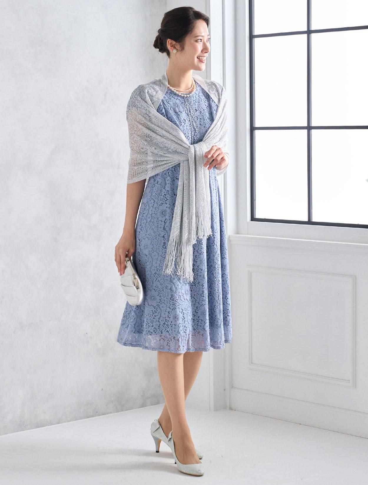 シルバーのショールが総レースのドレスに大人っぽさをプラス。可愛さもありながらスッキリとした印象の着こなしになります。