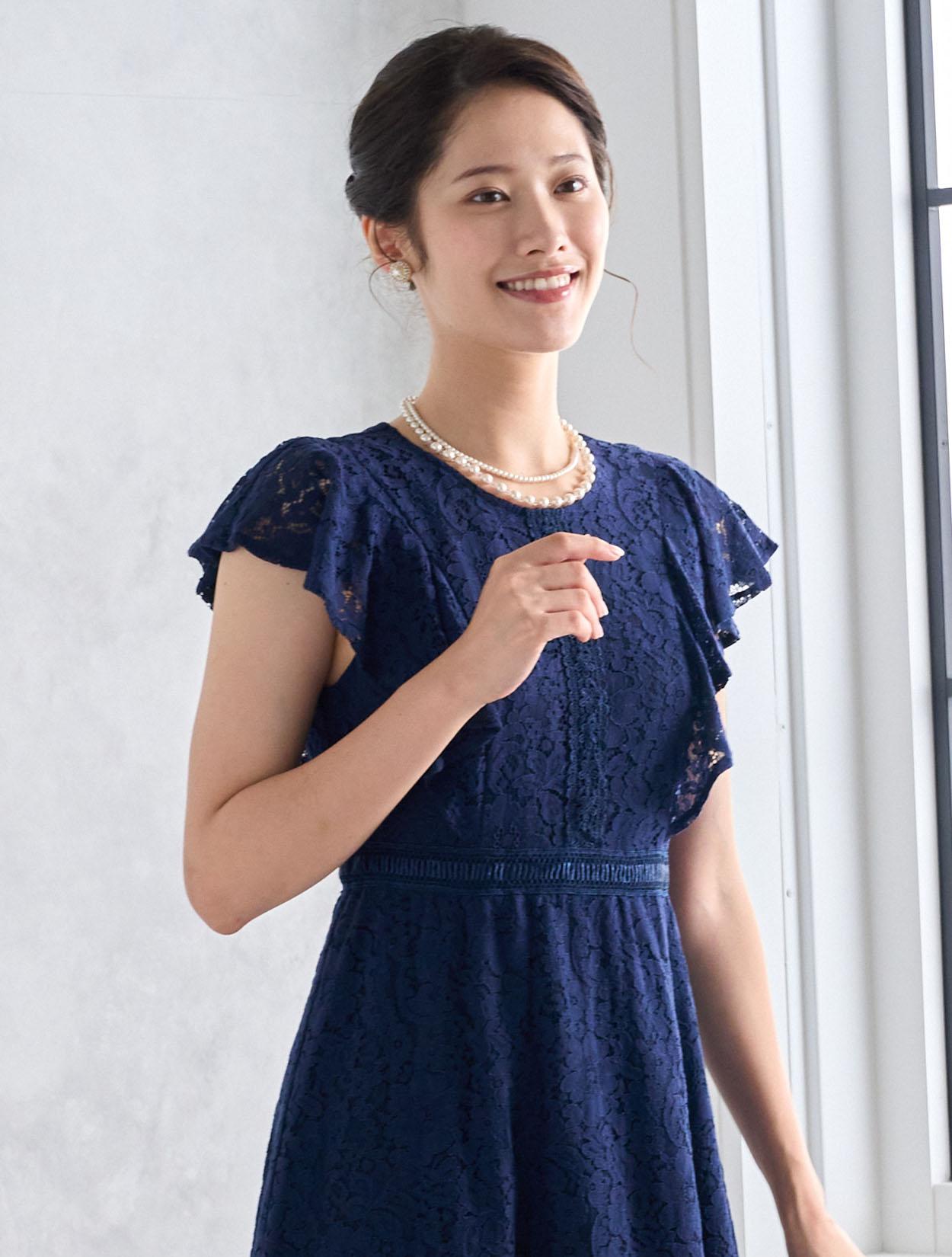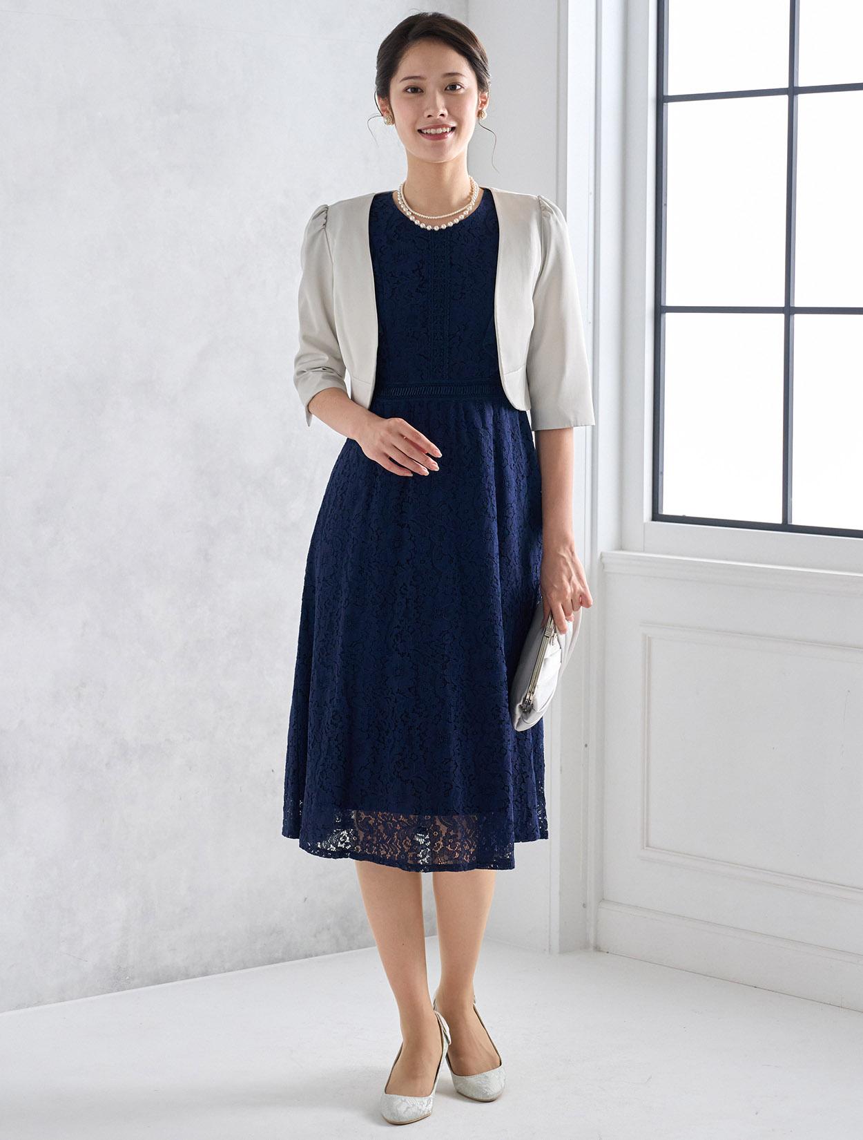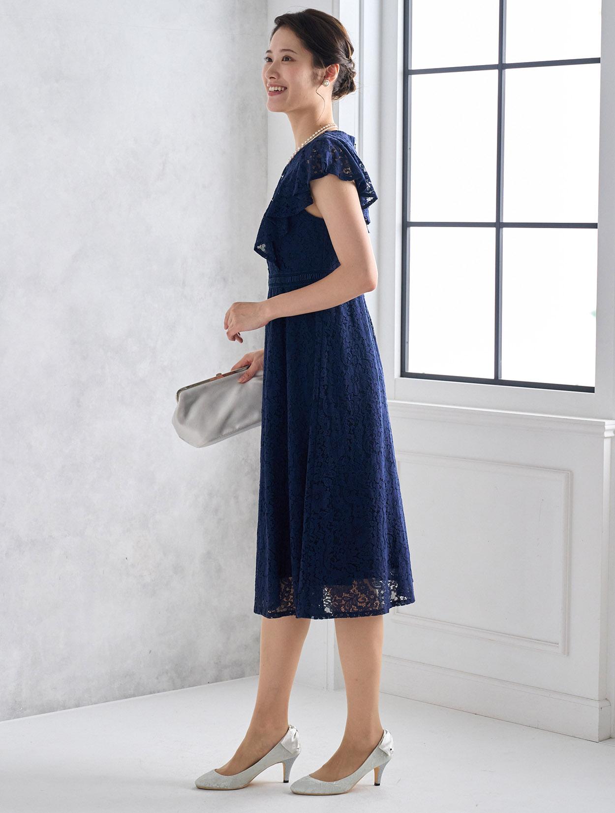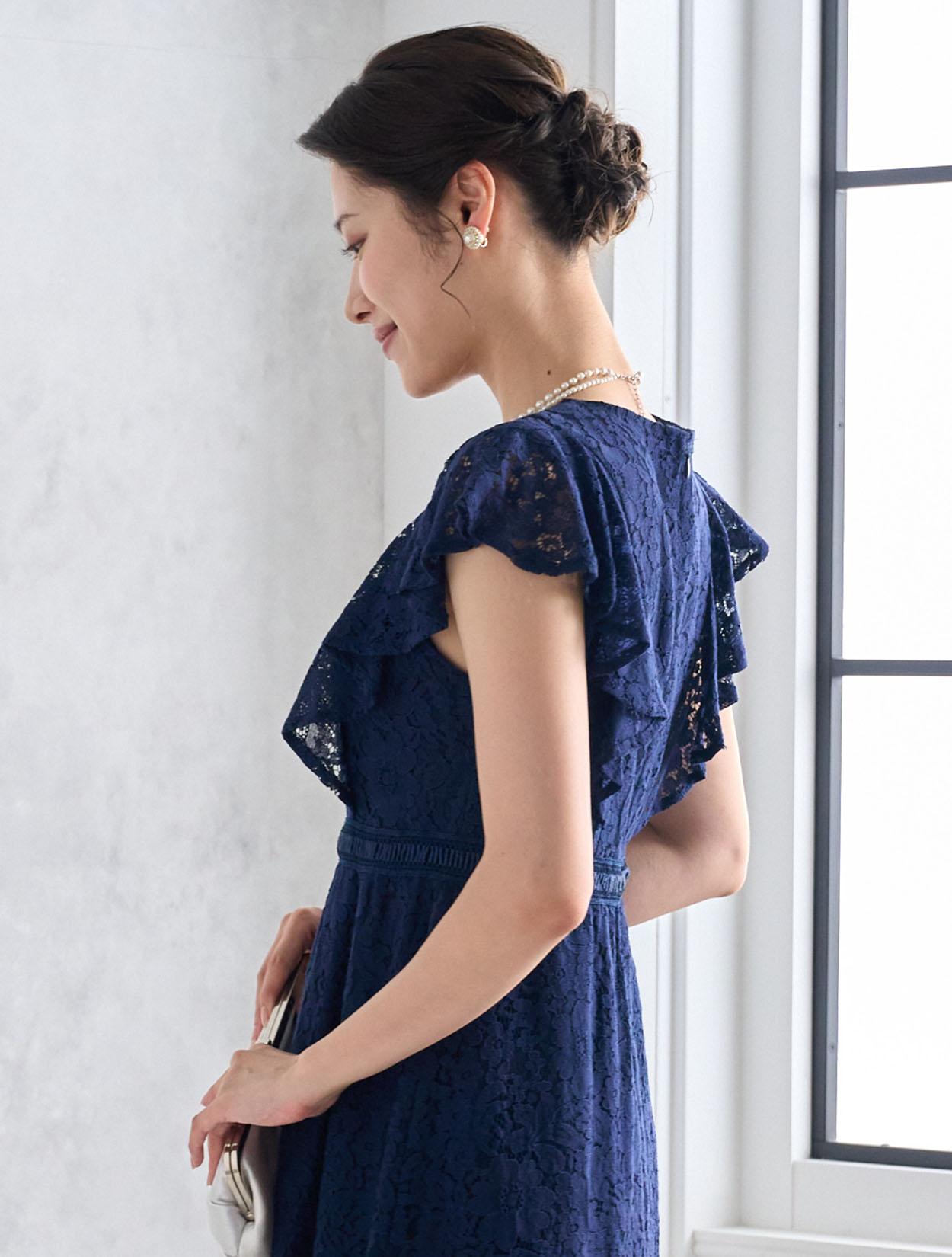 濃紺のネイビーが上品で落ち着いた印象のドレス。総レースと合わさるとダークネイビーでも暗くなりすぎないので、どんな立場でも安心して着られます。どんな肌色でも合いやすいのもネイビーの嬉しいポイントです。