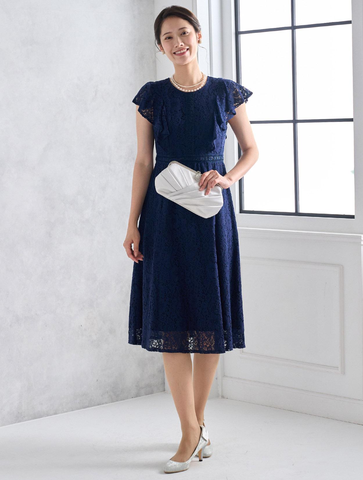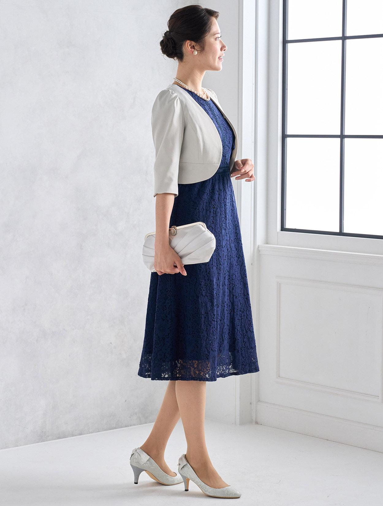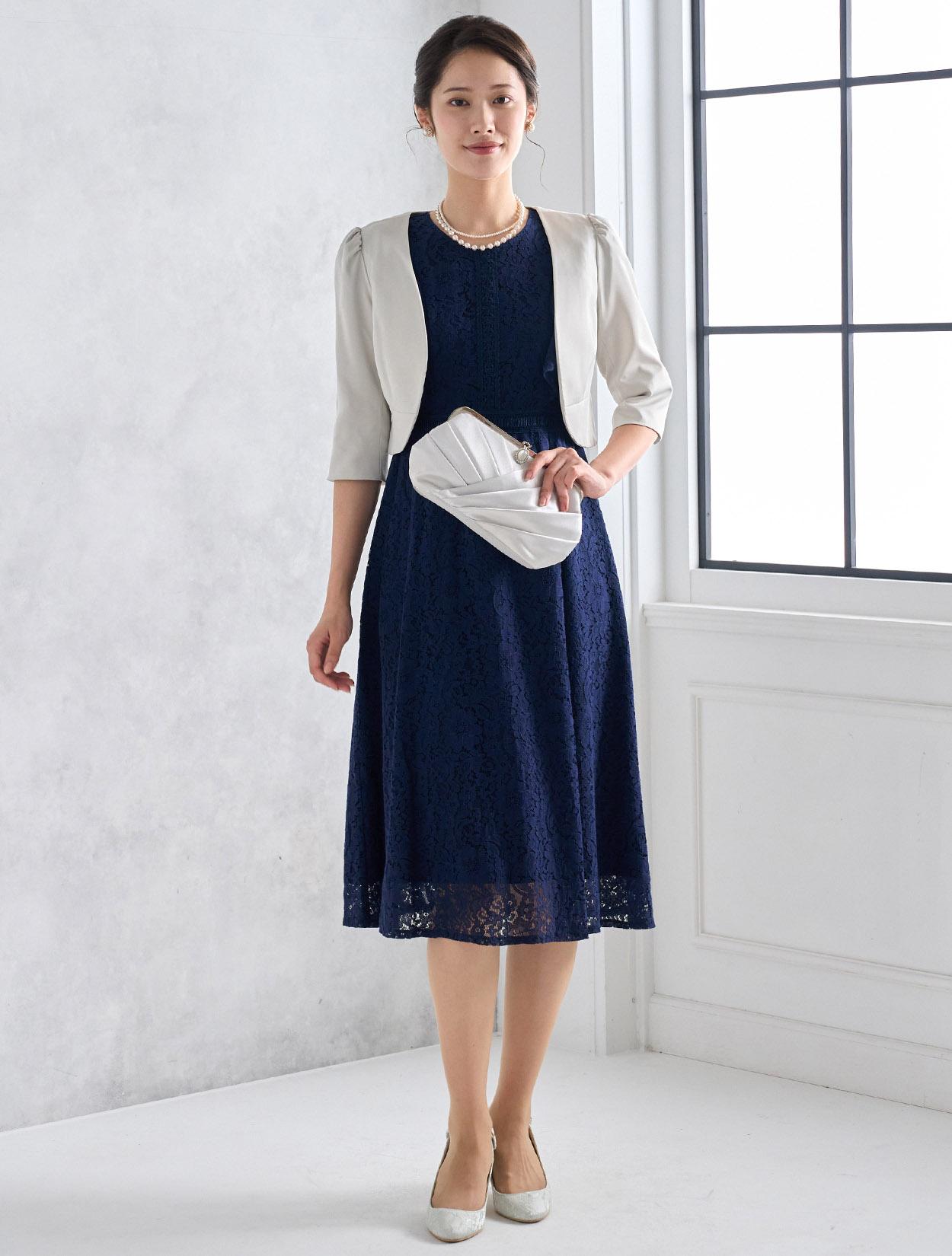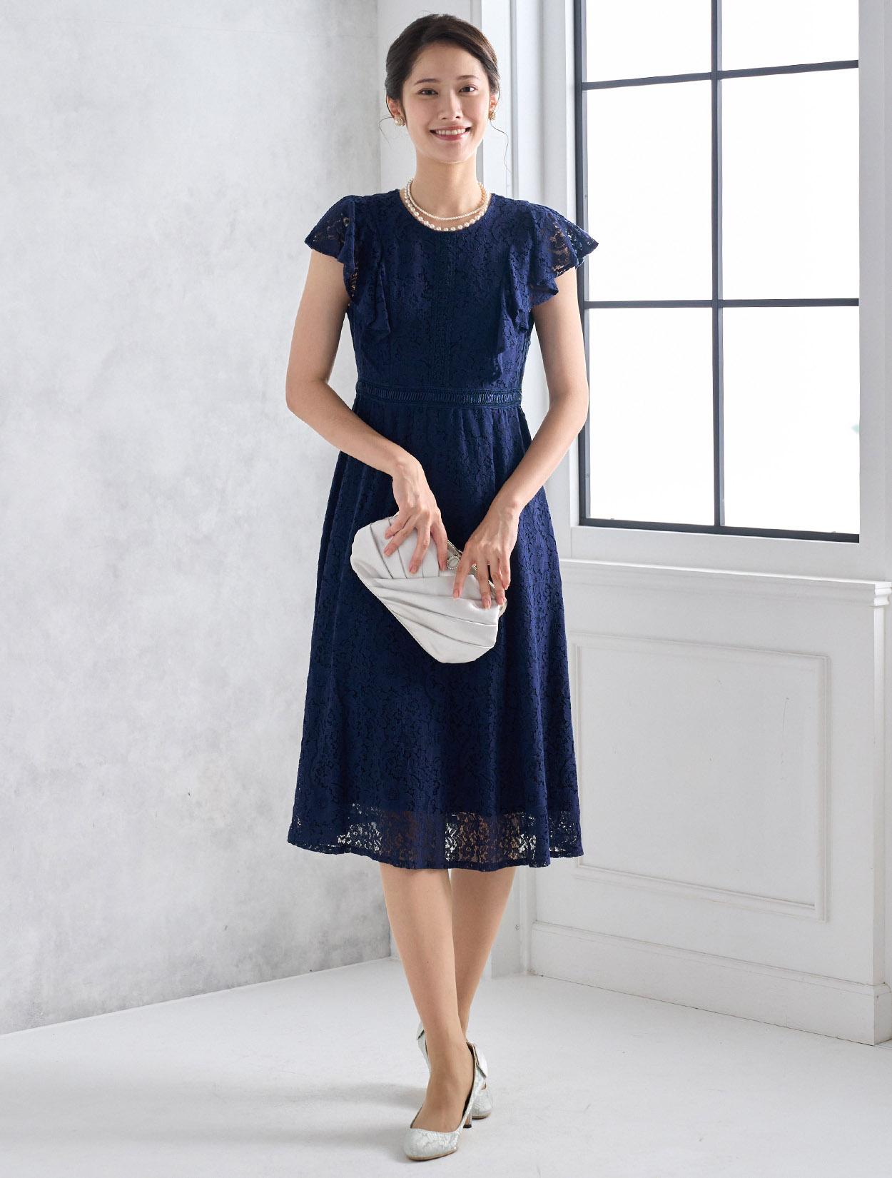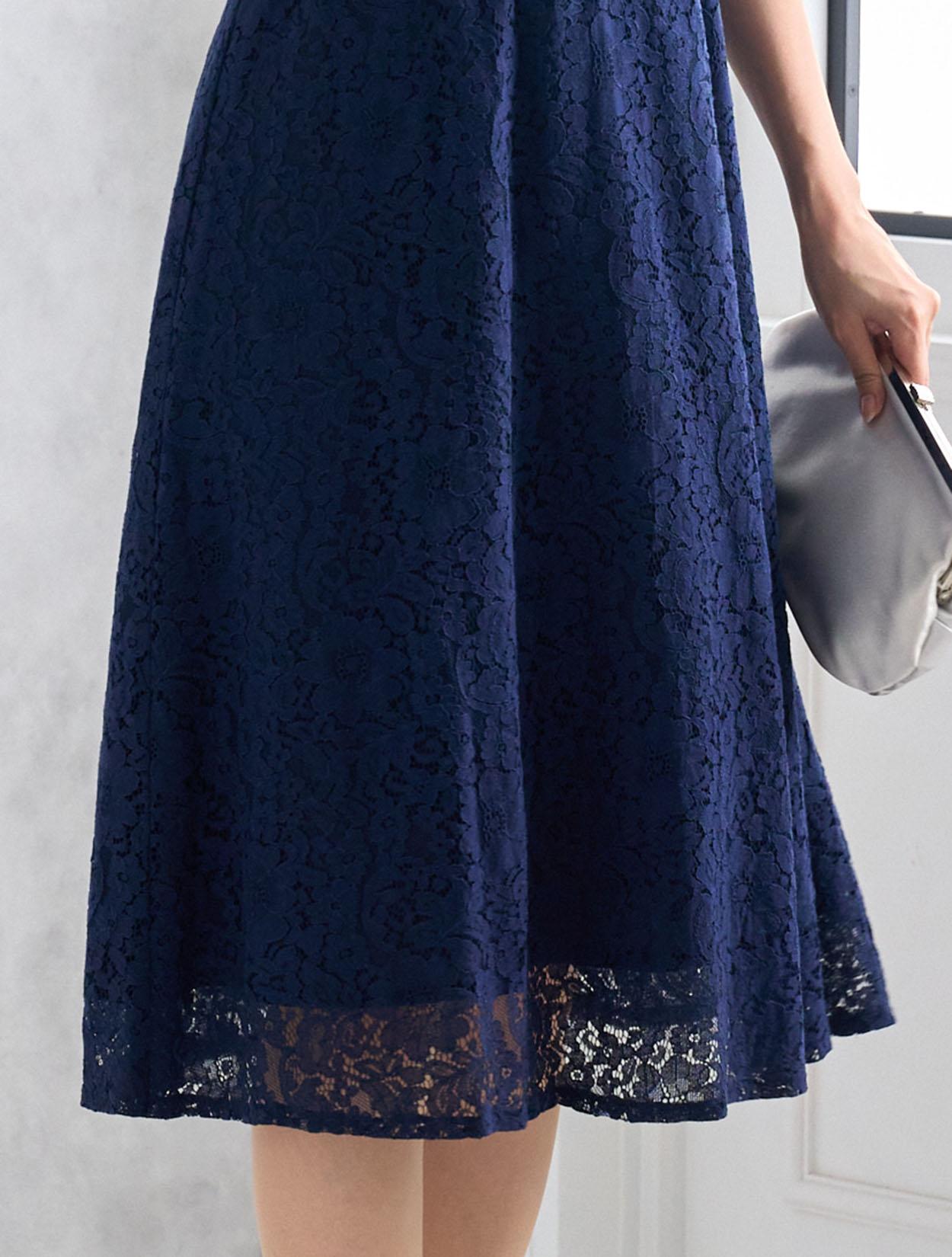濃紺のネイビーが上品で落ち着いた印象のドレス。総レースと合わさるとダークネイビーでも暗くなりすぎないので、どんな立場でも安心して着られます。どんな肌色でも合いやすいのもネイビーの嬉しいポイントです。