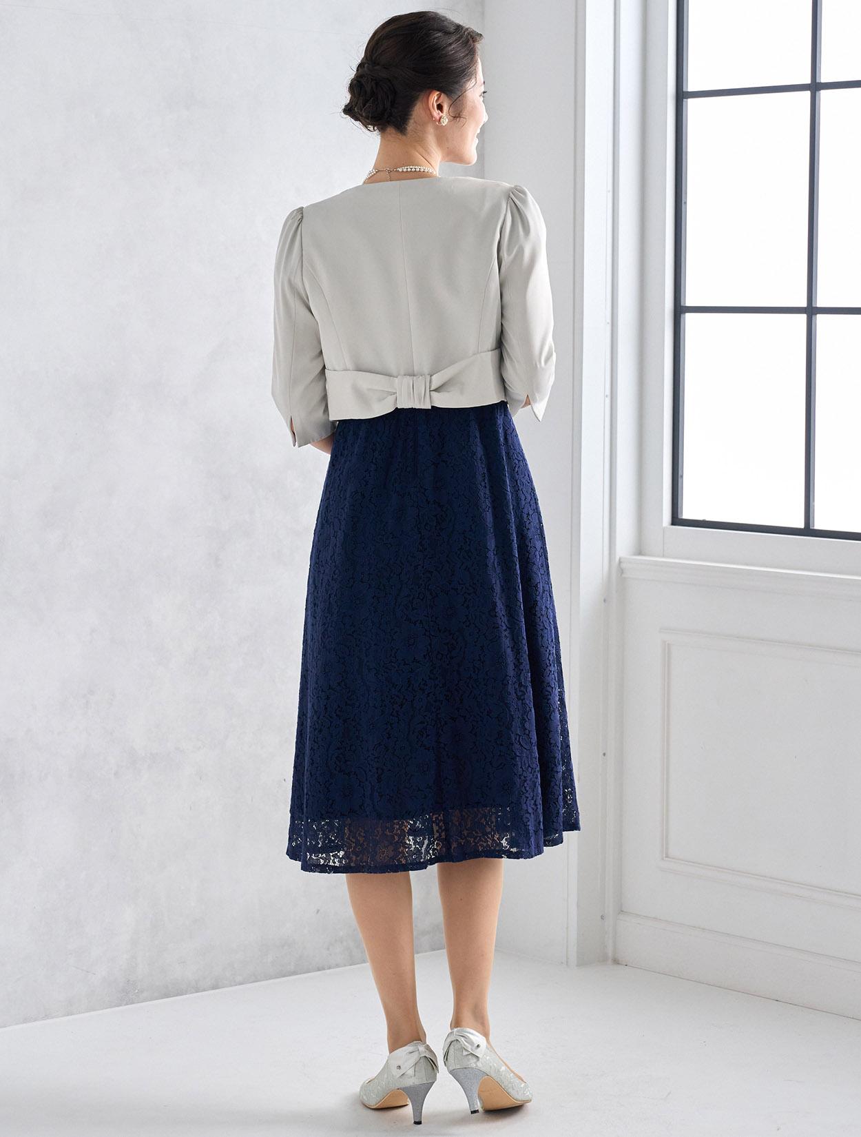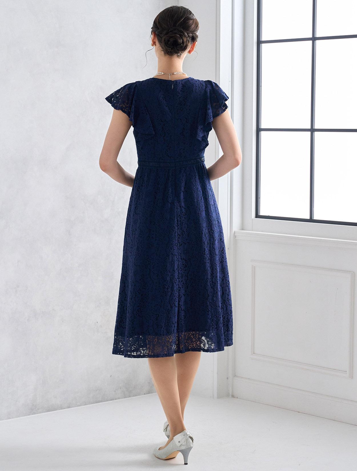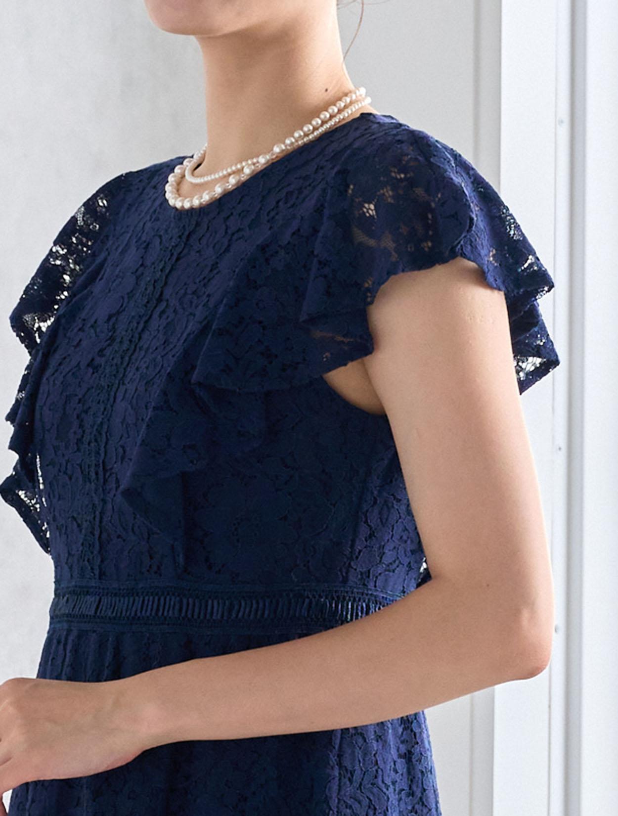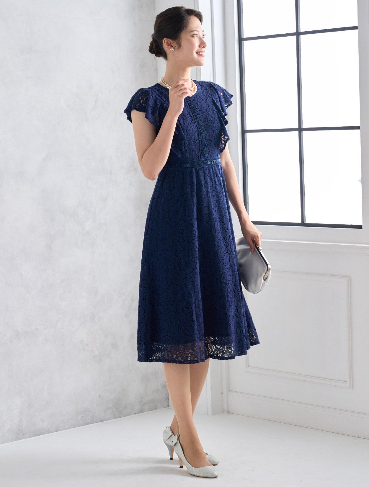 濃紺のネイビーが上品で落ち着いた印象のドレス。総レースと合わさるとダークネイビーでも暗くなりすぎないので、どんな立場でも安心して着られます。どんな肌色でも合いやすいのもネイビーの嬉しいポイントです。
