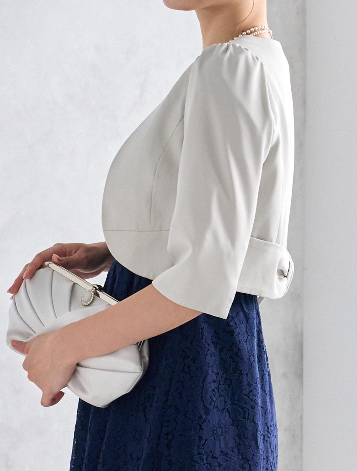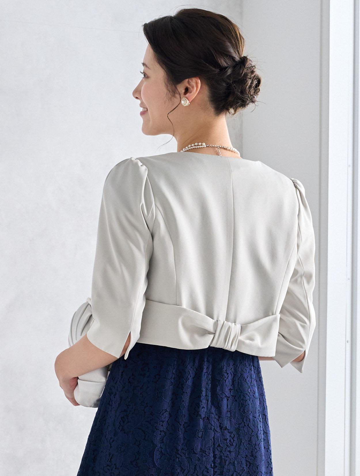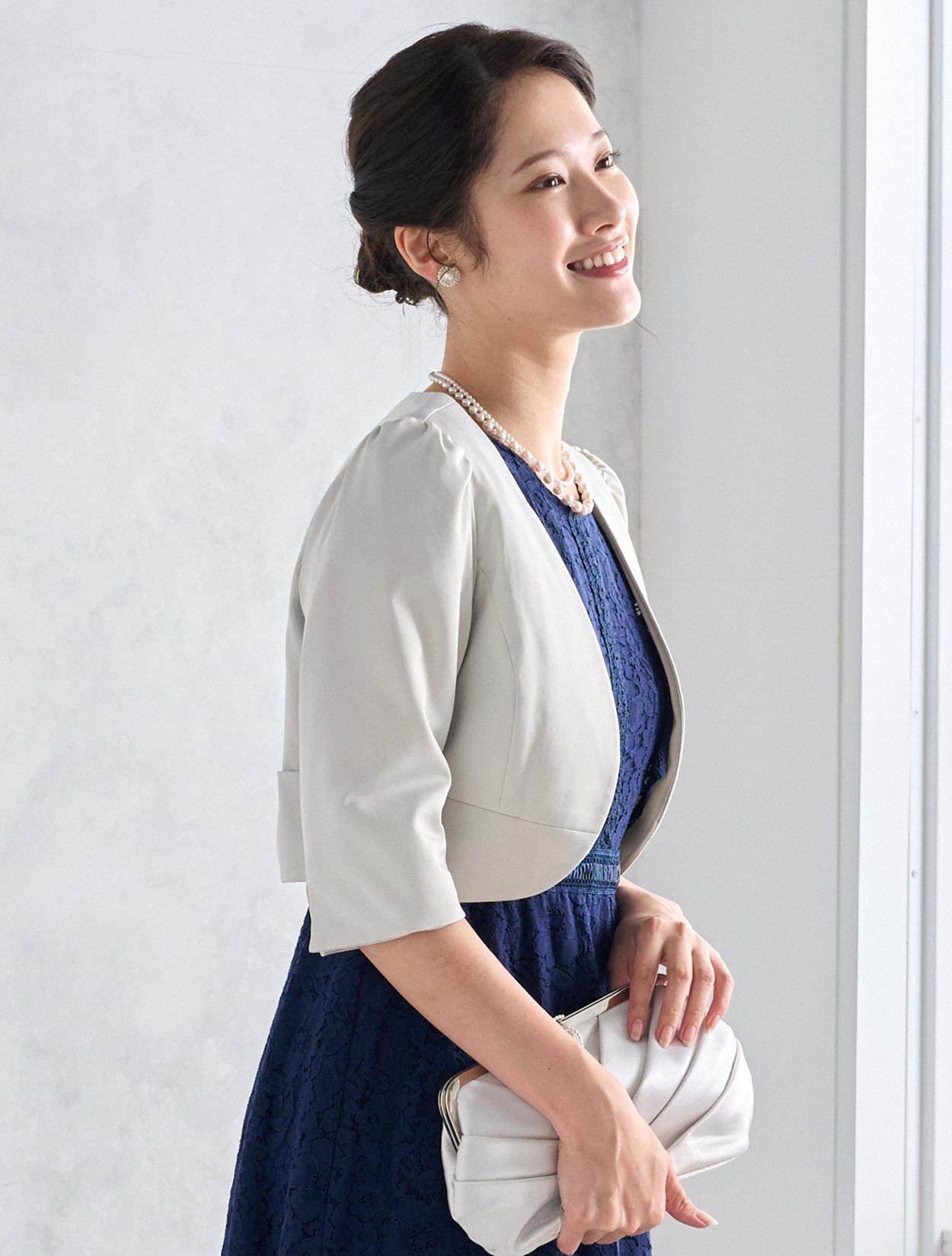 ライトグレーのジャケットがきちんと感のあるコーディネート。上品でシンプルなシルバーバッグは上品でジャケットコーデにぴったりです。ご親族ドレスとしてもおすすめです。