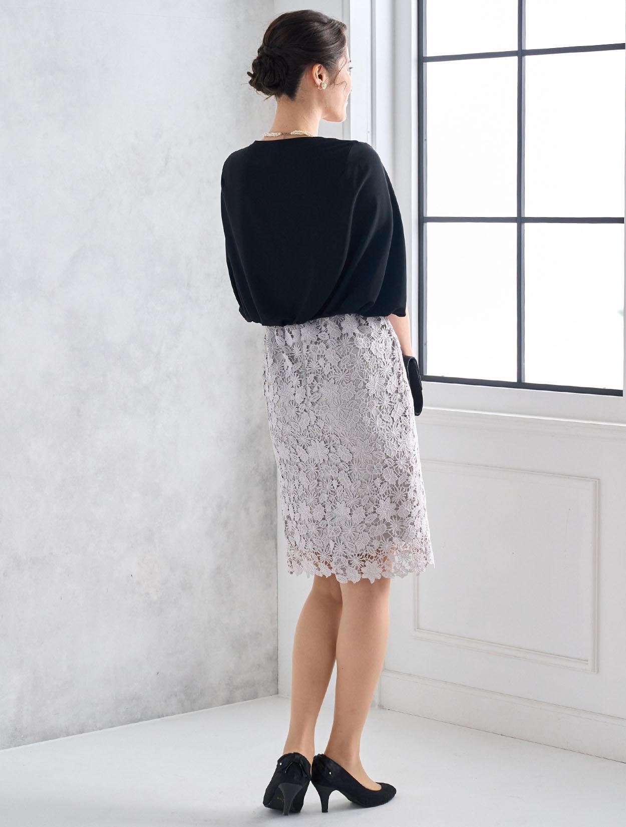 肩に入れたタックでカシュクールのようなVラインを作ったデザインは、上半身をすっきり見せてくれます。ウエストのクロスポイントや、広がらないタイトスカートは、全体をミニマルに着?せして見えるドレスです。大人っぽい印象のデザインですが、スカートに使われたレースがフェミニンさをプラスしてくれます。タイトドレスは周りと被りずらいのも嬉しいポイント。ビジューが付いた程よく開いた首元は、首が短いのが悩みの方でもネックレスなしでキレイに着こなせます。